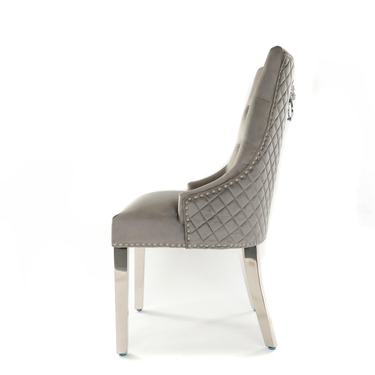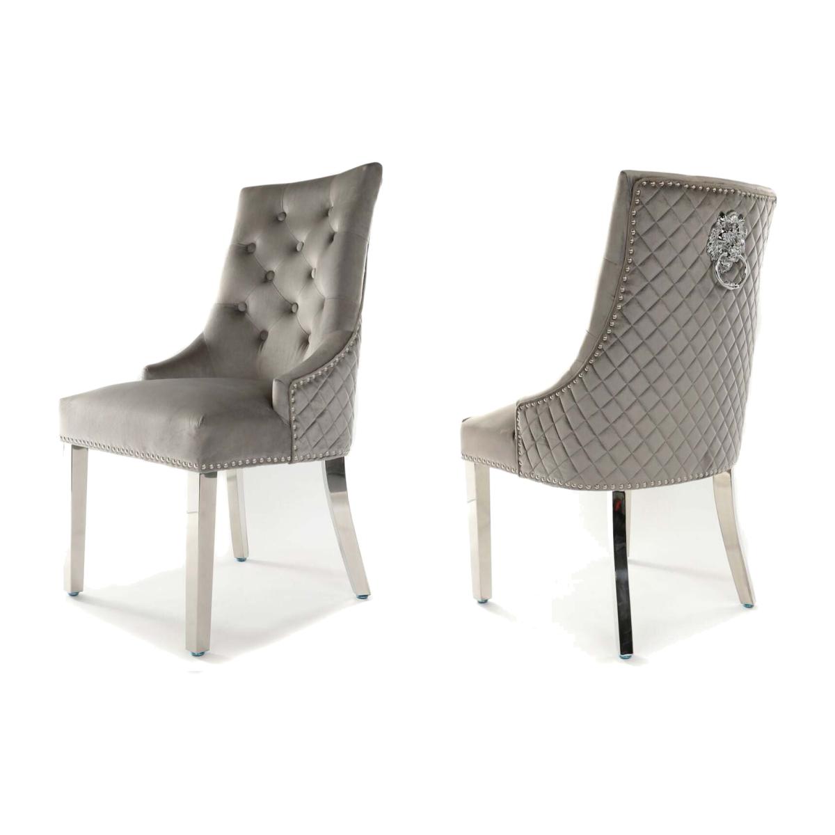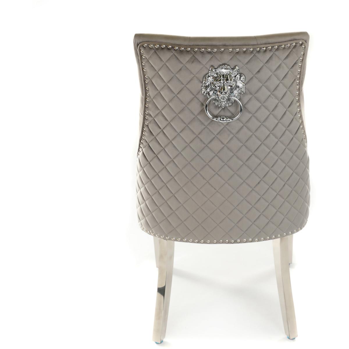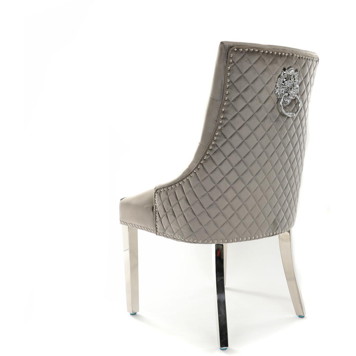 Upholstered in light grey velvet featuring diamond-stitched quilting to the rear with chrome lion head knocker and nailhead detail. A stunning premium quality chair that will work well as an individual dressing table accent or as a set for dining.