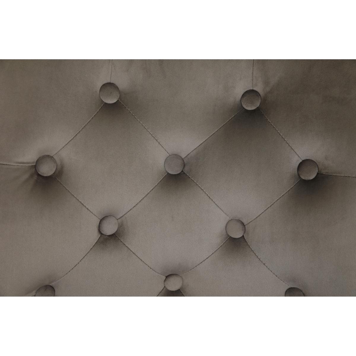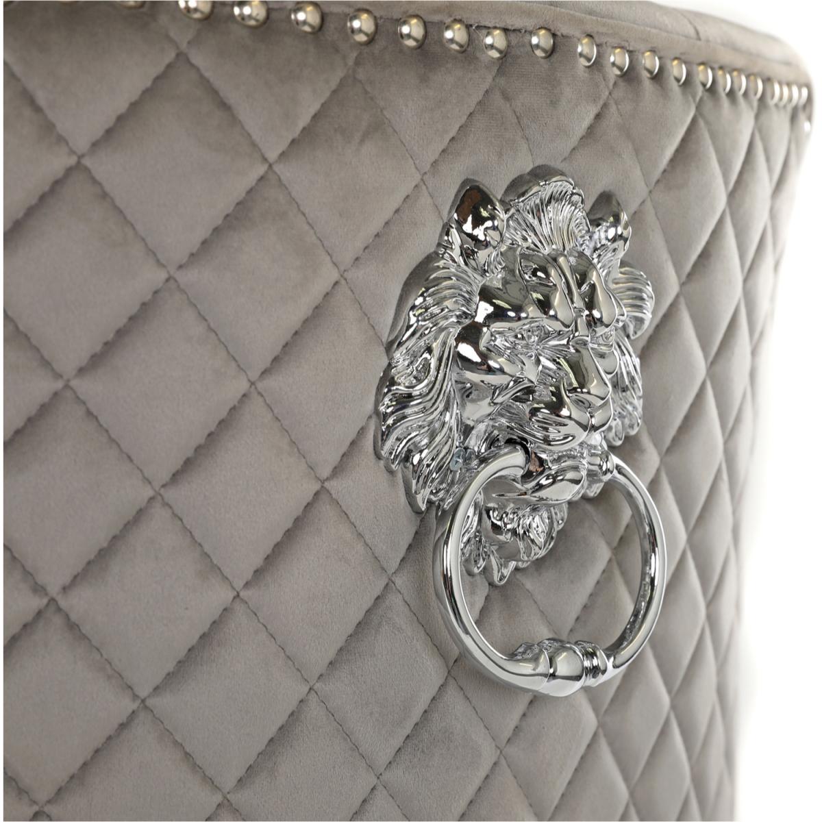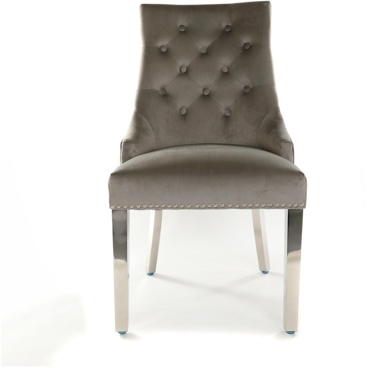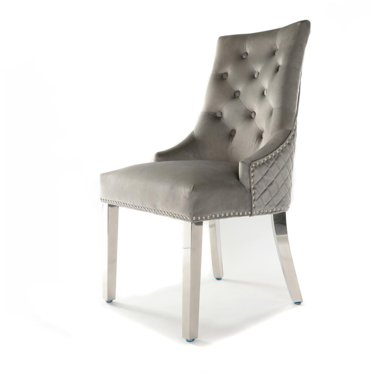Upholstered in light grey velvet featuring diamond-stitched quilting to the rear with chrome lion head knocker and nailhead detail. A stunning premium quality chair that will work well as an individual dressing table accent or as a set for dining.