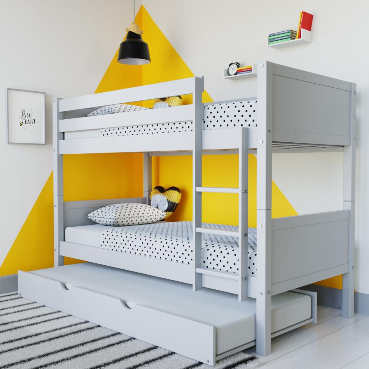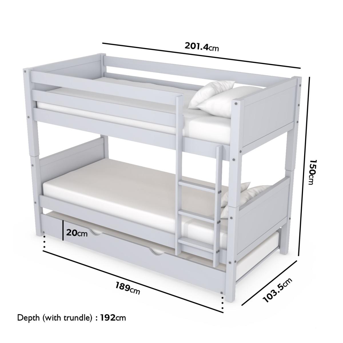 Light grey wooden bunk bed with pull-out trundle bed Built from solid pine with a durable painted finish Ladder can be attached to left or right side of bed Detachable bunk beds can be separated into 2 beds Trundle has integrated castors for a smooth transition Search 'Luca' to see other colours in the range Need to know Mattress size: Standard UK single (3ft) Max supported weight (per bunk): 80kg Max mattress depth: 20cm Weight: 81.1kg Colour: Light grey Finish: Painted Material: Solid pine wood and MDF Bed slats: Solid pine wood Mattress included: No Assembly required: Yes - minimal