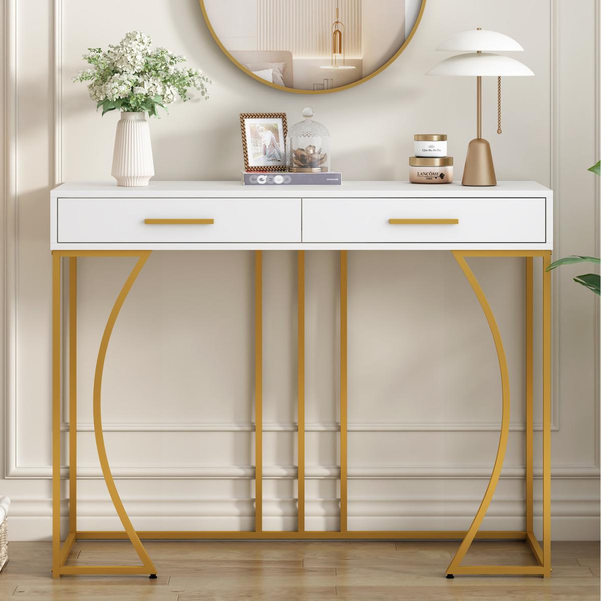 Bring elegance and practicality together with this light luxury console table. Crafted with a sleek white MDF top and supported by a uniquely curved gold metal frame, this table delivers a clean, modern look with a glamorous twist. Two spacious drawers with smooth glide rails provide discreet storage for keys, stationery, or daily essentials, while gold-plated handles add a refined, luxurious accent. Whether placed in the hallway, living room, or bedroom, the adjustable feet ensure stability and floor protection, making it as functional as it is stylish.