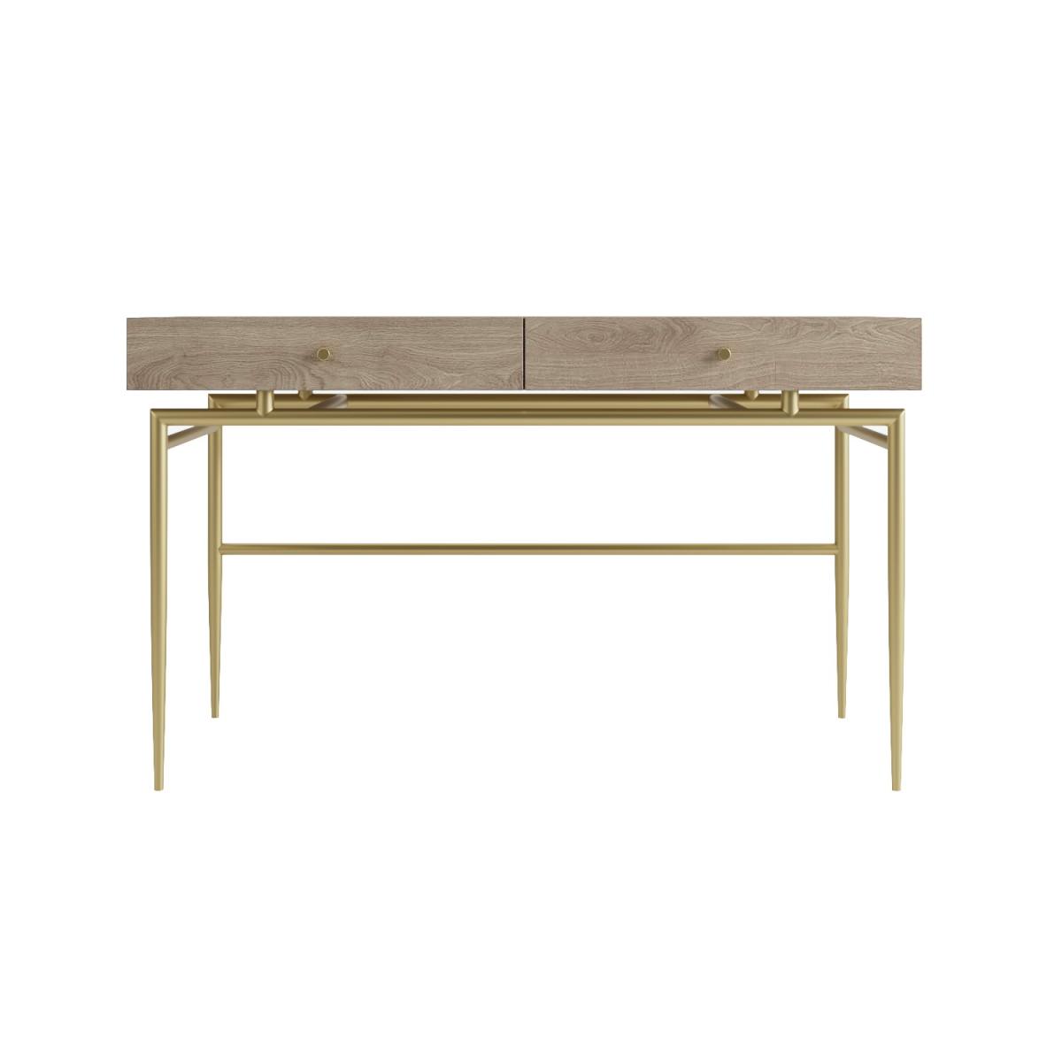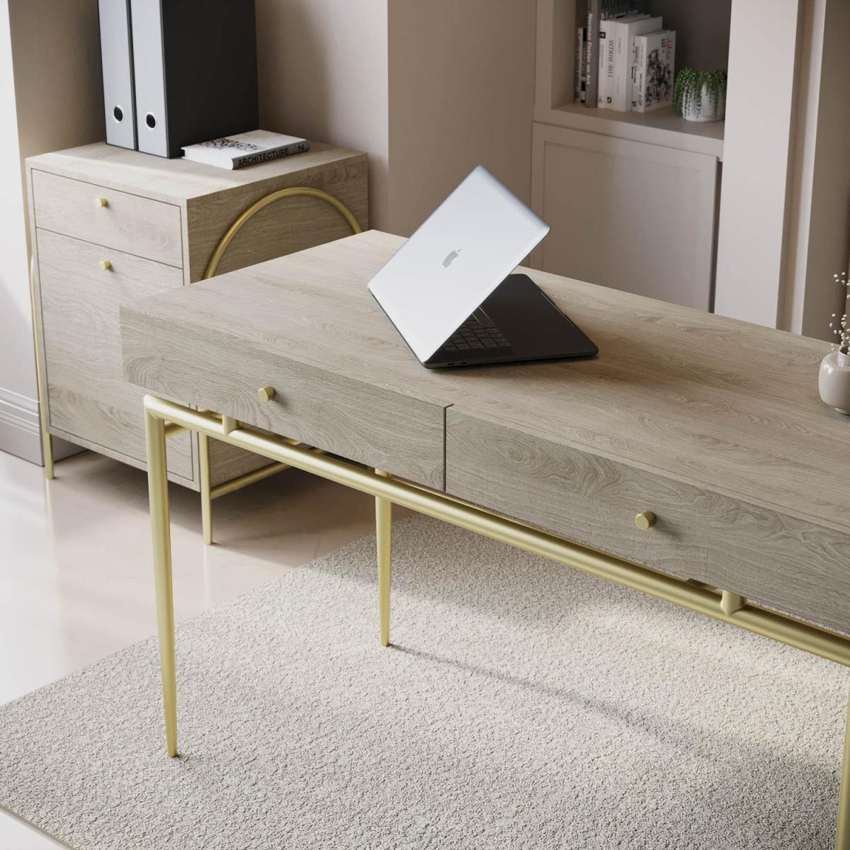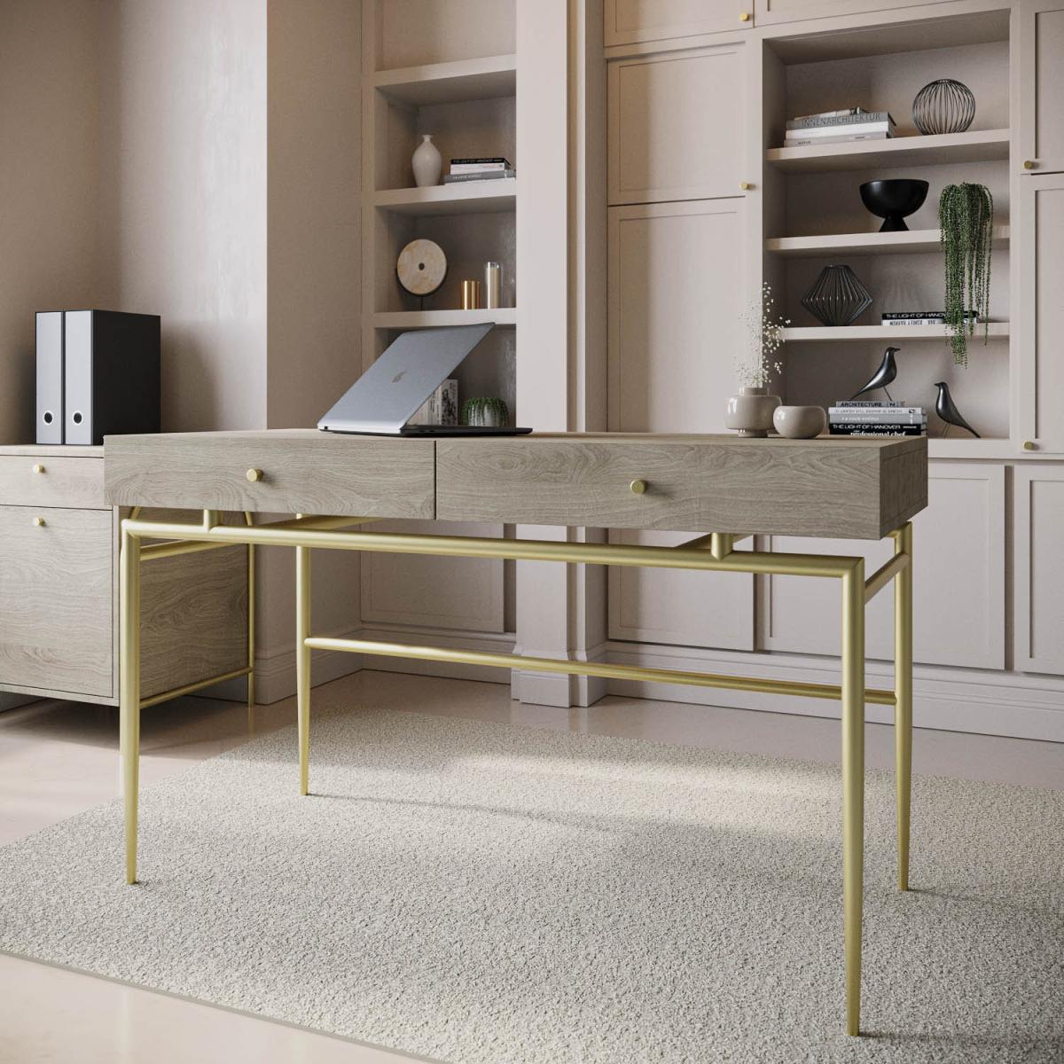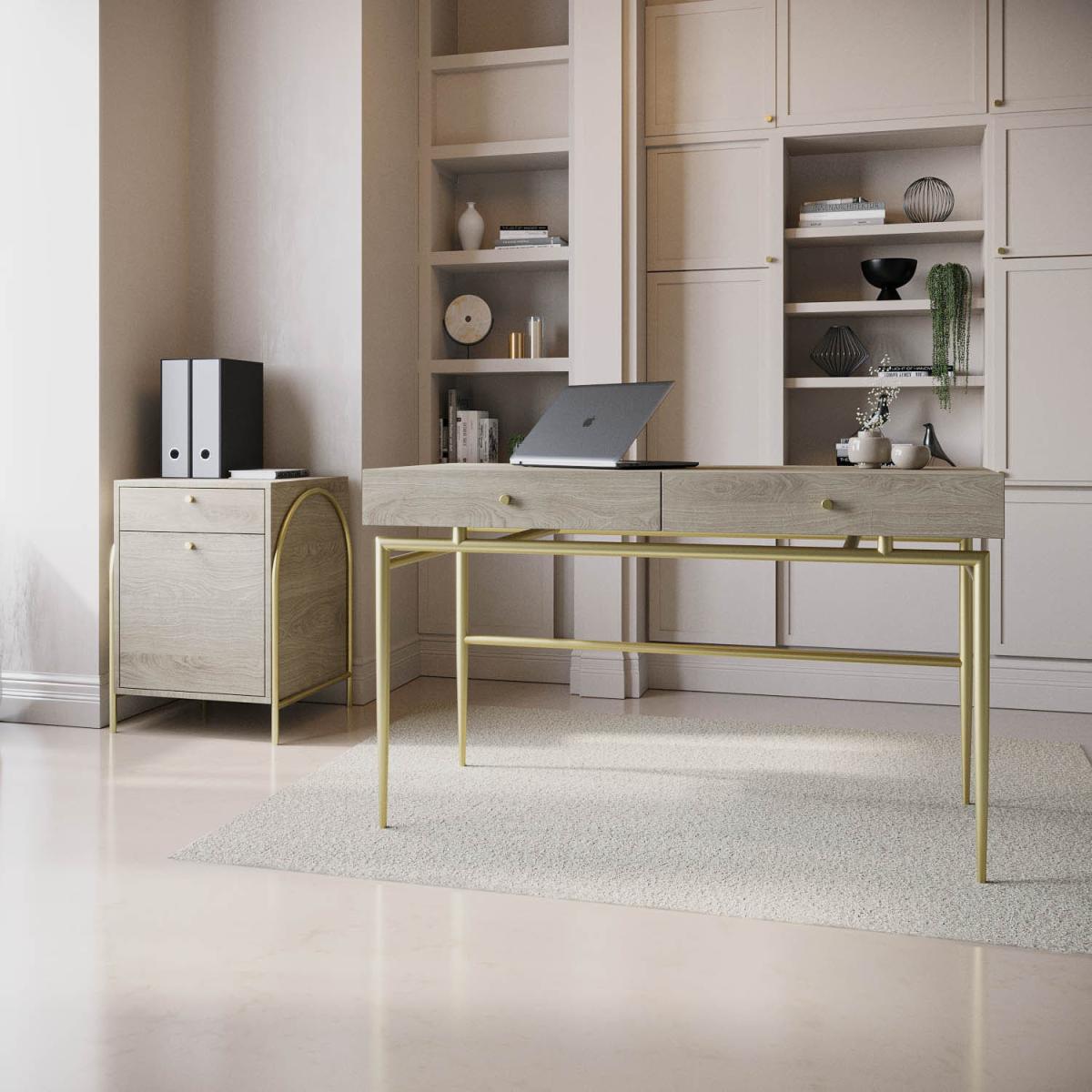 All about me Work in style on this large Chester office desk. The metal frame ensures a sturdy construction, plus the light oak and gold finish are a modern combination that'll update your home study or office instantly. Need to know Product dimensions: W130 x D56 x H78 cm Inner drawer dimensions:W57.2 x D28.2 x H6.5 cm Product weight: 31kg Number of drawers: 2 Colour: Natural and gold (handles & legs) Finish: Light oak Material: MDF and metal (handles, leg frame & drawer runners) Assembly required: Yes Packaging dimensions: W137 x D76 x H21 cm Packaging weights: 34kg