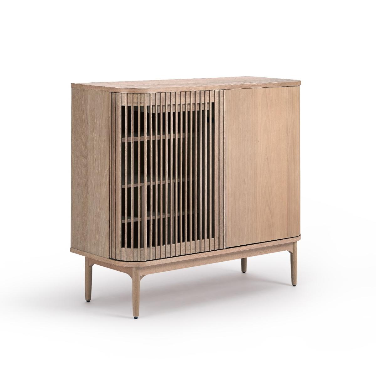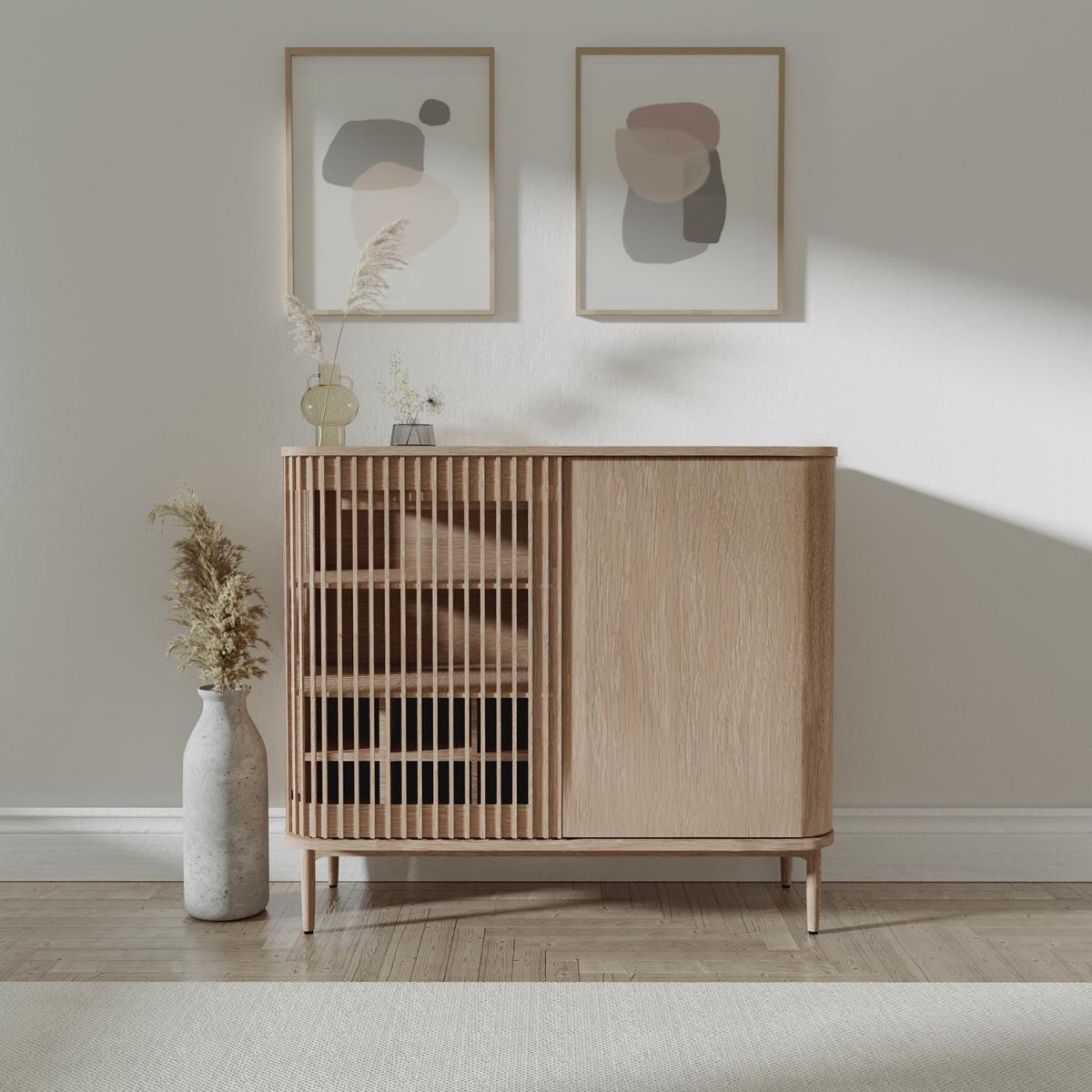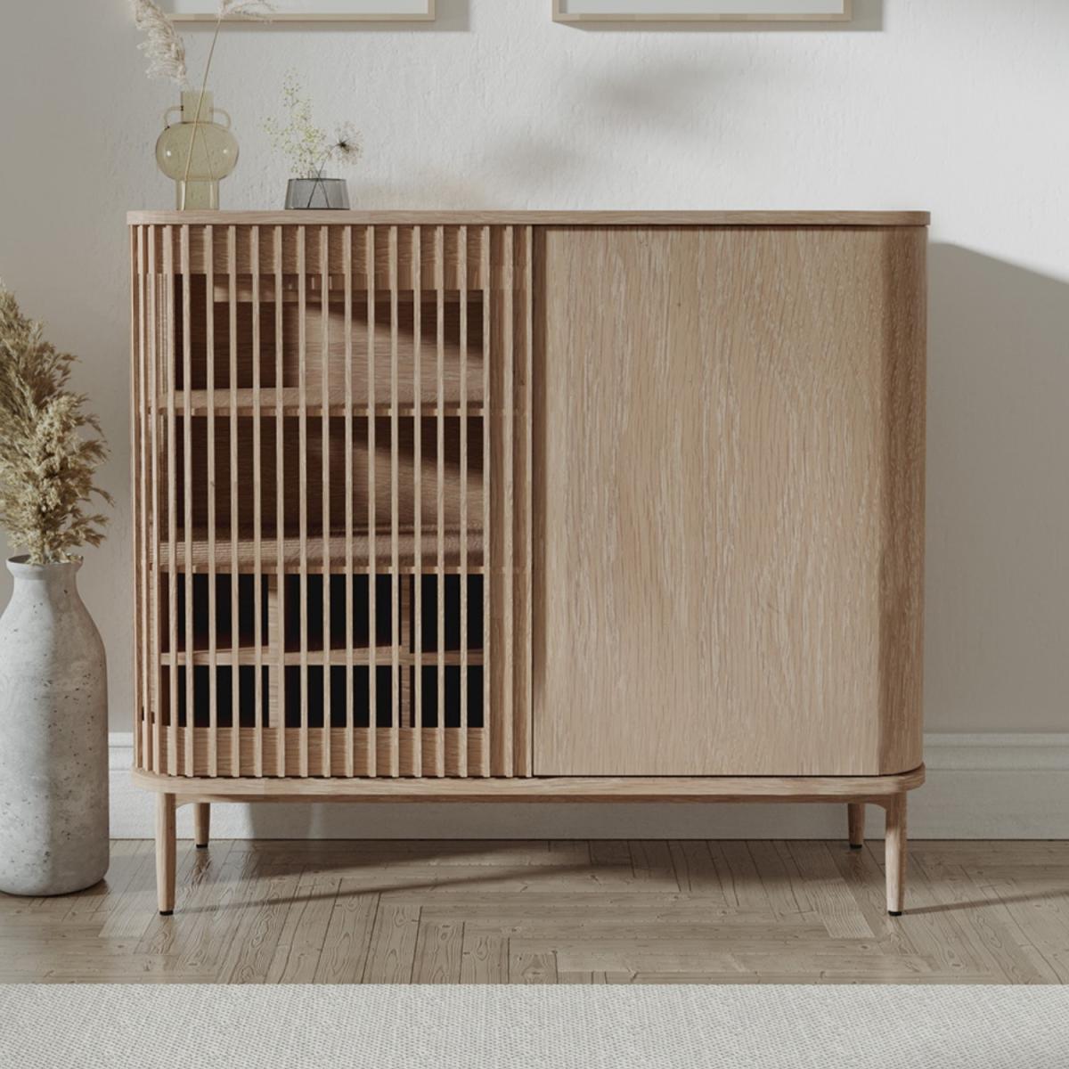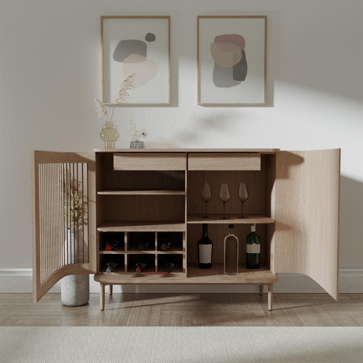 Add a touch of elegance to any room with this contemporary drinks cabinet which features a slatted design. Plenty of space to hold your entertainment needs and accessories. Made from oak veneer, oak door frames are finished in a limed lacquer while keeping the natural look from the oak grain.