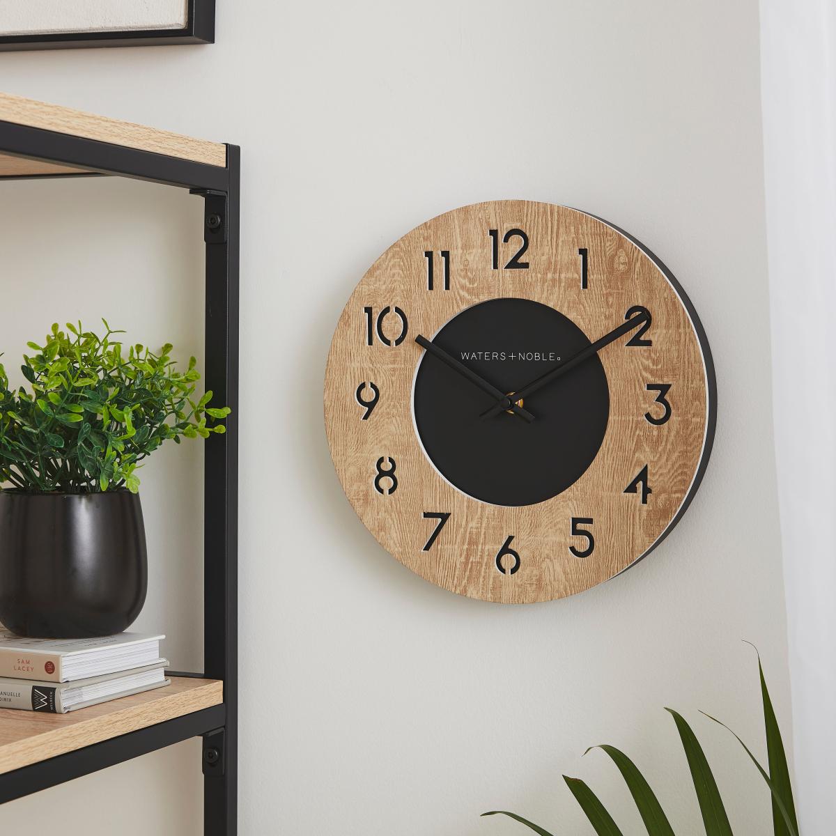 * Silent Movement* Contrasting Colourways* Features Recycled Material Boasting silent movement, the Light Oak Clock in Black is able to elevate the ambience of any room. A modern-industrial design, the clock's frame and backing is comprised of 90% post-consumer recycled polystyrene and is complete with a contrasting, light oak effect and black colourway.