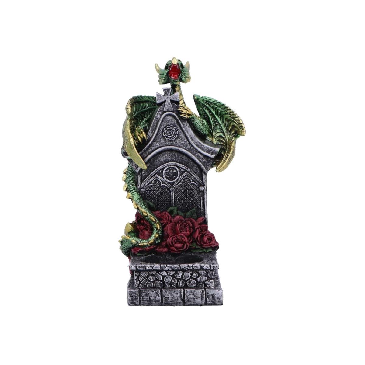 The Light of the Dragon is a beautifully crafted tea light holder featuring a dragon coiled around a grey stone tombstone base. The dragon has shimmering red scales with gold accents, and the dry-brushed stone finish adds a realistic touch. Roses are placed at the base for added detail. This tea light holder combines fantasy design with functionality, offering a unique decorative piece that creates a beautiful ambiance when lit.