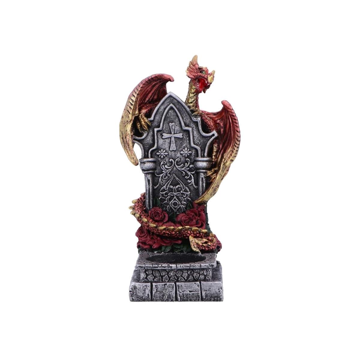 The Light of the Dragon is a beautifully crafted tea light holder featuring a dragon coiled around a grey stone tombstone base. The dragon has shimmering red scales with gold accents, and the dry-brushed stone finish adds a realistic touch. Roses are placed at the base for added detail. This tea light holder combines fantasy design with functionality, offering a unique decorative piece that creates a beautiful ambiance when lit.