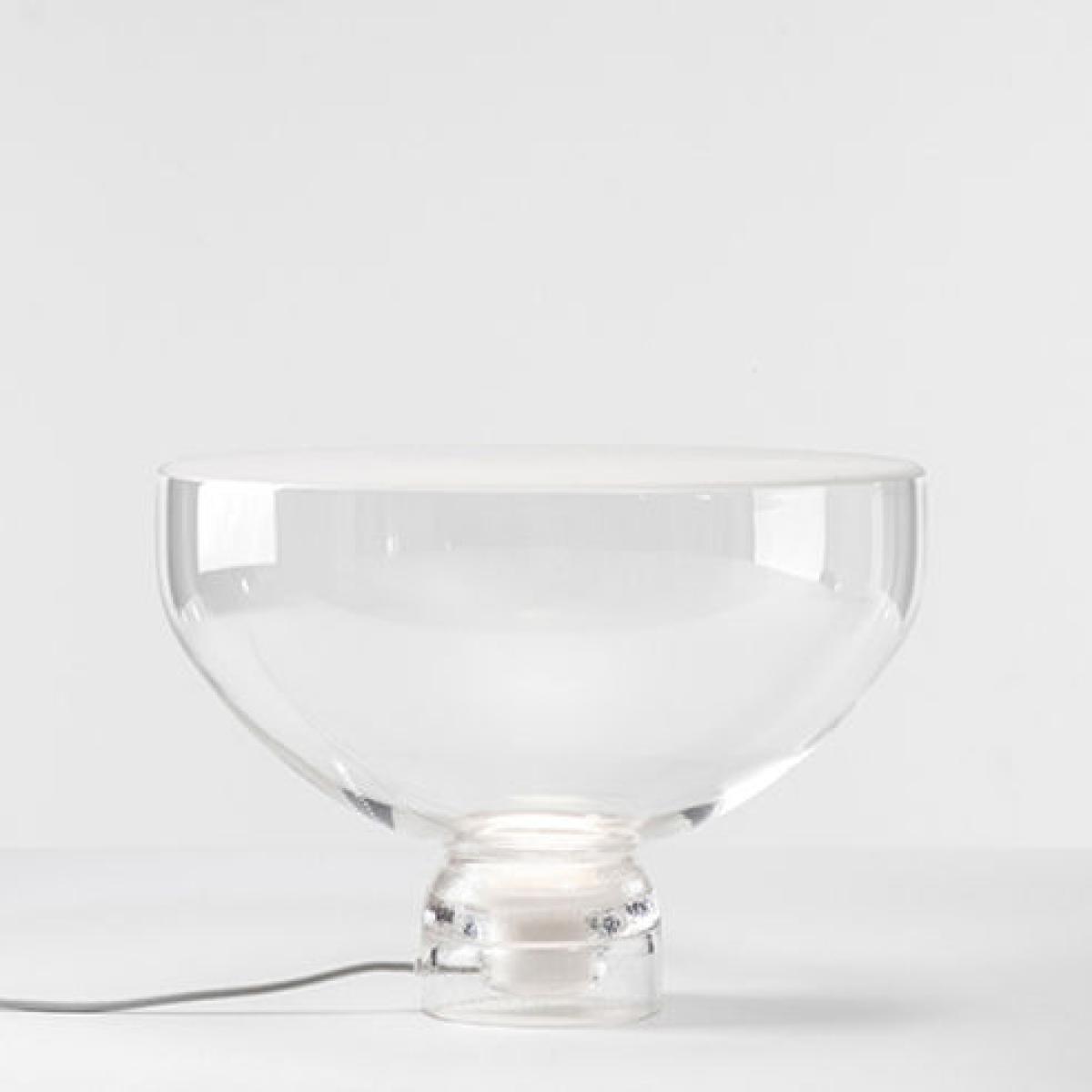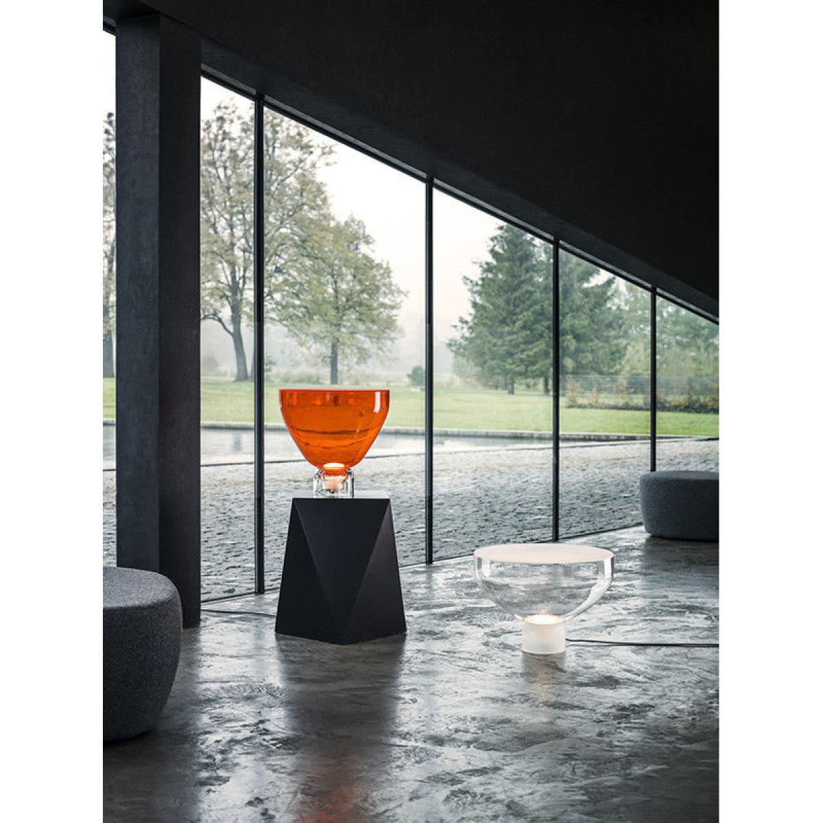 A wonderful chalice of light, Lightline is a beautiful example of highly-skilled glass craftsmanship: the lamp features a superb play on colour and transparency. Its silhouette is evocative of a precious cup or elegant vase. As pretty turned off as turned on, the Lightline lamp is a sculptural object that combines strong lines and ideal proportions. Lightline consists of a large, flared cup mounted on a round base: the two volumes created from glass are elegantly overlain, playing with a complicity of tones and textures (glossy and sandy glass). Its wide glass diffuser is closed off at the top with a sandy glass disc. The LED source is hidden in the base. When the light shines inside the glass dome, it casts an almost supernatural glow. The effect is magical: the light seems to come out of nowhere, the glass appears to light up from within. Within the glass bubble, the light is magnified, protected and sheltered. It emits a warm and vibrant light created by the different hues and shades of the glass.