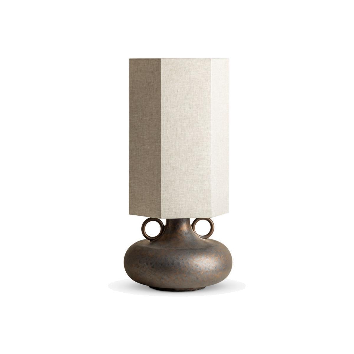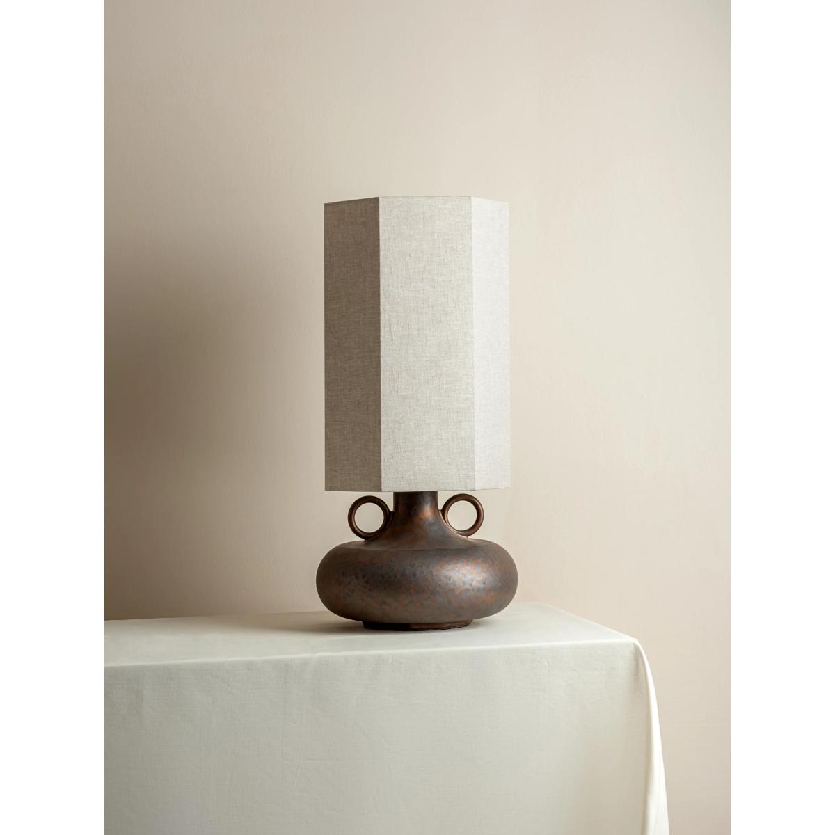 The nostalgic Grove table lamp is reminiscent of an antique chamberstick candle holder. The meticulously crafted ceramic base radiates vintage charm, whilst the structural hexagonal shade offers a contemporary edge to an otherwise traditional lamp.