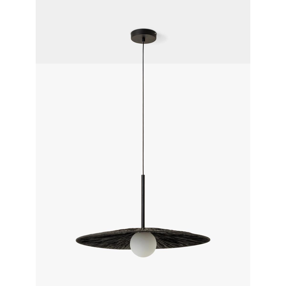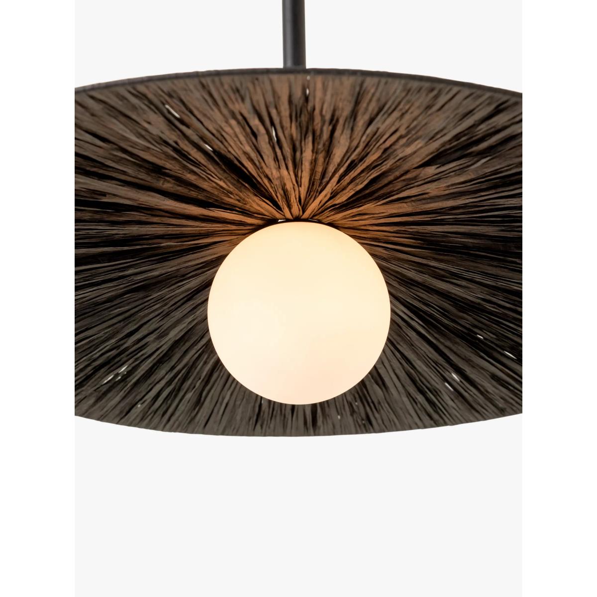Inspired by 1970s furniture design the retro Ridotti ceiling light is made with layers of hand woven raffia which create a textured oversized disc that diffuses light beautifully. The central opal glass globe creates a soft, ambient light that compliments the contrast between the textured raffia and the smooth stem. Great for hallways, bedrooms or over a dining table. Bulb not included.