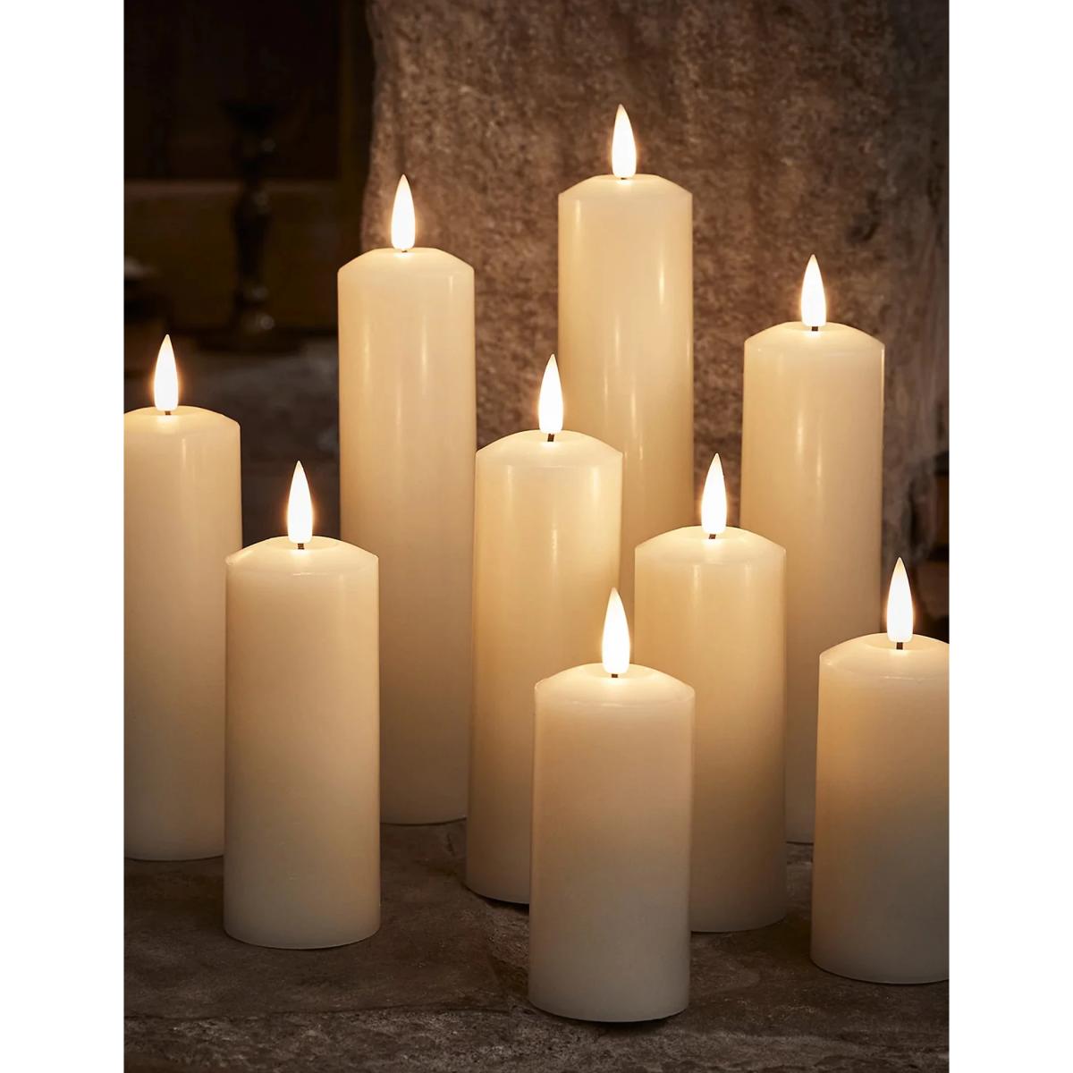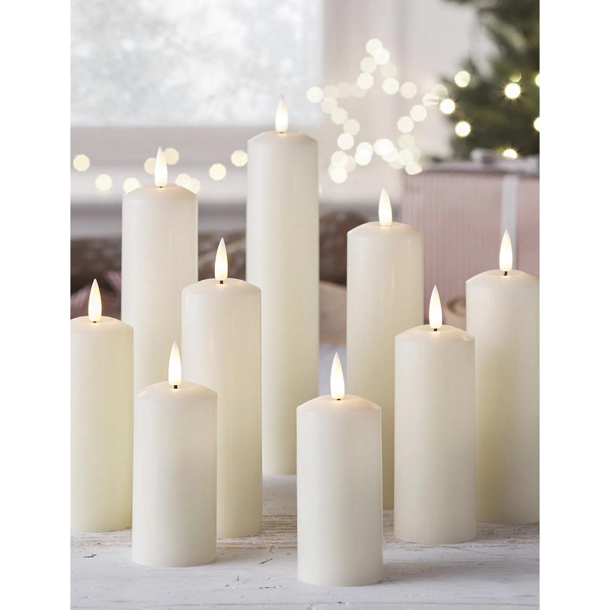 Bring the warm glow of flickering flames to every corner of your home or event with this set of nine light-up pillar candles from Lights4fun. Part of the brand's innovative Tru. Glow® range, these candles are crafted from poured wax for an authentic look and use LEDs for safety and convenience. A handy timer will automatically give you six hours of illumination each evening. This set requires batteries to provide up to 600 hours of realistic candlelight.