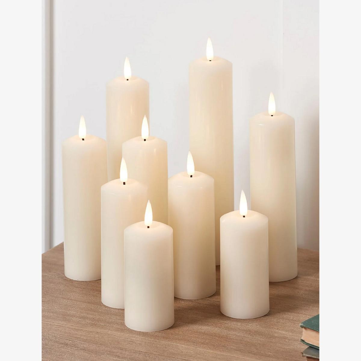 I love these candles - they offer a practical yet stylish solution for adding warmth and ambiance without the fuss of real flames. The set of 9 TruGlow slim pillars work particularly well in minimal or modern interiors, providing a subtle glow that’s perfect for sideboards, consoles, or even as table centrepieces. Their ivory tone is versatile and can effortlessly blend into neutral colour schemes, while the slim form allows for varied styling options, from clustered arrangements to layered displays. Practical tips include pairing them with a variety of candle holders or placing them on a mirrored tray for extra sophistication, and since they're battery-operated, you avoid the safety concerns of real flames while still achieving a cosy, inviting atmosphere.