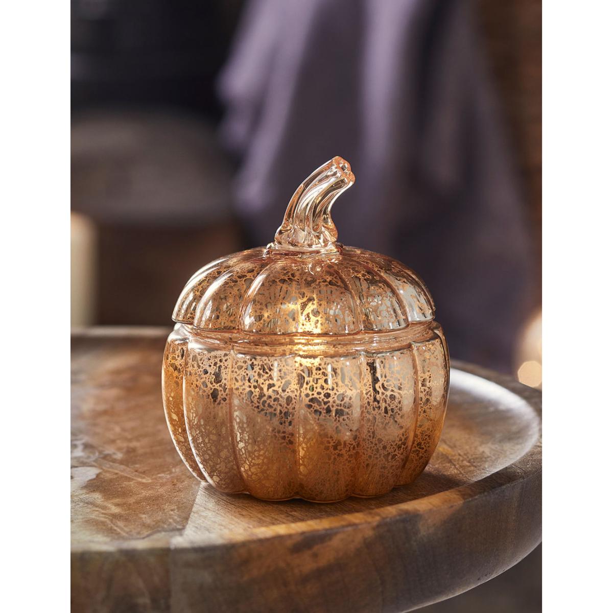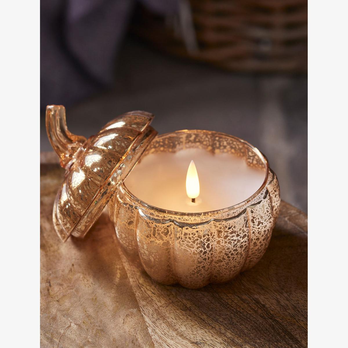 I love this glass pumpkin candle for its warm, metallic finish that adds a touch of seasonal charm without feeling overdone. It works particularly well in rustic, farmhouse, or modern interiors, providing a cosy glow that enhances rather than dominates. Practical styling tips include placing it on a mantlepiece, stacked on a tray with natural elements like pinecones or dried foliage, or using it as a centrepiece on a dining table for autumn gatherings. Its compact size and sophisticated bronze hue make it versatile and easy to incorporate into various settings, adding both ambience and a hint of festive elegance.
