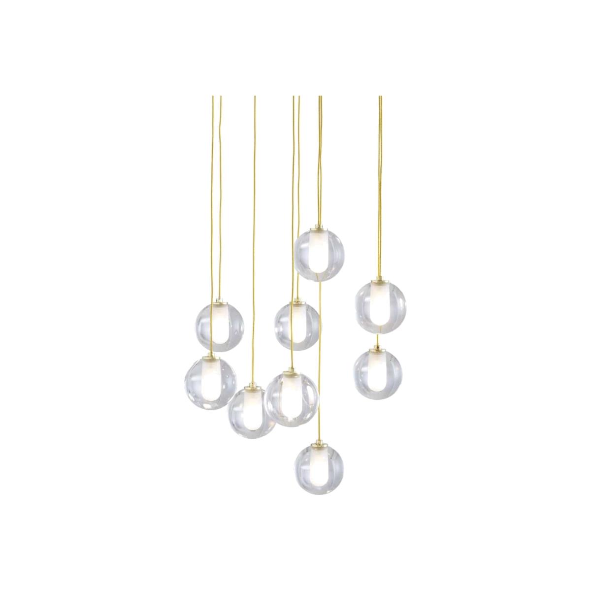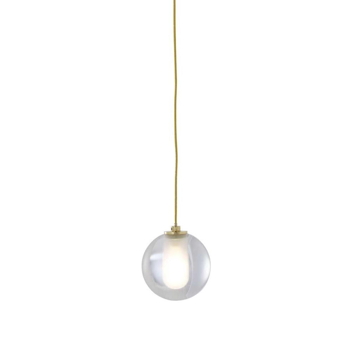 The Calot Pendant Light was designed by Patrick Zulauf and is produced by esteemed manufacturer Ligne Roset. The shade itself is crafted from transparent resin with a polished, sanded crevice to hold the bulb and is suspended from a long woven-metal cable in a brass finish. The design is completed with a refined epoxy lacquered ceiling rose in a satin-white finish.
