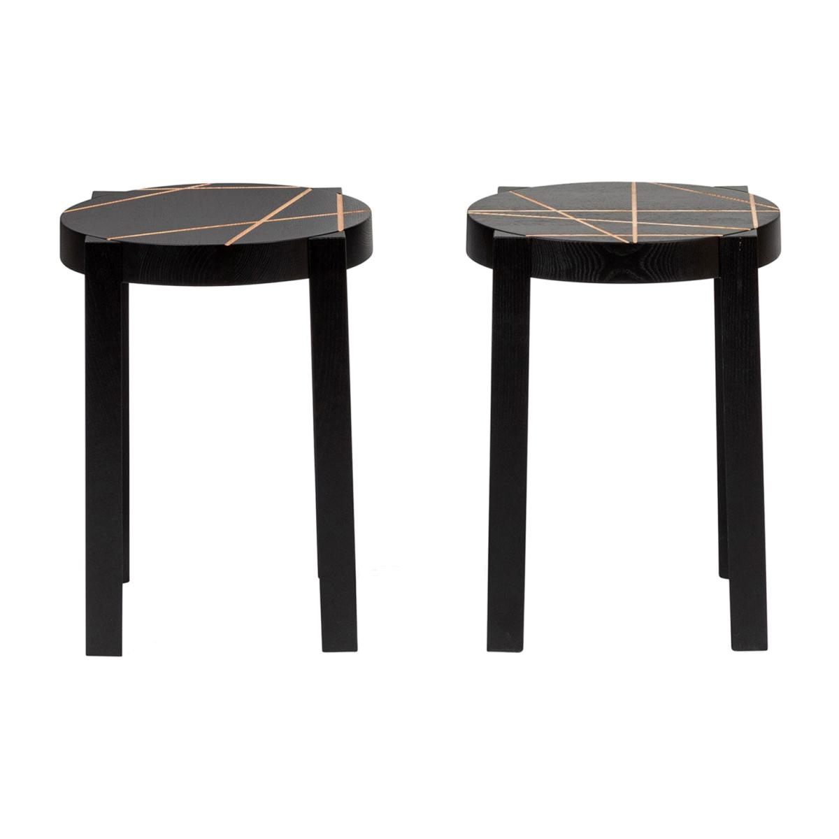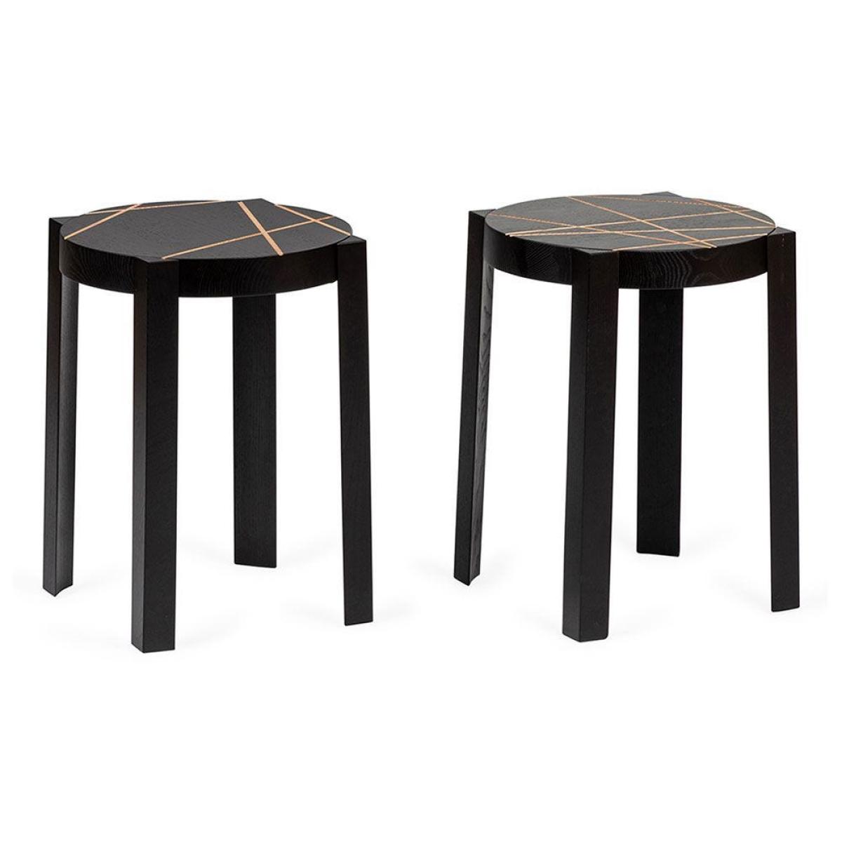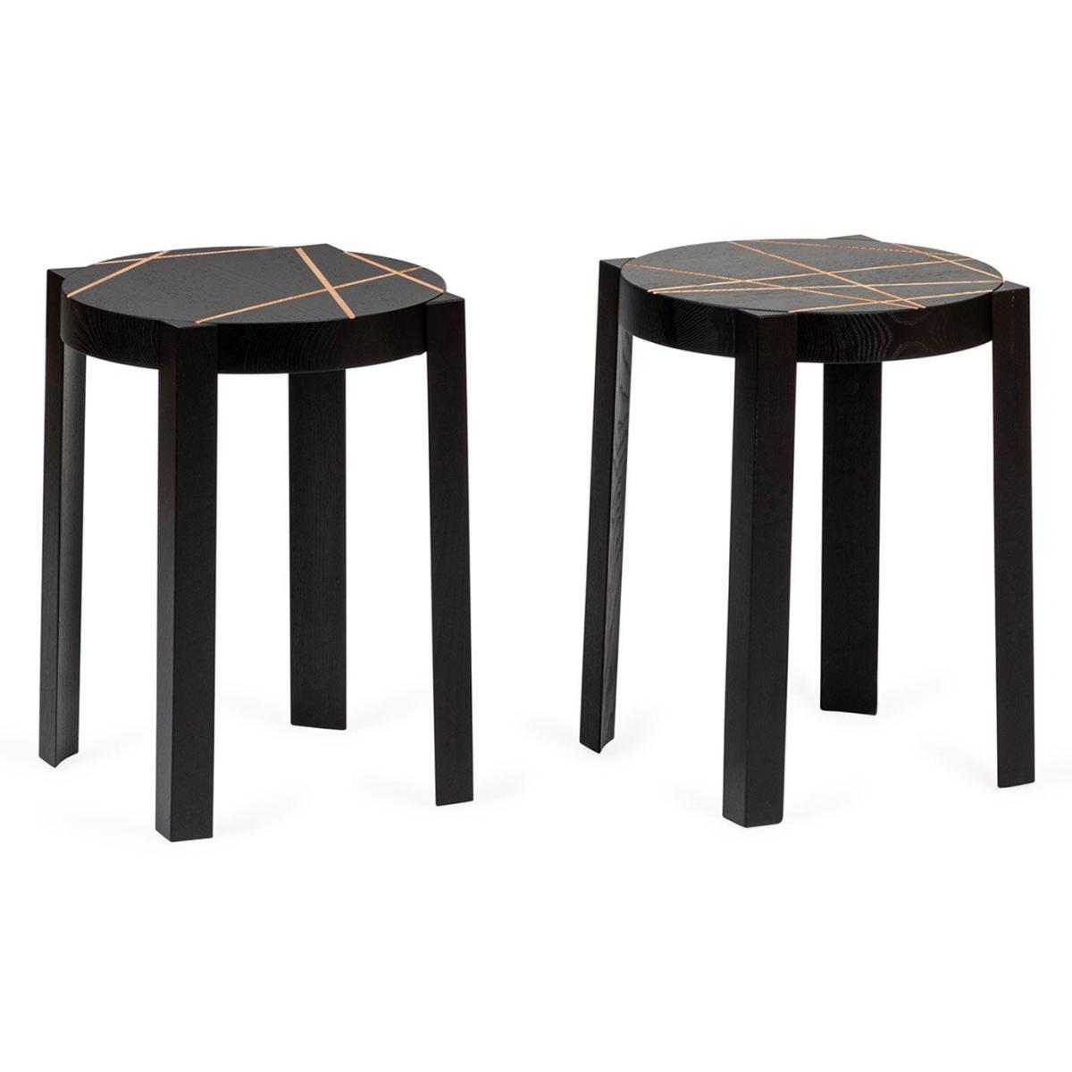 Marie-Christine Dorner designed this set of two CATS Stools for Ligne Roset and each one is engraved with a different line motif. Each stool is crafted using ash with a black lacquer coating and accented with grooves that highlight the natural wood below. This versatile design can be used as a stool, as a compact side table and can be stacked on top of one another.