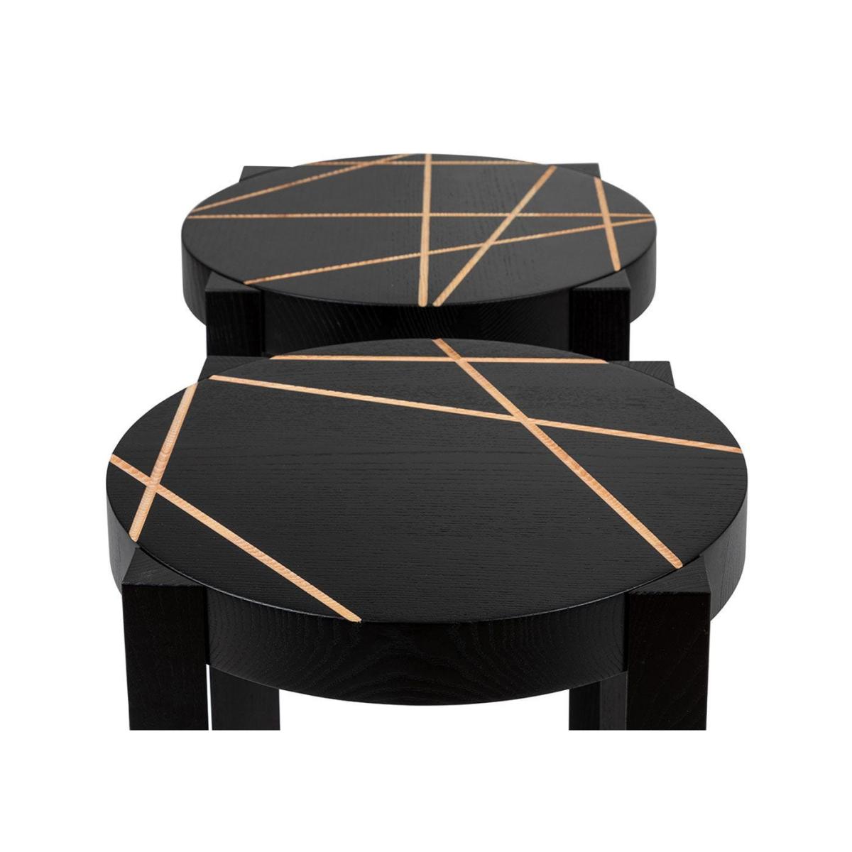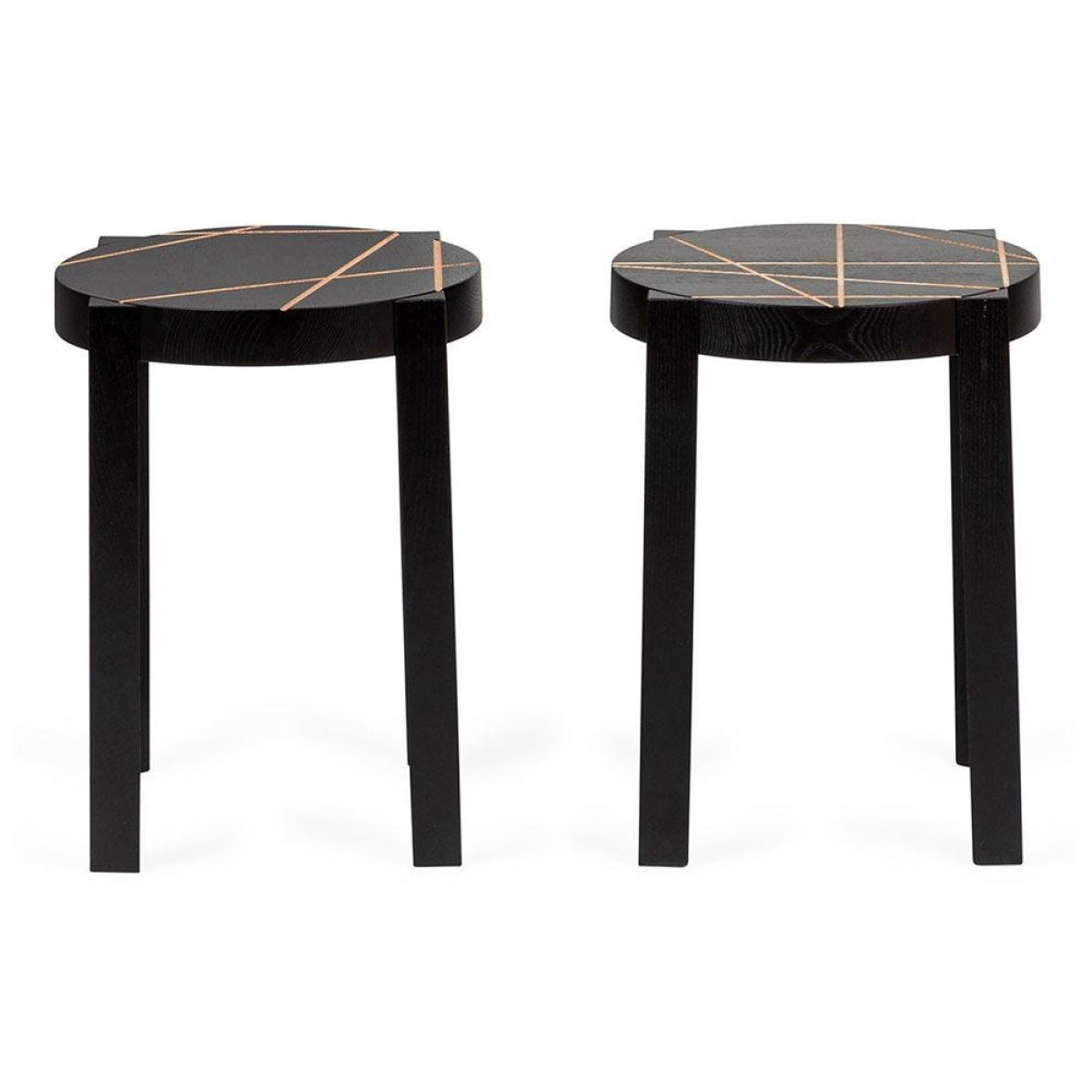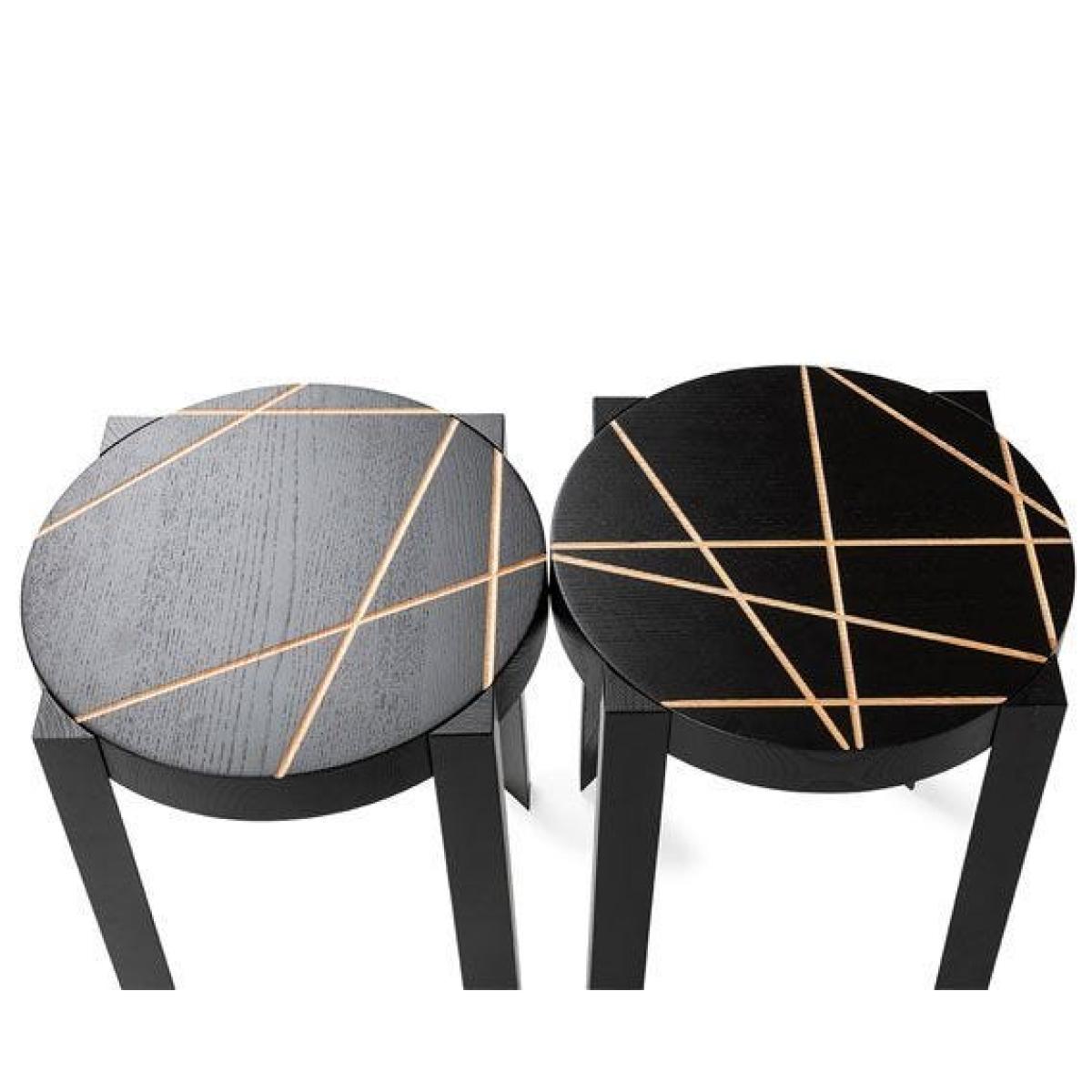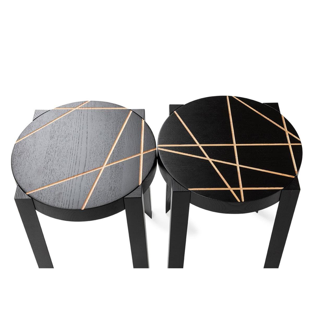 Marie-Christine Dorner designed this set of two CATS Stools for Ligne Roset and each one is engraved with a different line motif. Each stool is crafted using ash with a black lacquer coating and accented with grooves that highlight the natural wood below. This versatile design can be used as a stool, as a compact side table and can be stacked on top of one another.