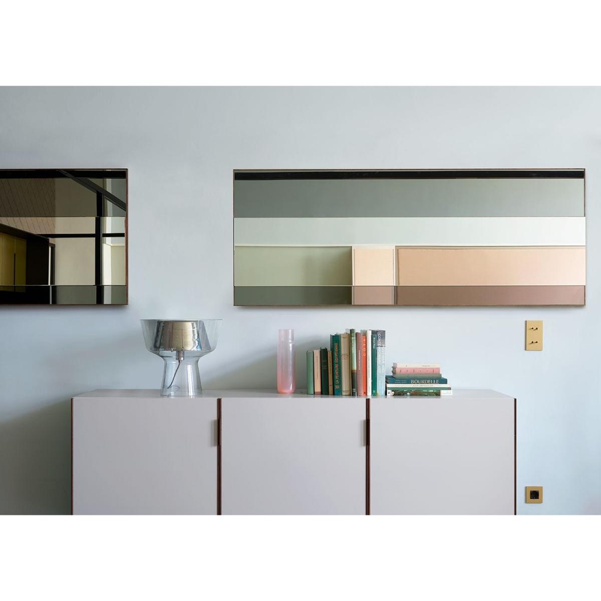 How to reflect without aggression? The answer is, in "demi-teintes" (half-tones). These mirrors enable the surroundings to be reflected in tones of grey or bronze, but also to clearly reflect whatever one seeks to see. One mirror can hide another... Smoked mirrored glass with solid American walnut edging and inset rectangular mirror with walnut veneered edging.