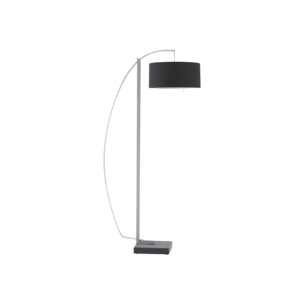 Floor standard lamp with counterbalance-controlled arm. Structure in brilliant-chromed tubular steel with varnished stained concrete base and white or black taffeta shade.