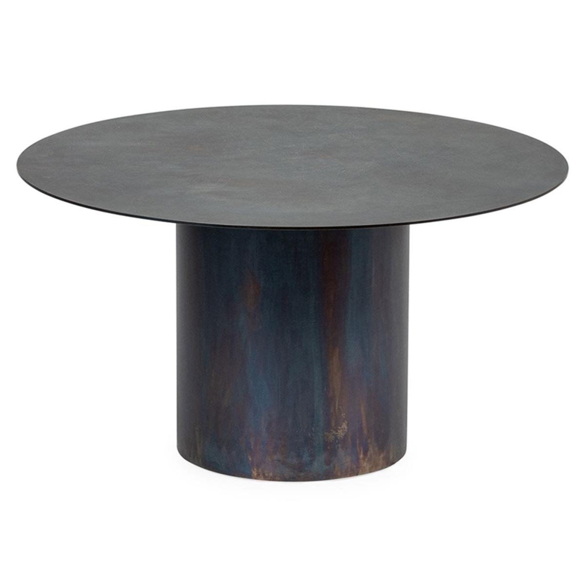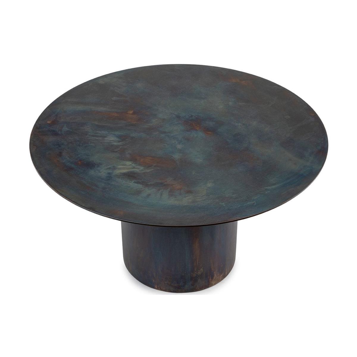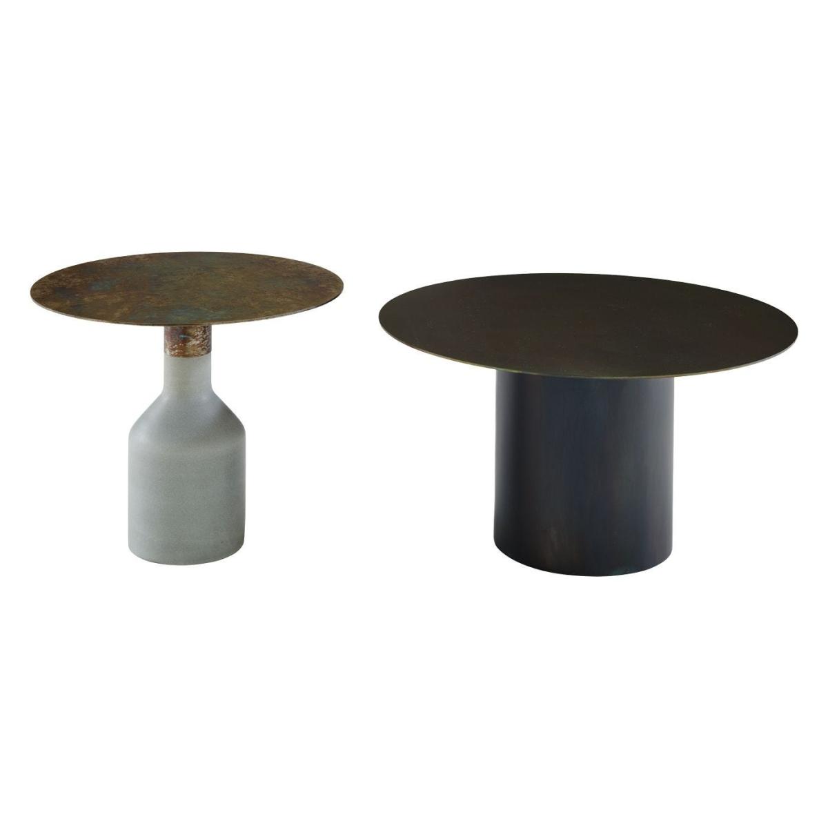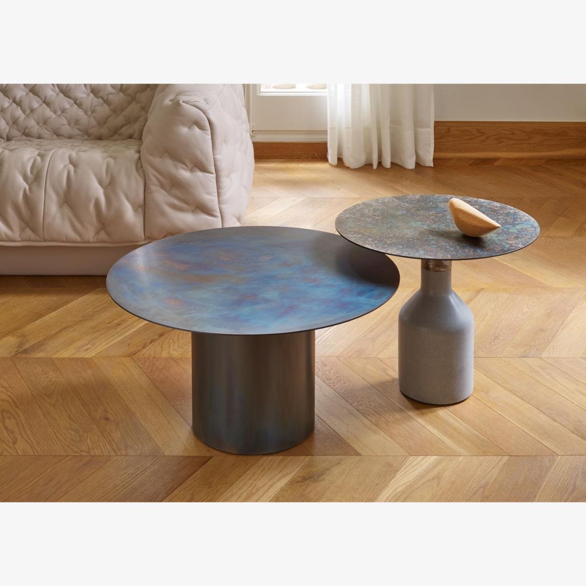 I’m a fan of the Oxydation low table for its subtle patina top and solid cylindrical base - it brings texture and warmth without dominating a space. In minimalist, industrial or Scandi-inspired interiors it works equally well as a standalone centrepiece or in a duo, thanks to its pared-back silhouette and rich, iridescent finish. Styling tip: position it beside a low-slung sofa in muted tones and layer simple accessories - think a matte ceramic vase, a couple of art books or a small potted plant. If you use two tables of differing heights, you instantly add visual interest; just be sure to protect the metal surface with coasters under hot drinks to preserve its finish.