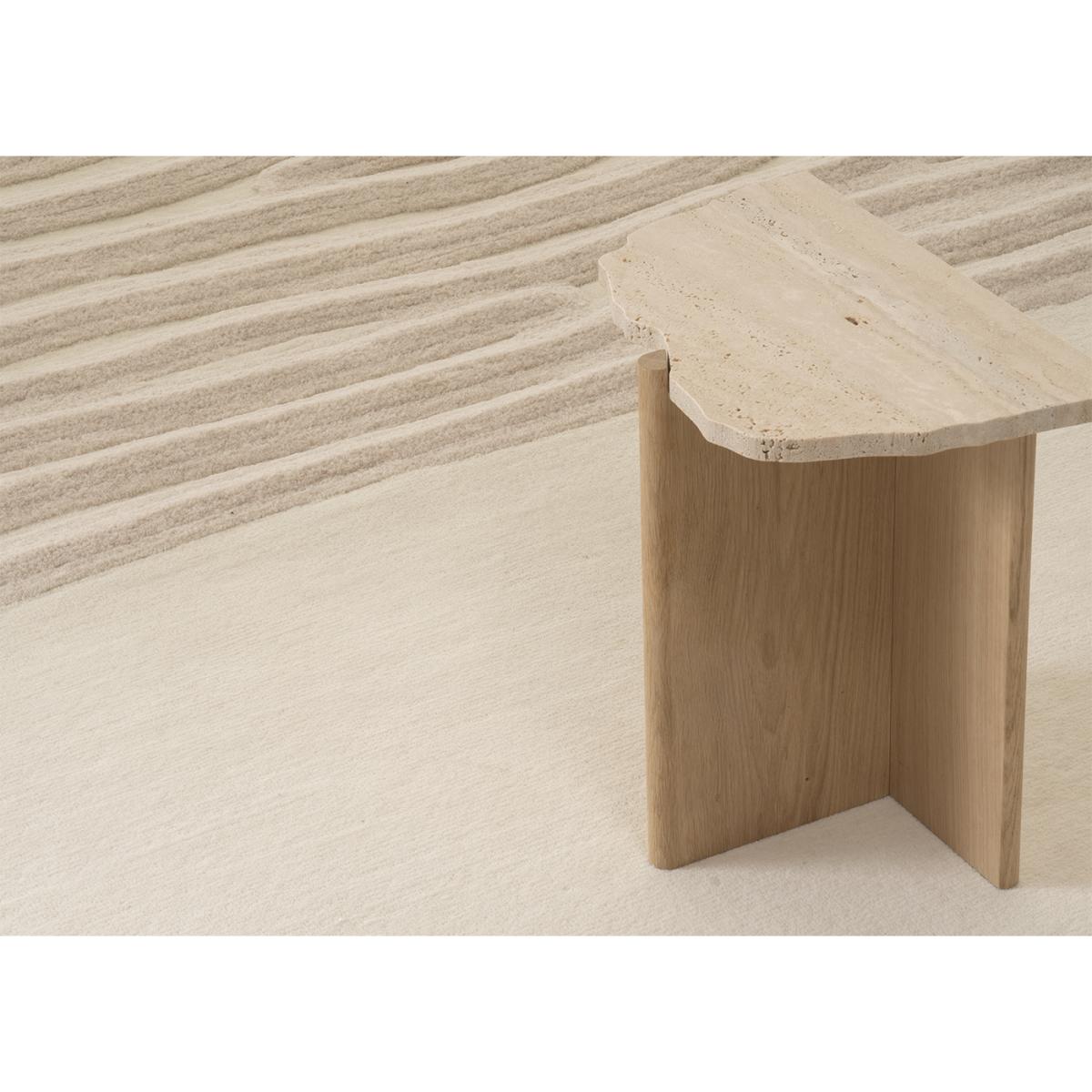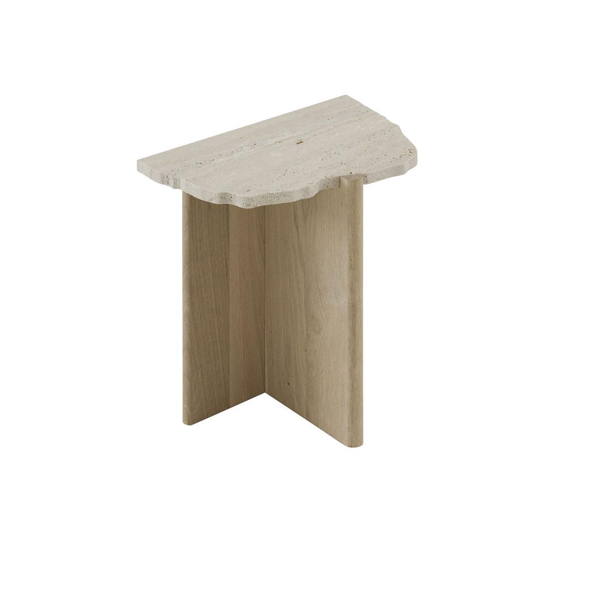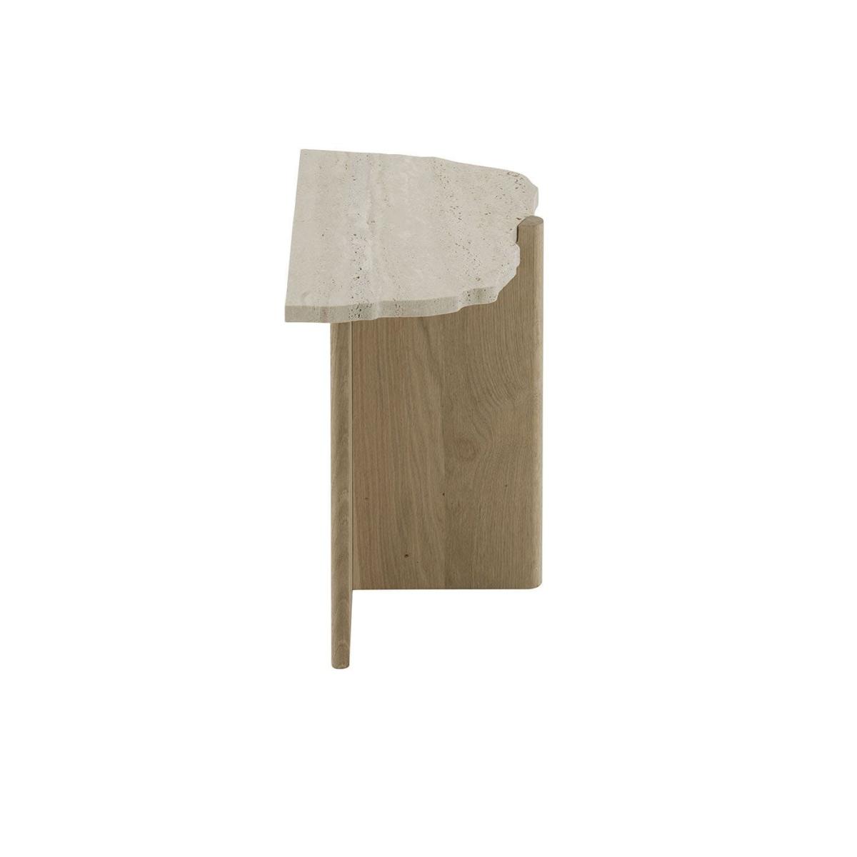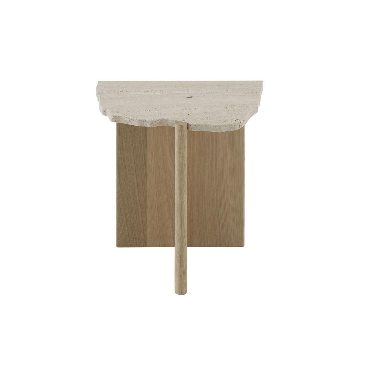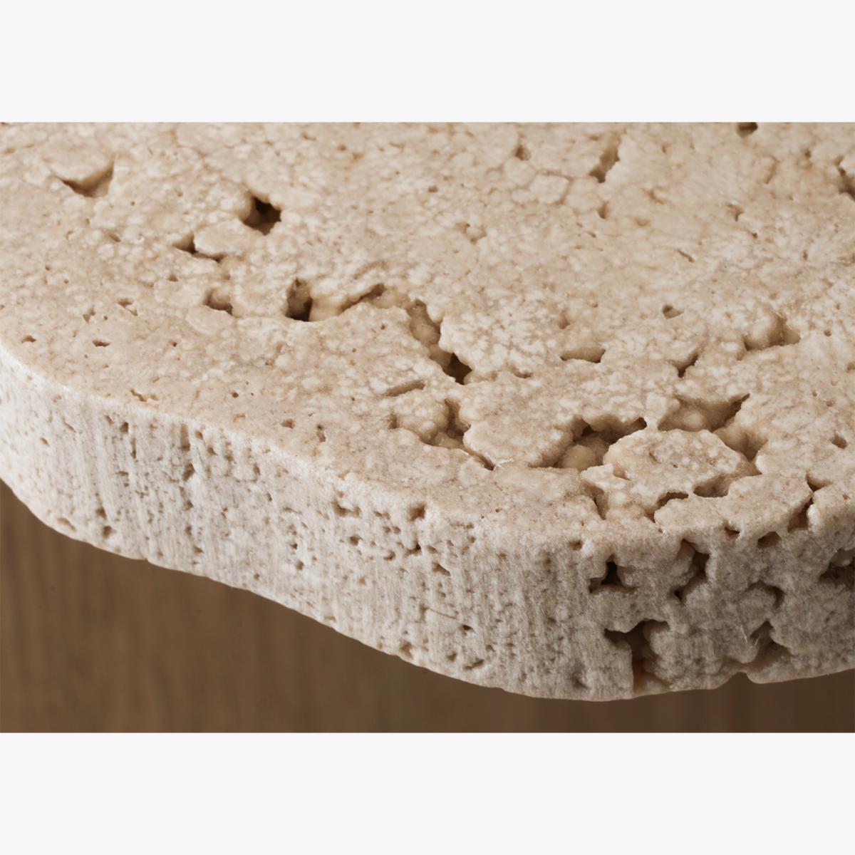 The Rhéa occasional table offers a poetic vision inspired by plants and nature. It combines two materials: the solid wood base and the travertine top. The structure of the base is made of oak with a natural varnish. The top is in open pore travertine, with 2 layers of a waterproofing agent, the edge of the top remains raw (unpolished). The travertine top (limestone rock) has small cavities, enabling to feel a grained and irregular texture to the touch. Its colour reflects light. Travertine is worked and re-cut to form the shape of a leaf.
