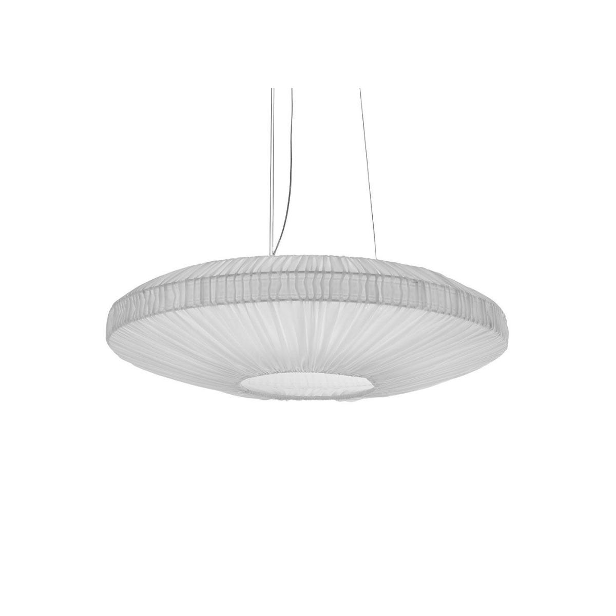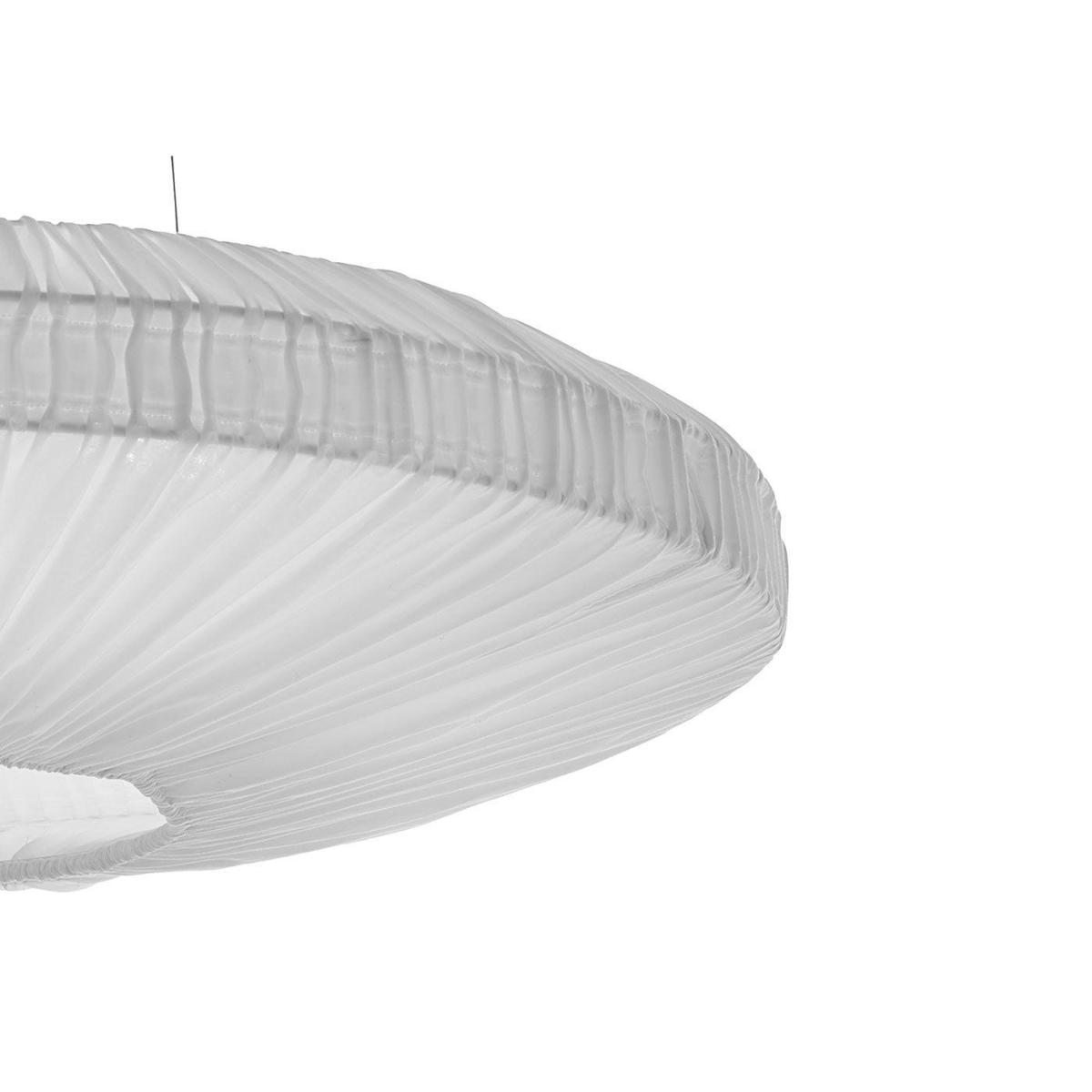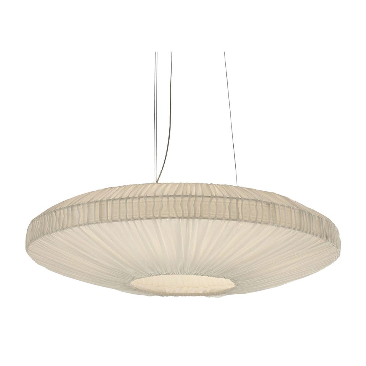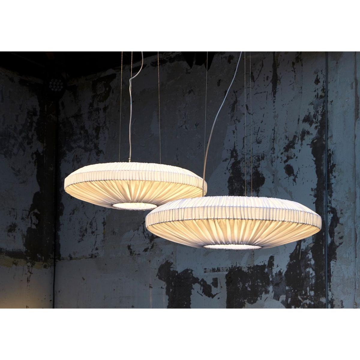 A classic technique for a contemporary and very charming design. A rufflette is a thick strip of tape which is sewn to the top of curtains so they can be gathered, to which curtain hooks can be attached. With this suspended light by Marie-Christine Dorner, a tall rufflette is wrapped around the outer edges of the widest part of the shade and it is this which, by pleating the fabric, enables regular pleats to be formed on its two slopes.