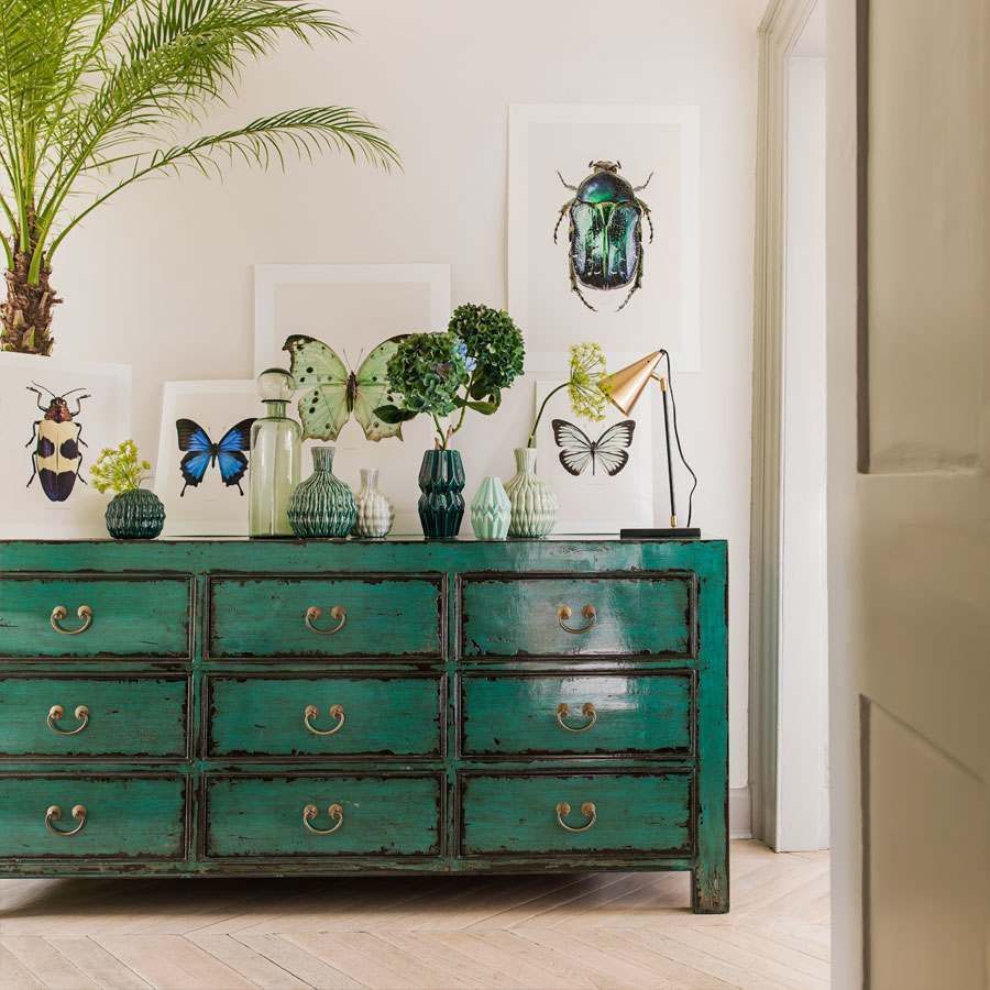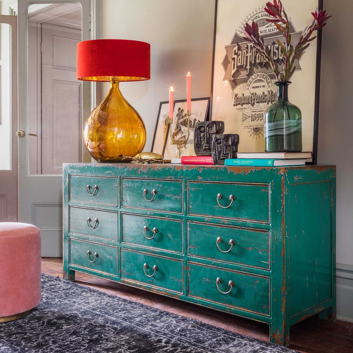 I love this peacock chest because of its bold, vintage charm and striking colour that instantly adds character to any space. It works particularly well in eclectic or bohemian interiors, where its colourful finish can become a statement piece, but it also pairs nicely with more neutral palettes for a touch of unexpected vibrancy. Practical styling tips include using the top surface for decorative objects or lighting, while the drawers provide ample storage for clothes, linens, or household essentials. To keep its charm intact, consider leaving some drawers slightly imperfect or distressed, giving it a lovely aged look that adds to its character.