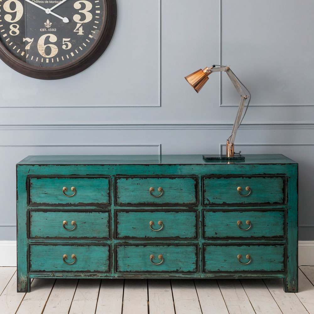 A Chinese-inspired piece crafted from recycled aspen with a waxed turquoise finish, featuring nine spacious drawers complete with brass metal handles. Carefully distressed to give it an elegantly aged appearance, this oversized chest is a true statement piece. H78 x W170 x D45cm. Made of recycled aspen wood and brass. Distressed finish. Features nine drawers. With a waxed turquoise finish, please note the finish is mixed by hand therefore variations in colour can be expected. Due to the hand-distressed finish, colour and pattern may vary.