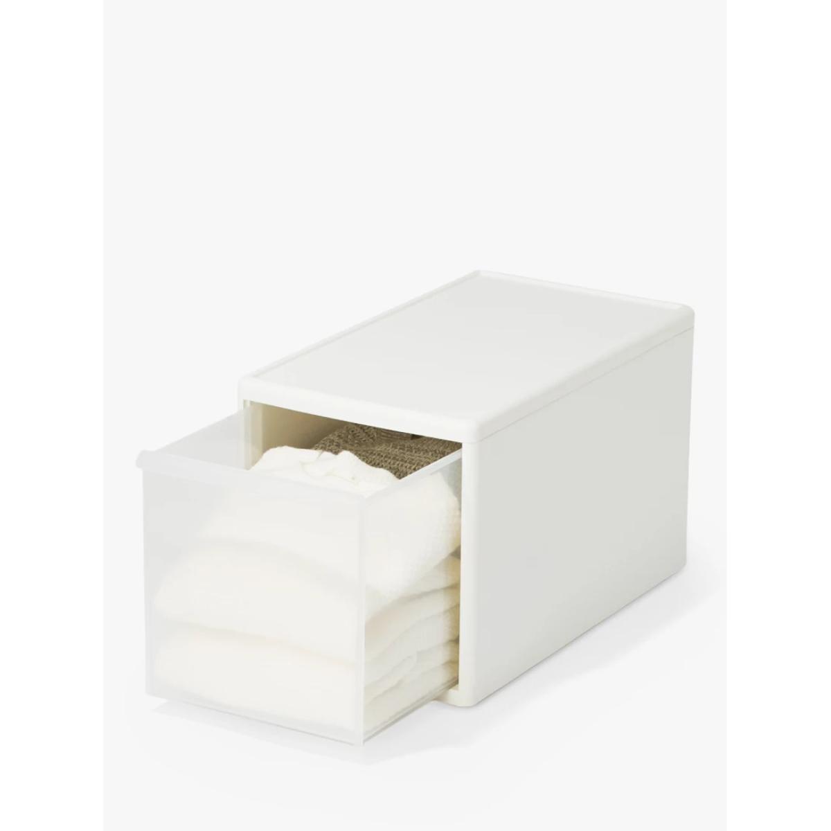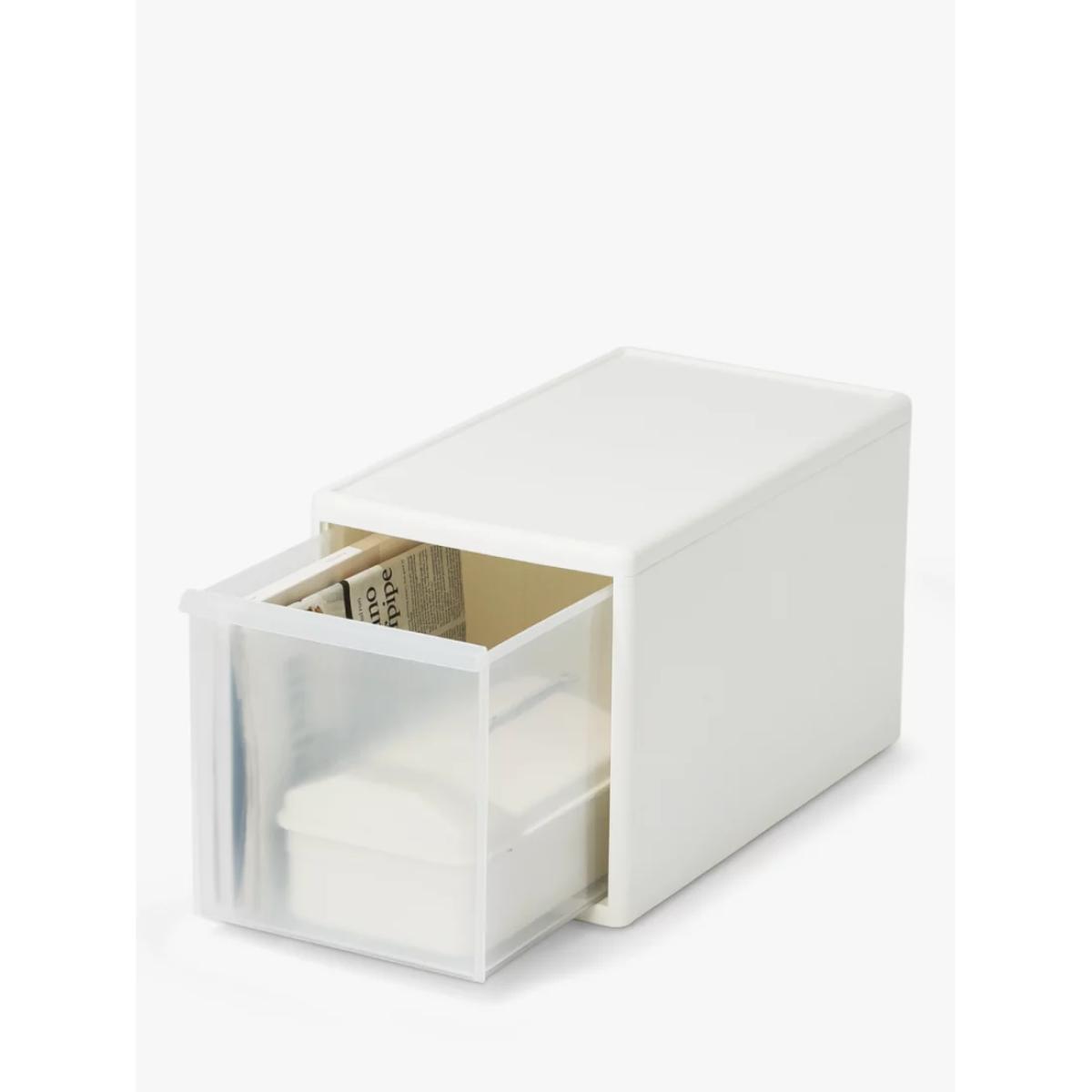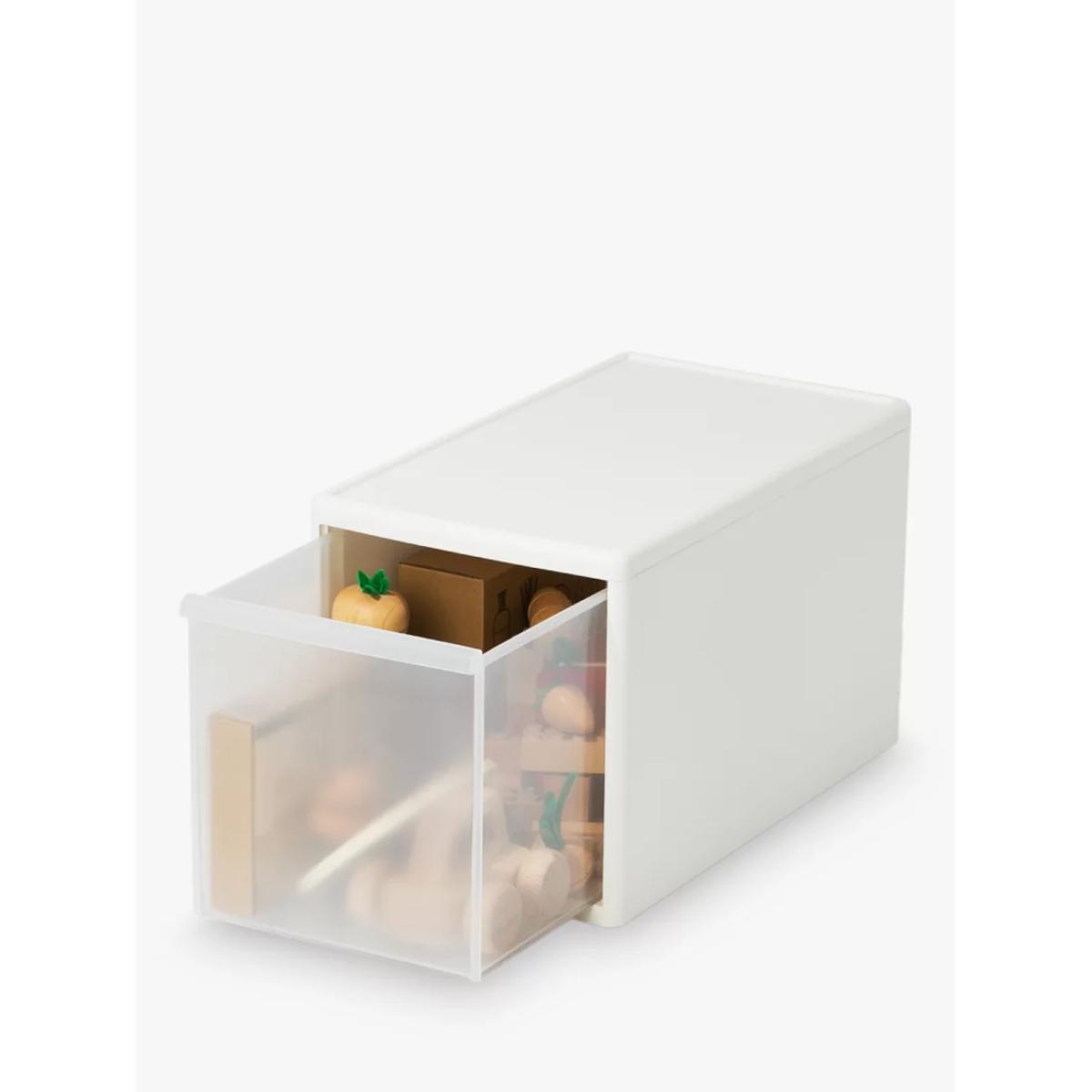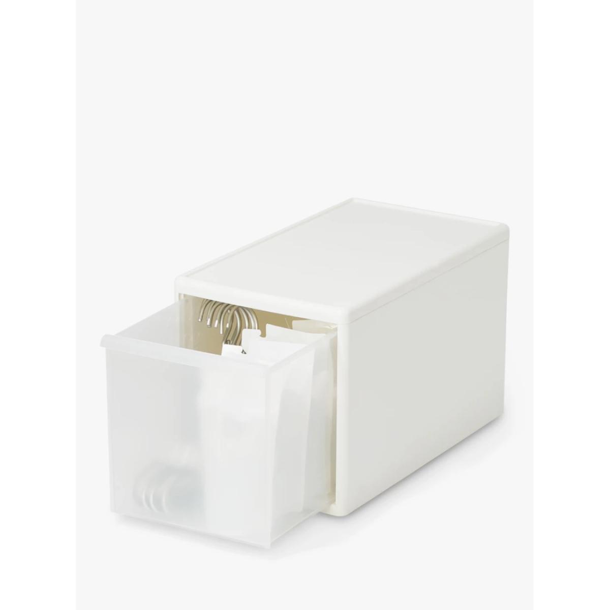 I love this stacking plastic drawer for its versatility and sleek, minimal look. It works particularly well in modern or utilitarian interiors where organisation is key, such as in home offices, craft rooms, or kitchens. The clear design allows you to see the contents at a glance, making it functional and tidy-looking. For styling, consider stacking a few for a uniform storage solution, or mix with labelled containers to add organisation without clutter. It blends seamlessly with neutral palettes but can also pop against colourful surroundings, making it a practical yet discreet addition to any space that values neatness and ease of access.