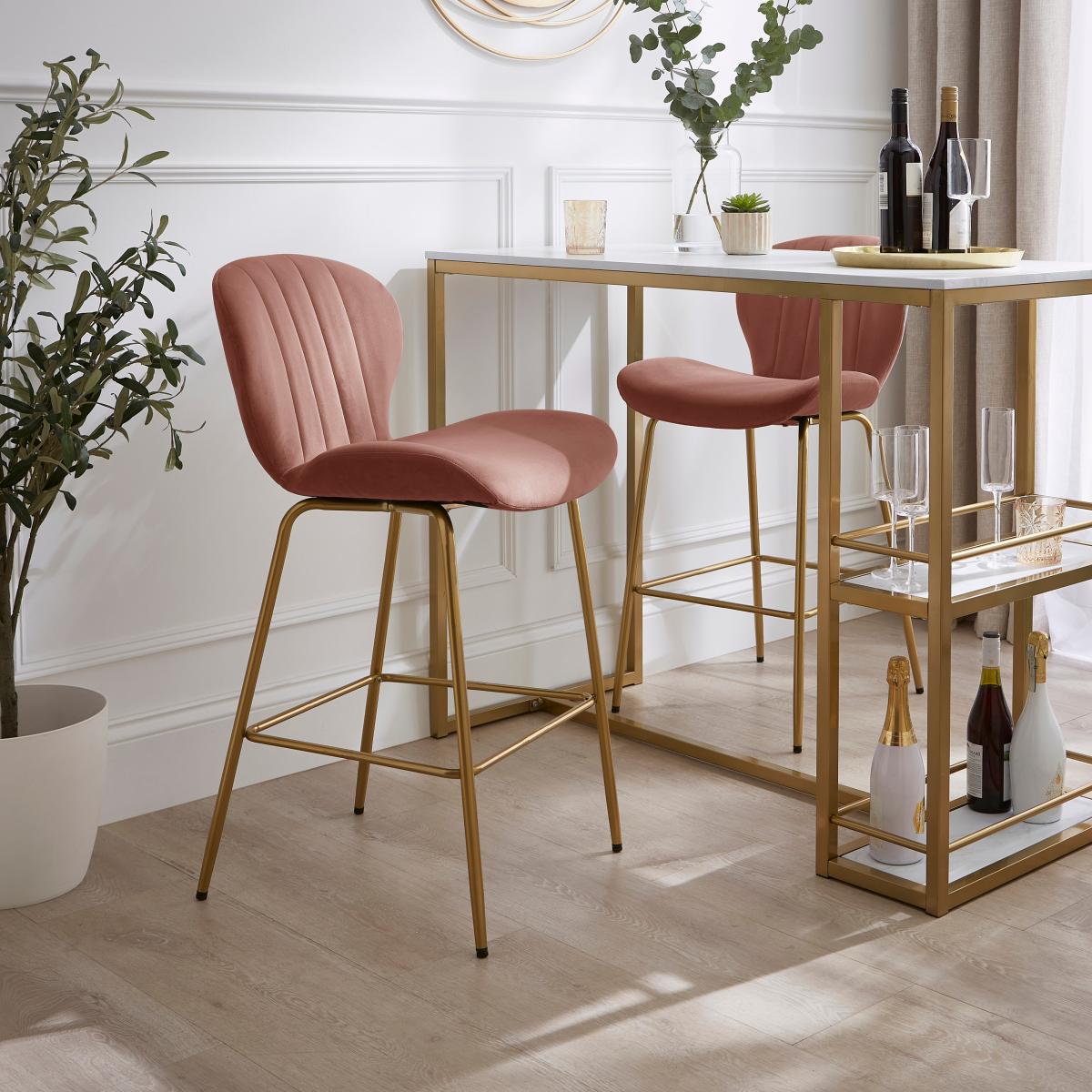 The Lila counter height stool in velvet adds a touch of elegance to any space. I love its soft pink hue combined with the gold-toned legs - it offers a chic, contemporary look that works well in both modern and slightly more traditional interiors. It’s versatile enough to suit kitchen breakfast bars, home pubs or even stylish workspaces. For styling, pair it with a marble or wooden countertop to maximise visual contrast, and consider keeping other furnishings in neutral shades to let the stool stand out. Practical tips include choosing a seat height that suits your counter, and adding some cushions or removable covers for extra comfort and easy maintenance. Overall, it’s a wonderful piece for bringing a soft glamour to everyday dining spaces.
