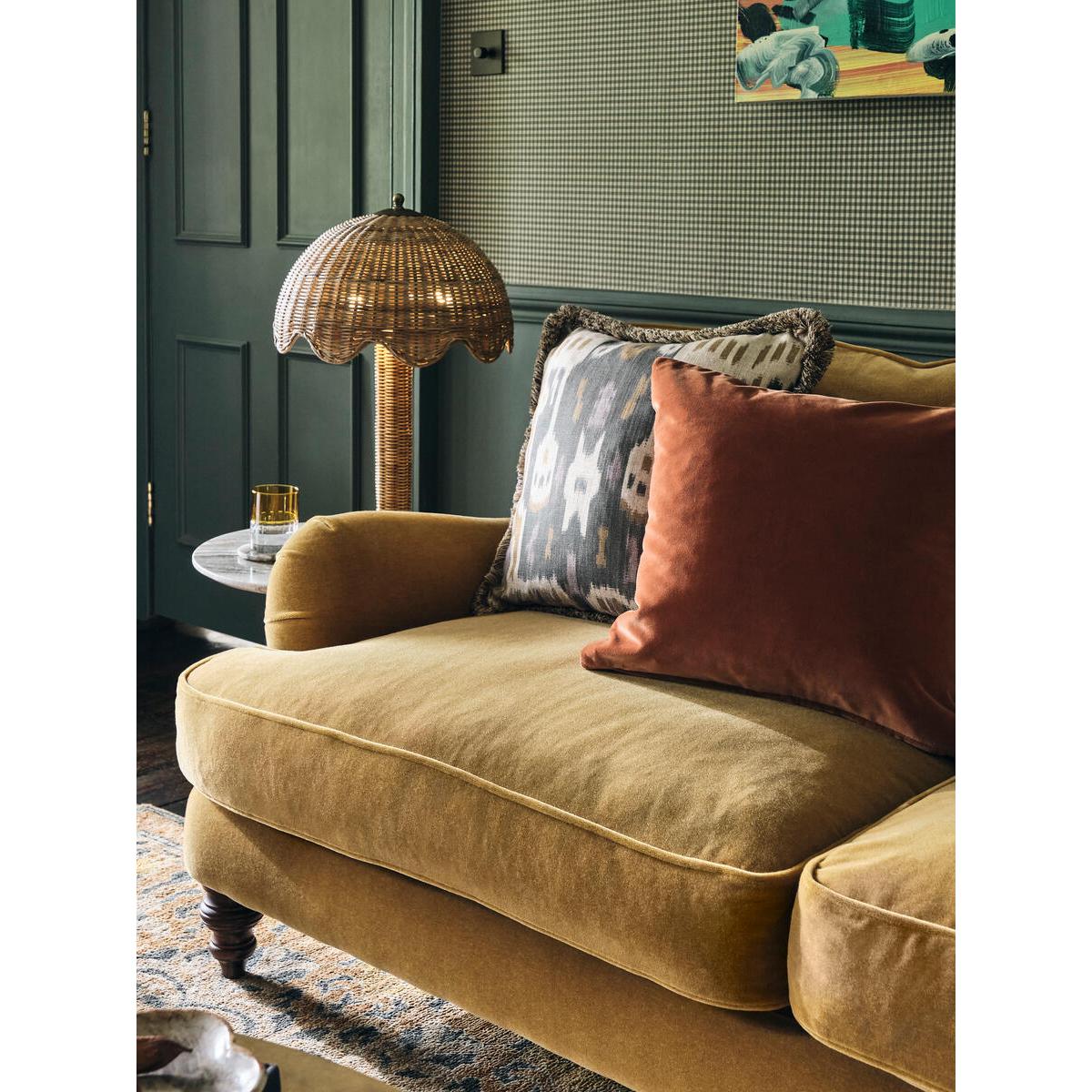 The Lila table lamp is a great addition to both contemporary and vintage-inspired interiors, thanks to its woven, rattan-style shade that adds texture and warmth. I love how it provides a subtle, ambient glow, making it perfect for creating cosy corners in living rooms or bedrooms. Practical styling tips include pairing it with relaxed upholstery and layered cushions, like in the image, to enhance a lived-in look. It works especially well beside a velvet or linen sofa or on a side table in a reading nook. To keep the look cohesive, consider using warm metallic accents or natural materials around it for a well-rounded, inviting feel.