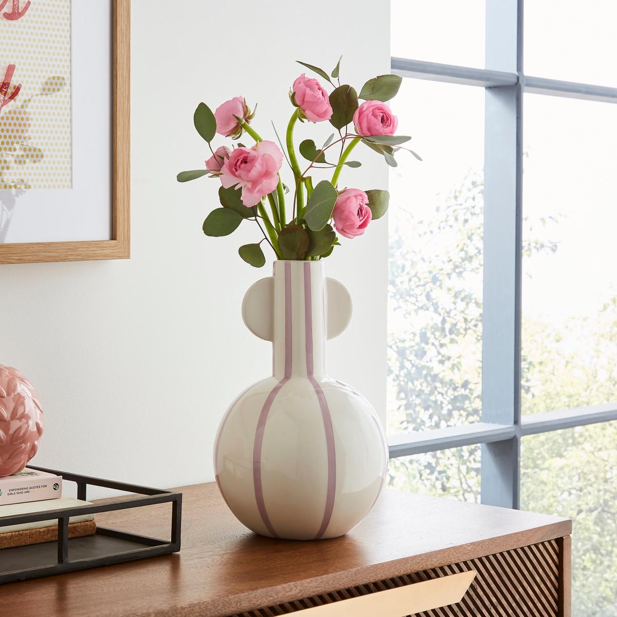 I really like this lilac striped vase - it offers a wonderful pop of colour and pattern without overwhelming the space. It works particularly well in contemporary or Scandinavian interiors where its soft purple tones can soften minimalist palettes. The size and shape are quite versatile, so it can be styled on a sideboard, mantelpiece, or as a centrepiece on a dining table. For a fresh look, try adding a simple mixed bouquet or even just a few single stems for an understated effect. Pairing it with muted or pastel tones will enhance its colour, while contrasting it with darker backgrounds can make those stripes stand out even more. Overall, it’s a subtle yet stylish piece that can add visual interest to a variety of rooms.