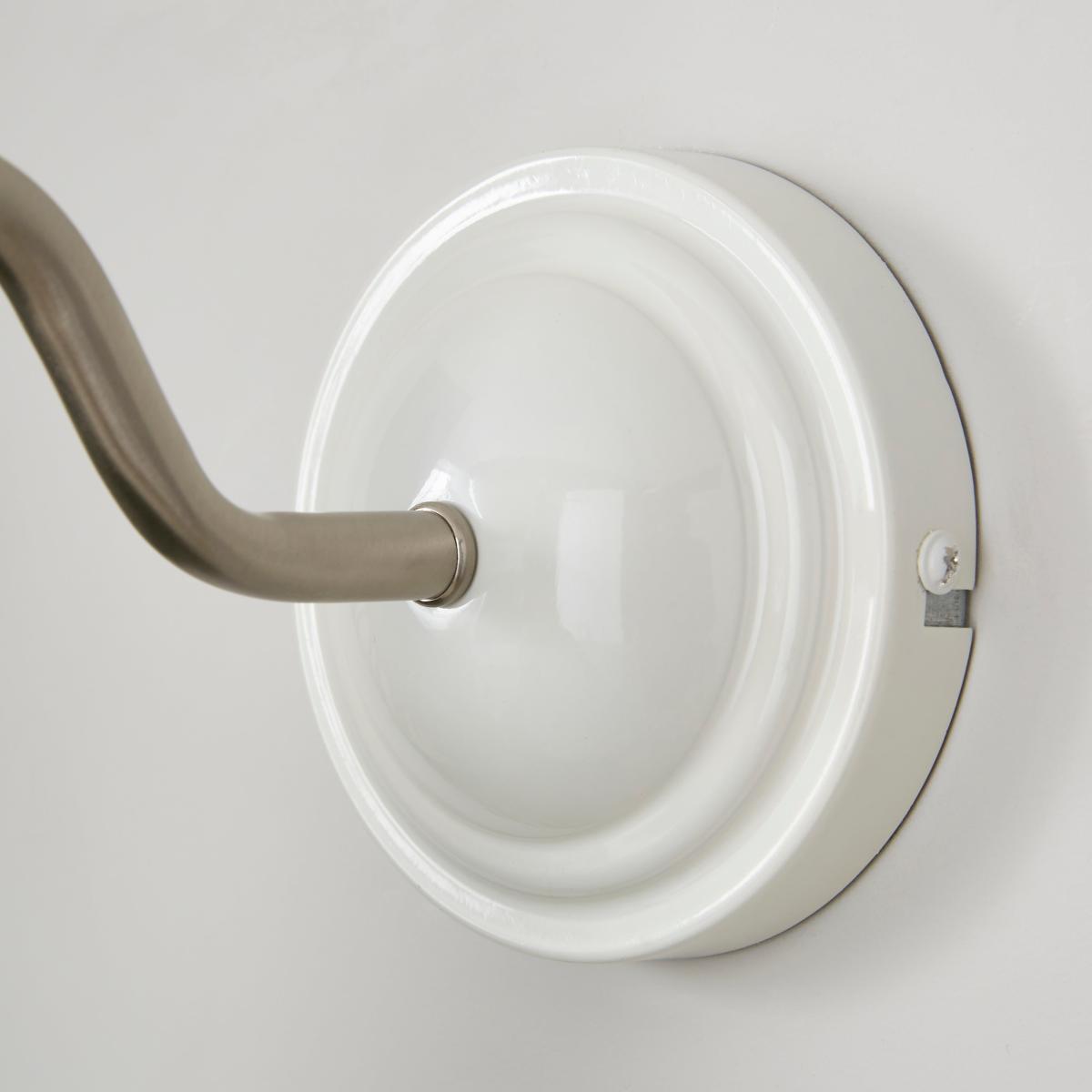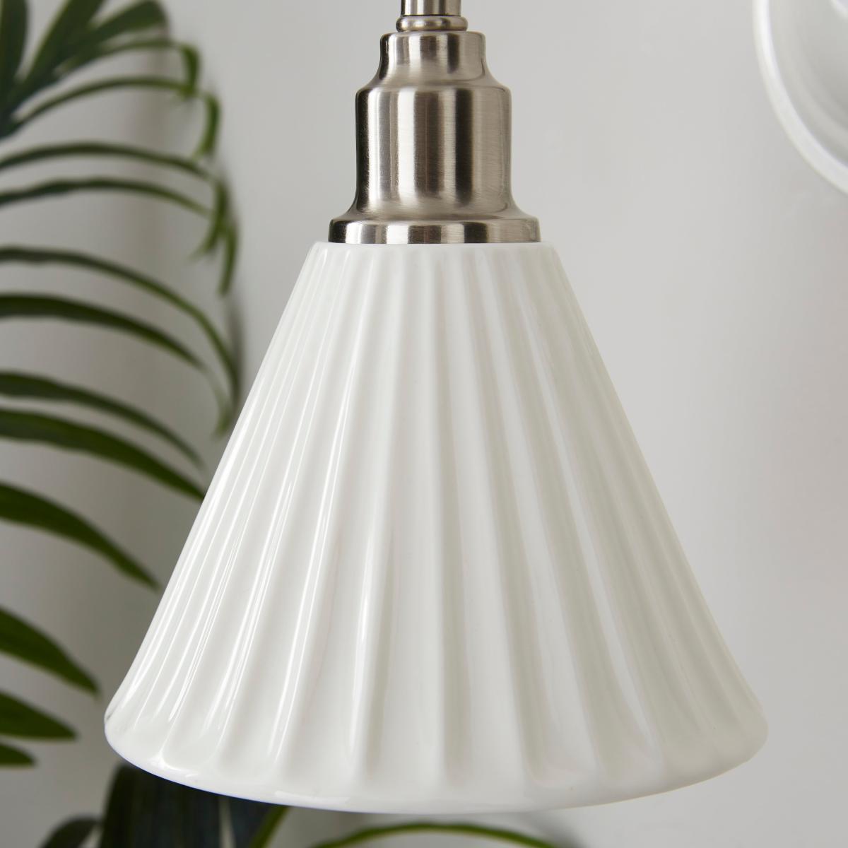 * Ribbed Design* Ceramic Tapered Shade* Gorgeous Addition to Home This metal-fitted wall light features a curved satin nickel arm and a glossy ribbed ceramic tapered shade. It emits a warm glow, making it perfect for creating a cosy ambience in any room.