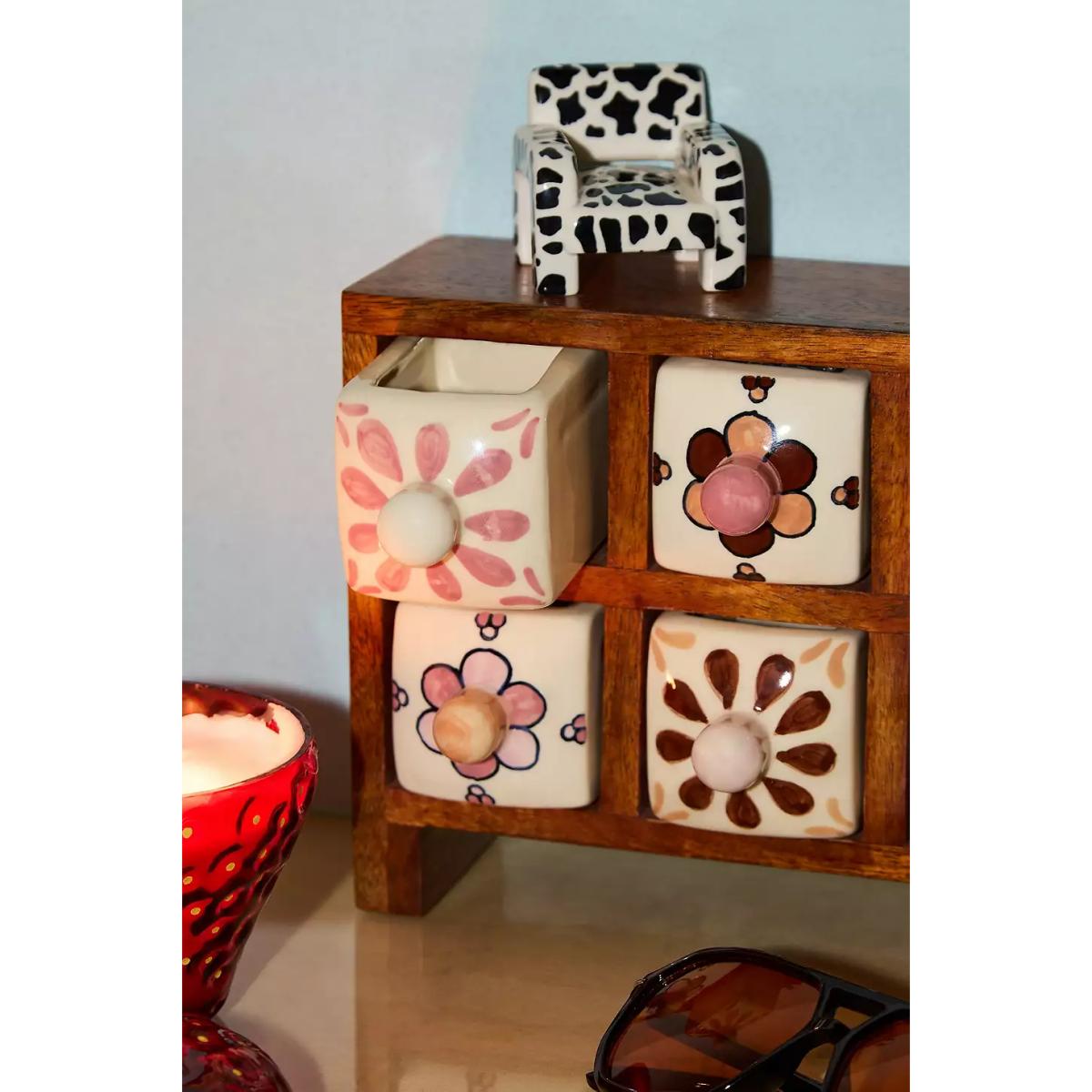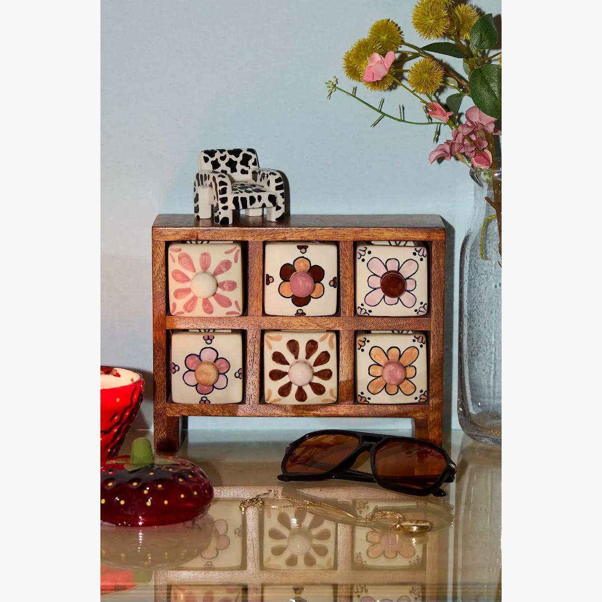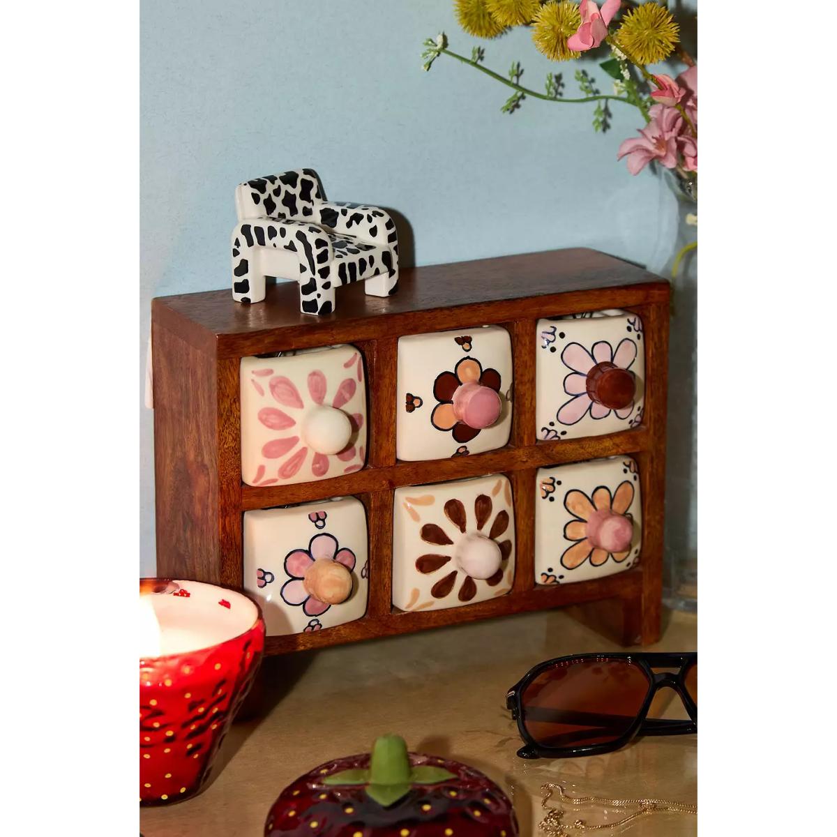 Store trinkets and jewellery in this cute tabletop set of drawers. The six-drawer construction unit sits neatly on a tabletop or desktop, complete with a mango wood construction and floral painted drawers for storing bits inside. **Content + Care** \- 62% Stoneware, 38% Mango Wood \- Wipe clean
