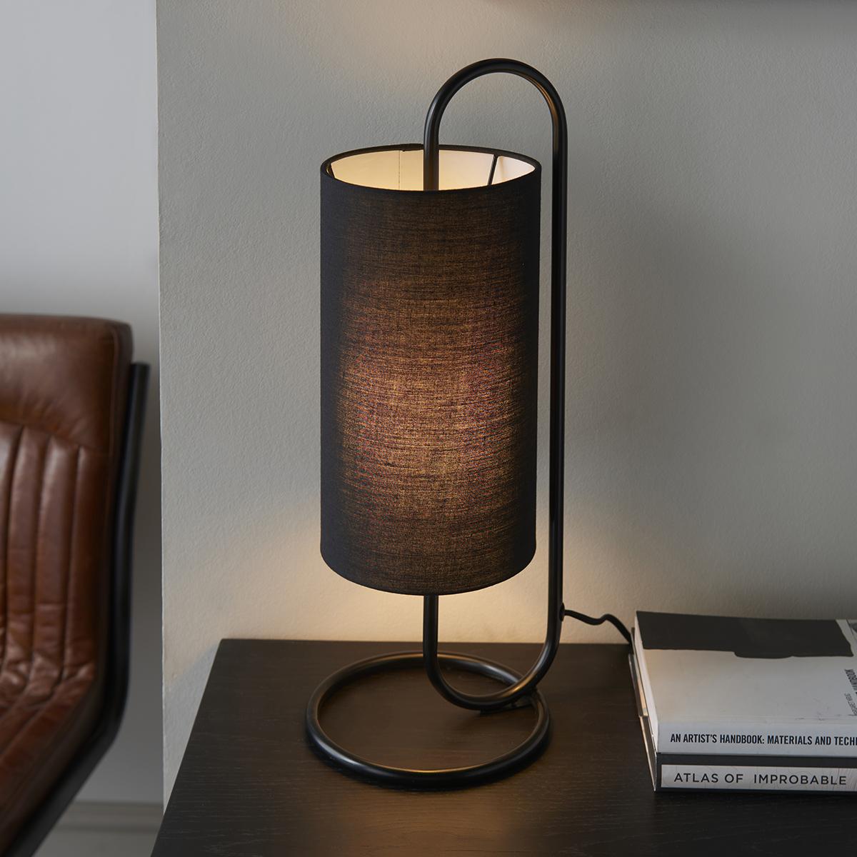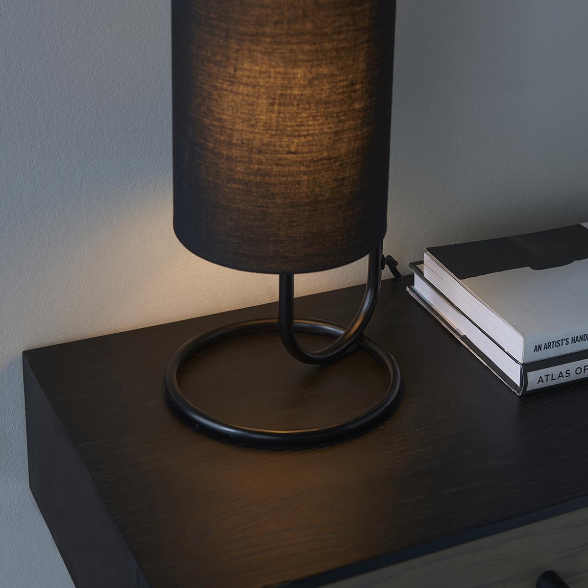 I really like this lamp for its sleek, modern appeal and understated elegance. The matt black finish ensures it seamlessly fits into contemporary, minimalist, or industrial-inspired interiors, adding a touch of sophistication without overpowering the space. Its compact size and versatile design make it ideal as an occasional or bedside lamp, while the black fabric shade creates a warm, diffused glow that enhances cosy corners. For styling tips, consider pairing it with soft textures like velvet cushions or matte ceramic accessories to keep the look cohesive. It also works well on side tables or as a statement piece on a console, providing functional lighting with a refined aesthetic.
