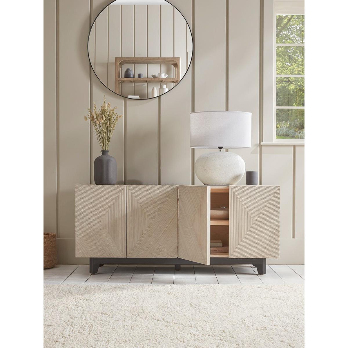 I’m a big fan of the Lilja unit for its subtle geometric veneer and light oak finish - it slips effortlessly into Scandi, coastal or modern schemes and won’t compete with bolder décor. Its low profile makes it ideal as a TV stand or hallway console, and the black metal plinth adds a slight industrial edge. For styling, keep larger pieces grouped in odd numbers: try a round mirror above, a sculptural lamp at one end and a pair of ceramic vases at the other. Tuck a woven basket underneath to introduce texture and hide everyday bits, then finish with a couple of monochrome coffee-table books or a small potted plant to soften the lines.