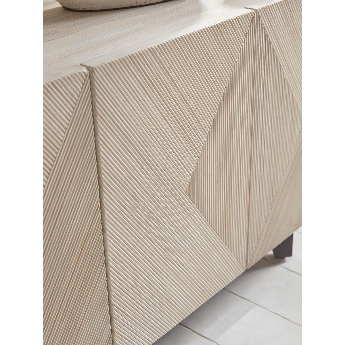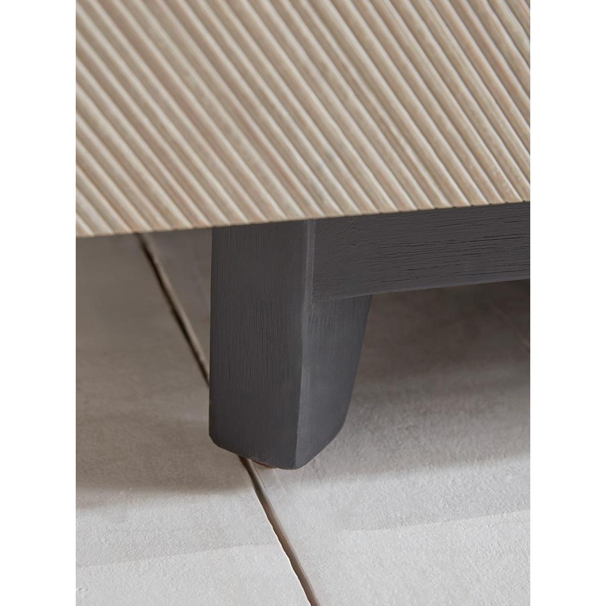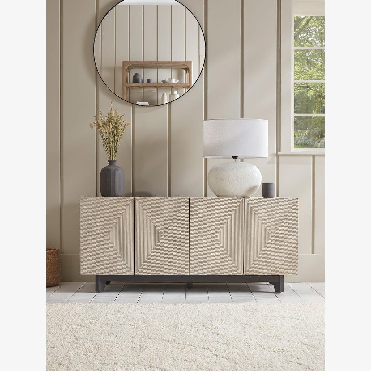 Add a touch of modern lightness to your space with our Lijia media unit. The blonde wood contrasts beautifully with the chic dark painted wooden legs, giving the unit a contemporary feeling. In a triangular shape, three sections on each door have finely carved wooden lines which create much textural dimensions and depth. Four doors with a shelving unit inside provide ample storage space, and the neutral tones lend itself to multiple interior schemes. Pair with our Lara vase, to complement the darker legs, as we have done here.