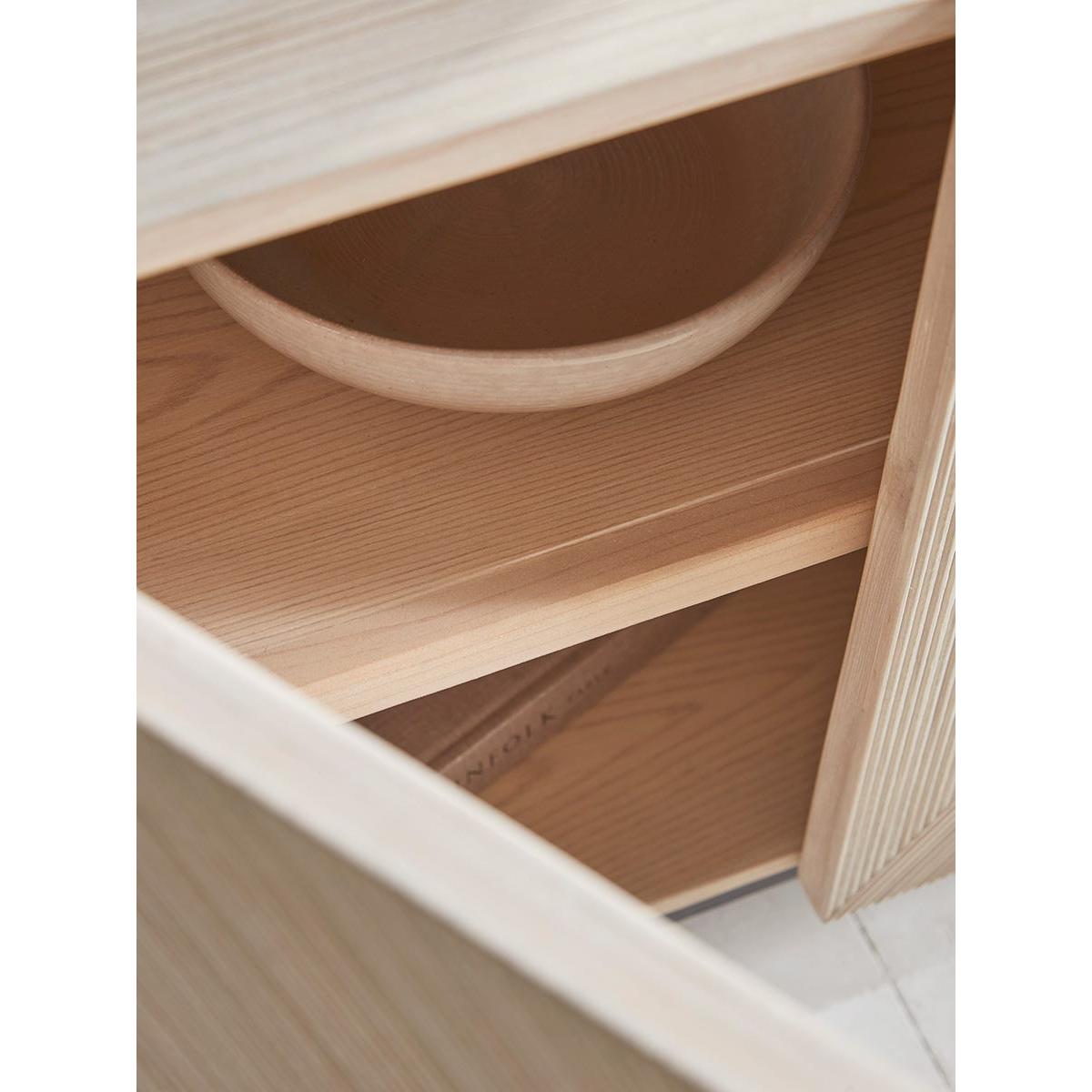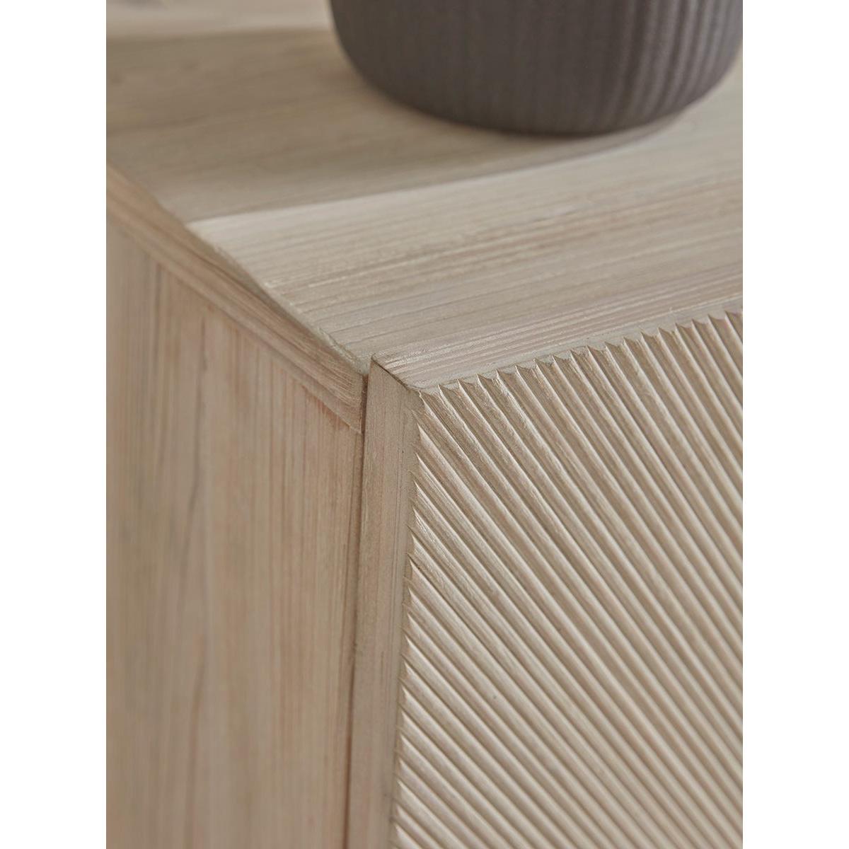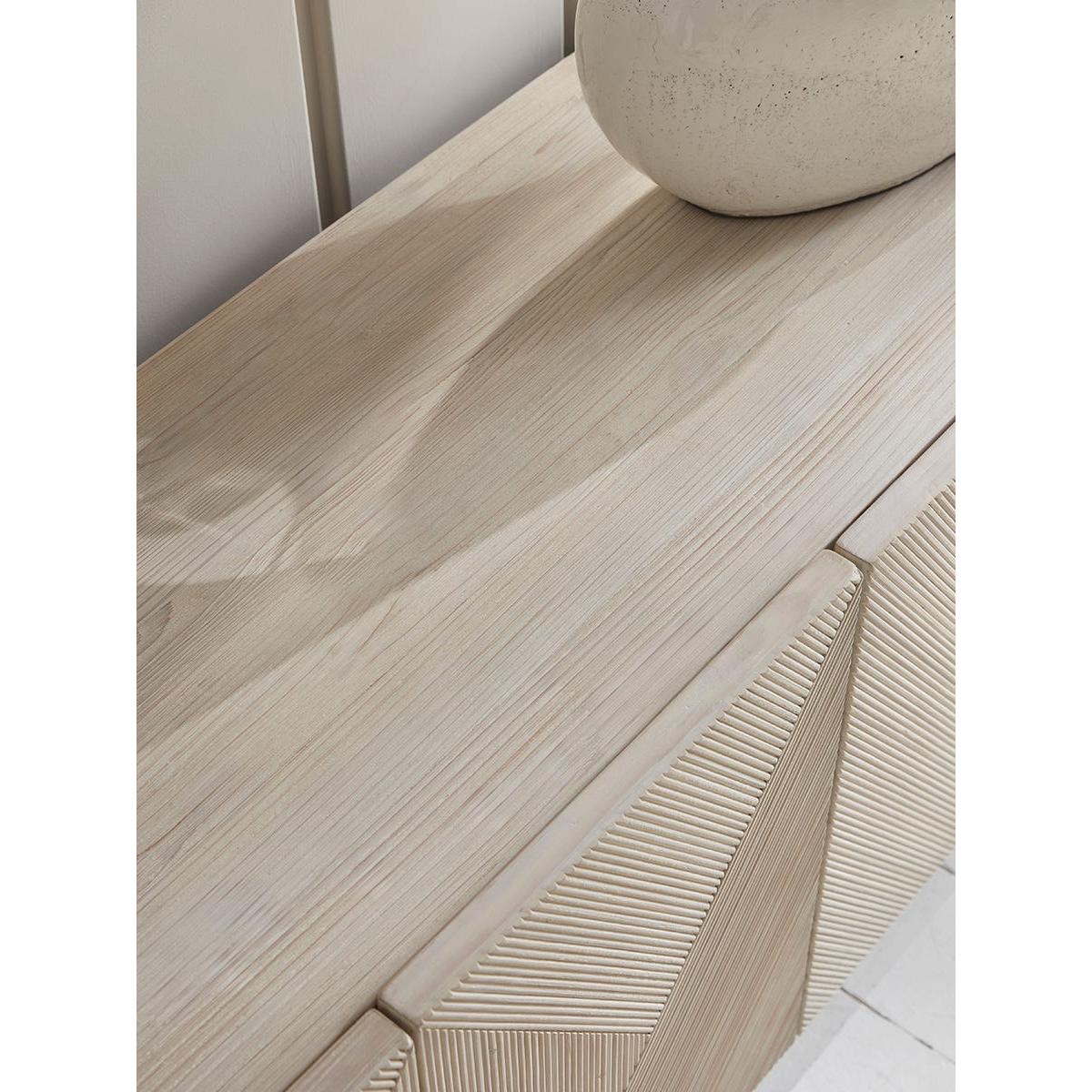 Add a touch of modern lightness to your space with our Lijia media unit. The blonde wood contrasts beautifully with the chic dark painted wooden legs, giving the unit a contemporary feeling. In a triangular shape, three sections on each door have finely carved wooden lines which create much textural dimensions and depth. Four doors with a shelving unit inside provide ample storage space, and the neutral tones lend itself to multiple interior schemes. Pair with our Lara vase, to complement the darker legs, as we have done here.