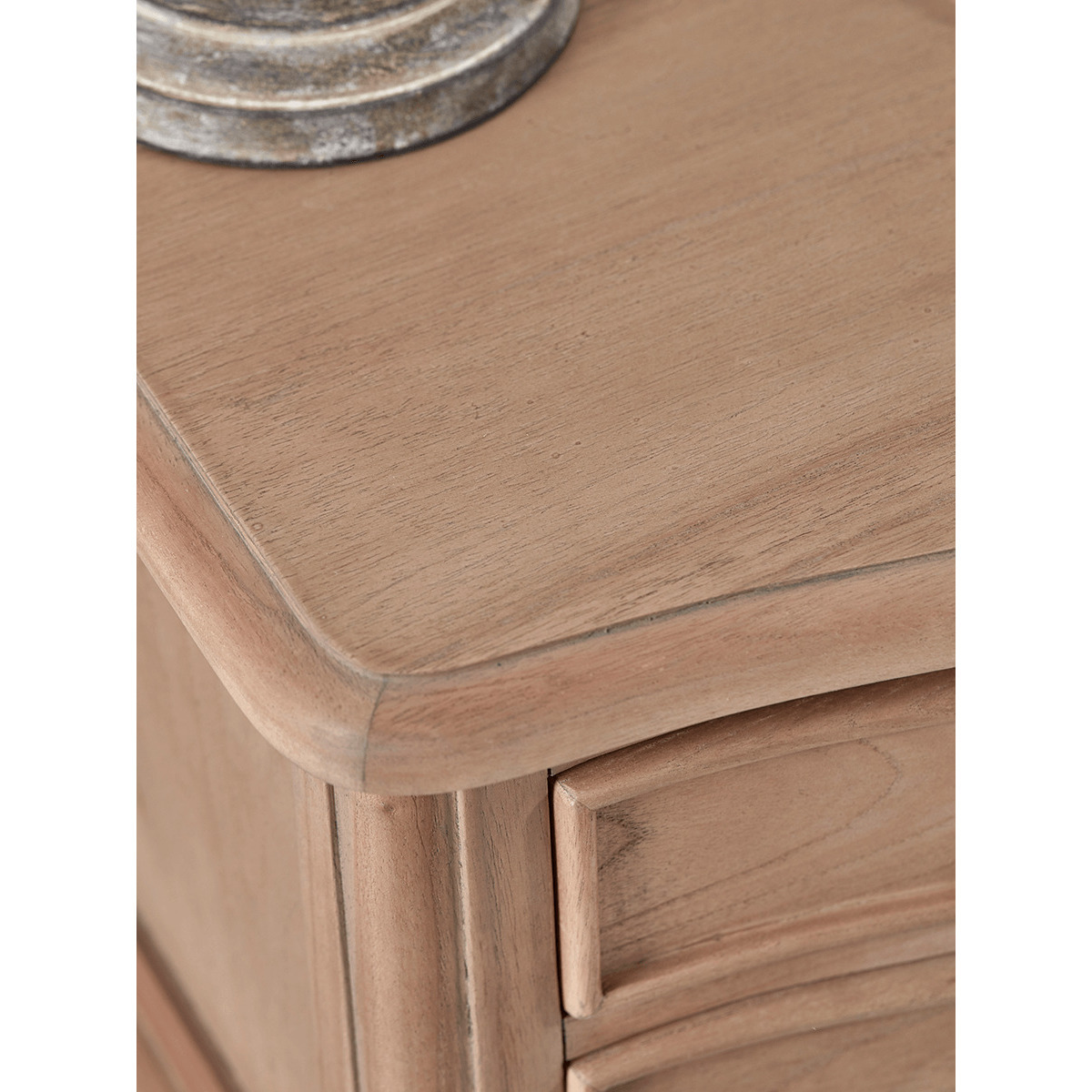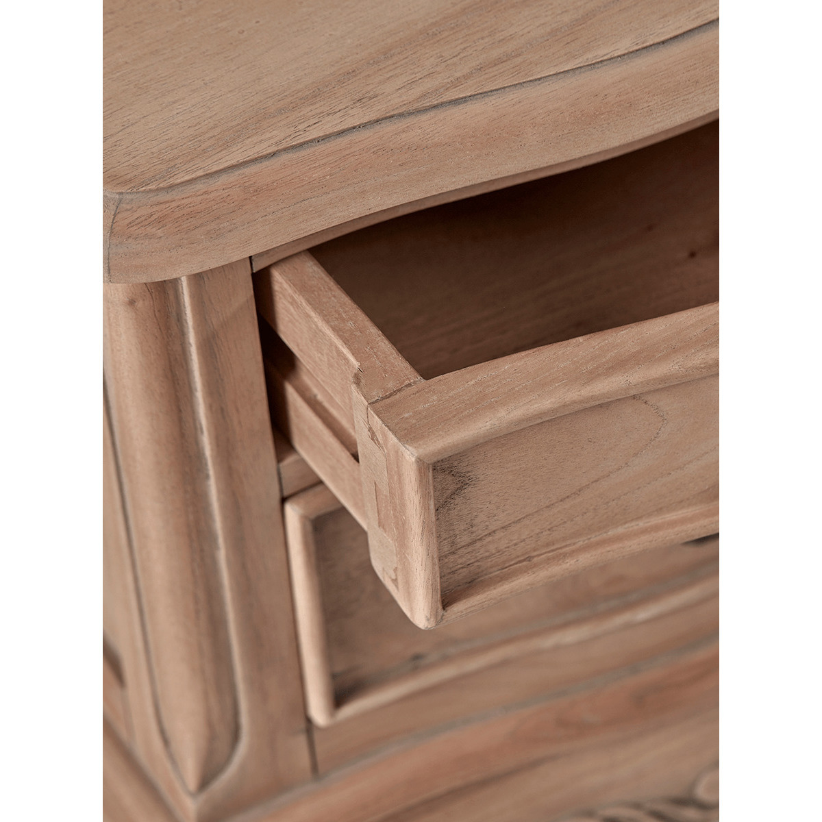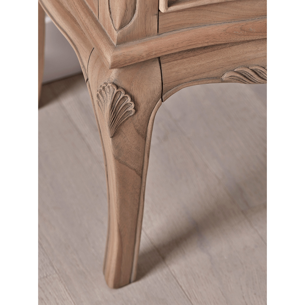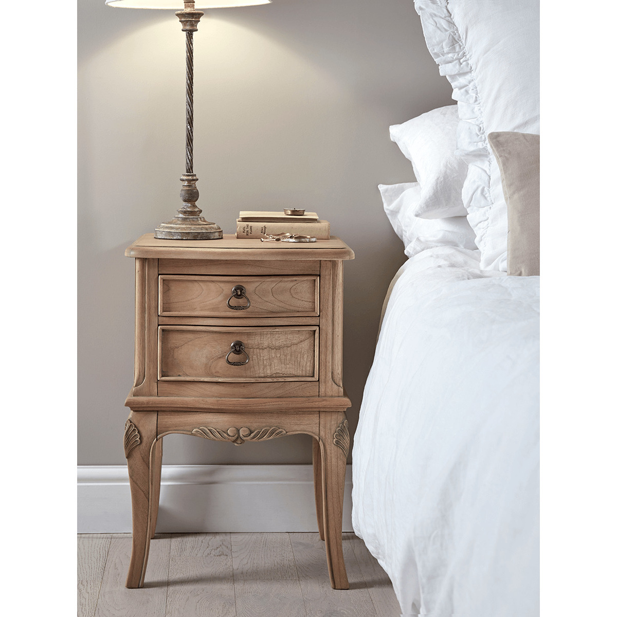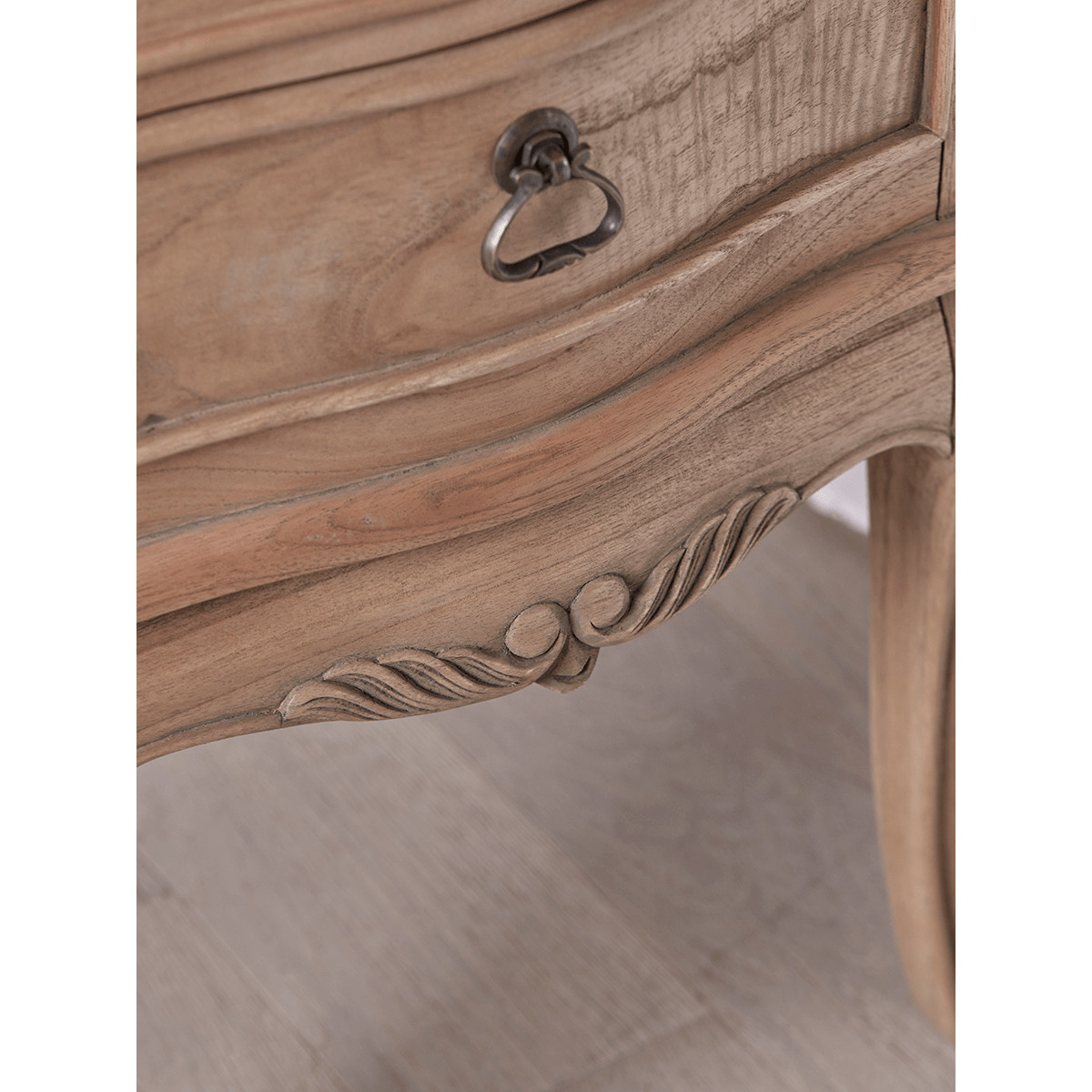 Elegant and intricate with a touch of the Baroque, our French inspired bedside table features all of the carved, scrolled and sculpted details you could wish for. Each piece is crafted from wood with a blushing, blonde tone and has two petite drawers, each with a cascading handle.