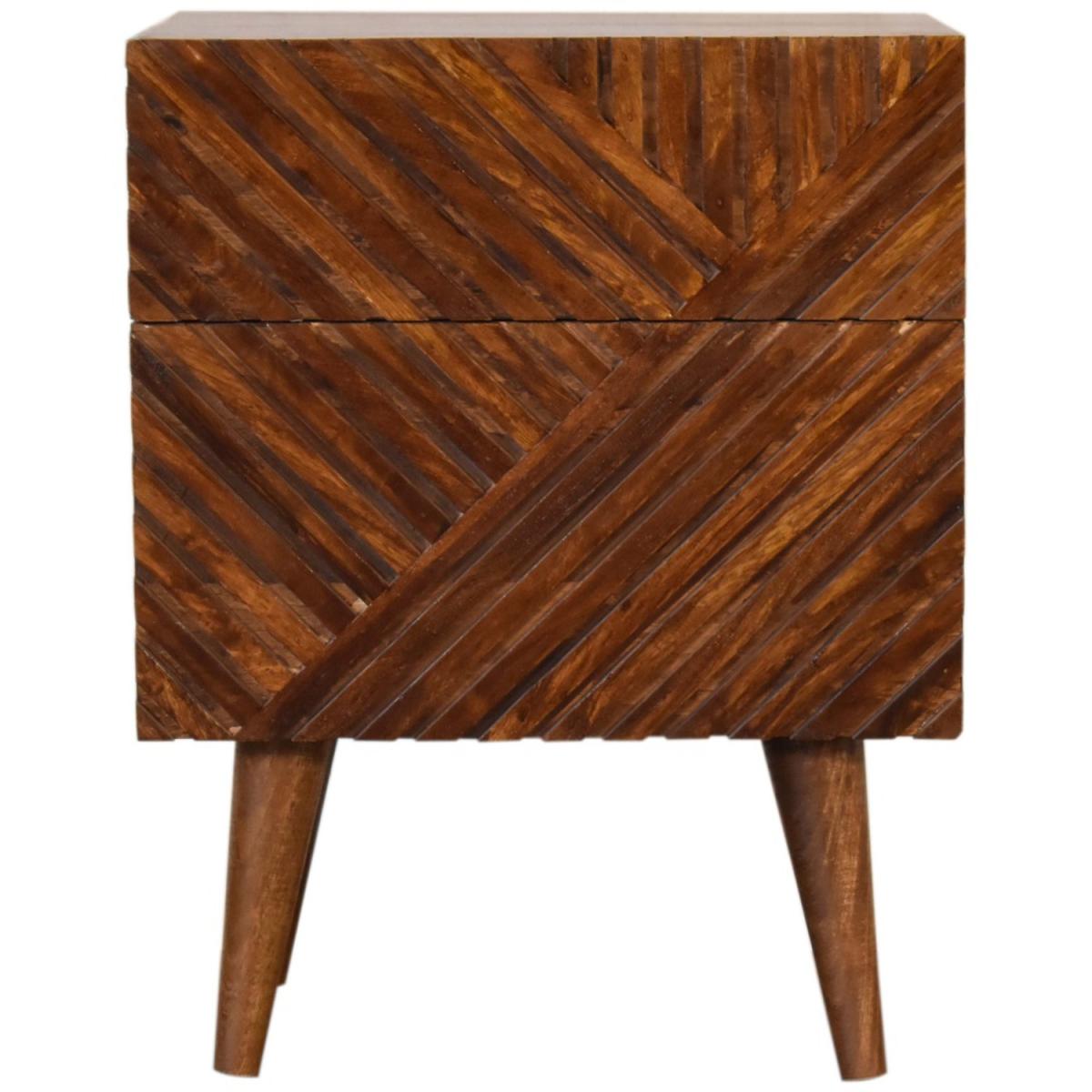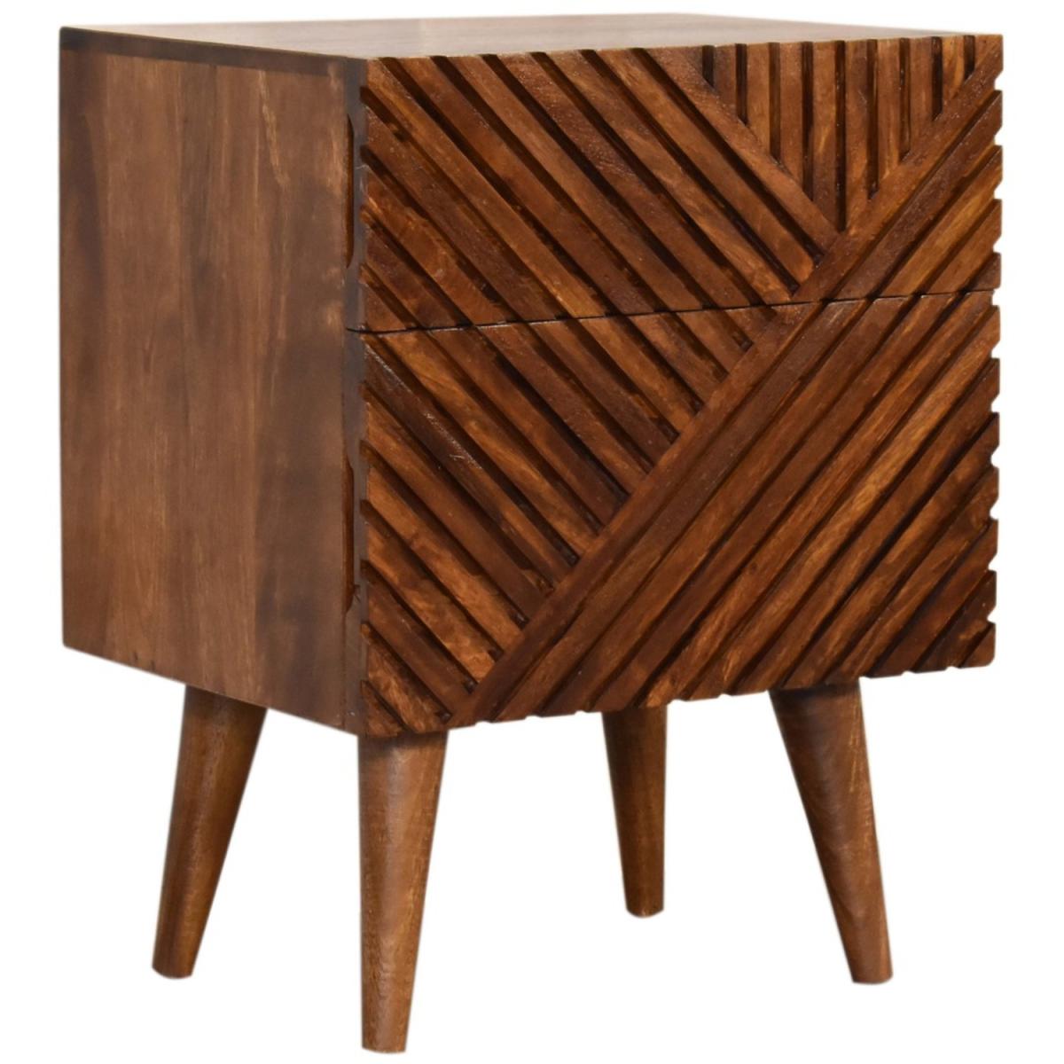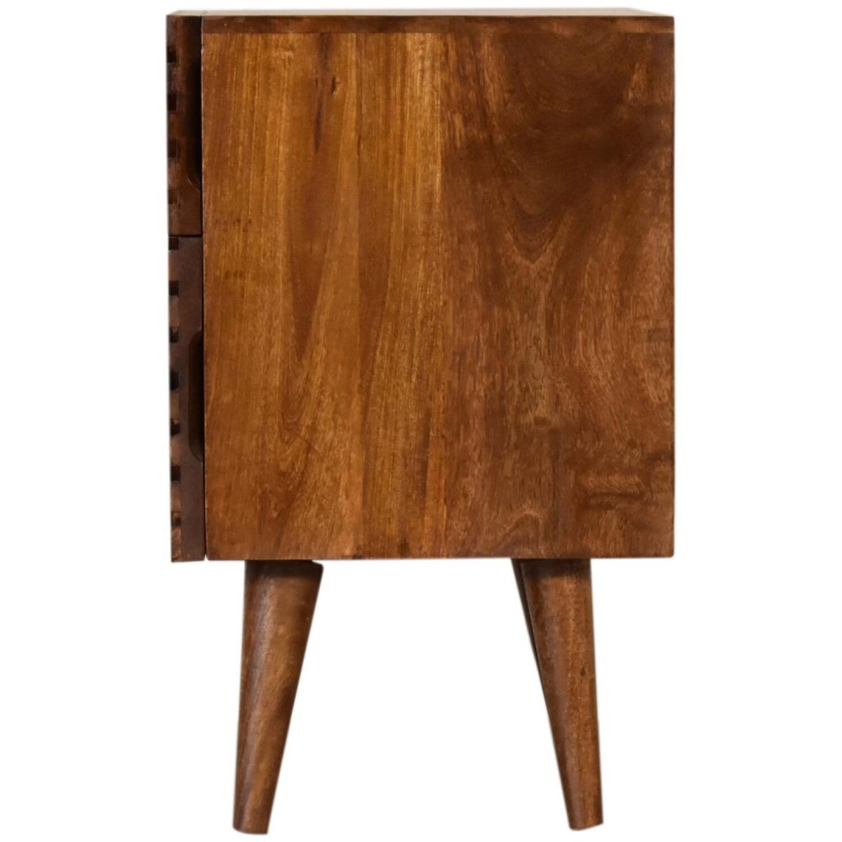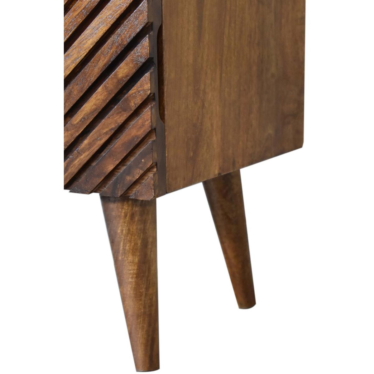 Add this unique solid wood Lille Bedside to your bedroom, constructed from 100 solid mango wood in an oak-ish finish, this piece features a very unique line hand carved design on the drawer fronts with a clean finish meaning easy access into the drawers without any knobs. It features 4 Nordic style legs which compliment the body nicely and gives the entire piece a contemporary look. The perfect addition to the home.
