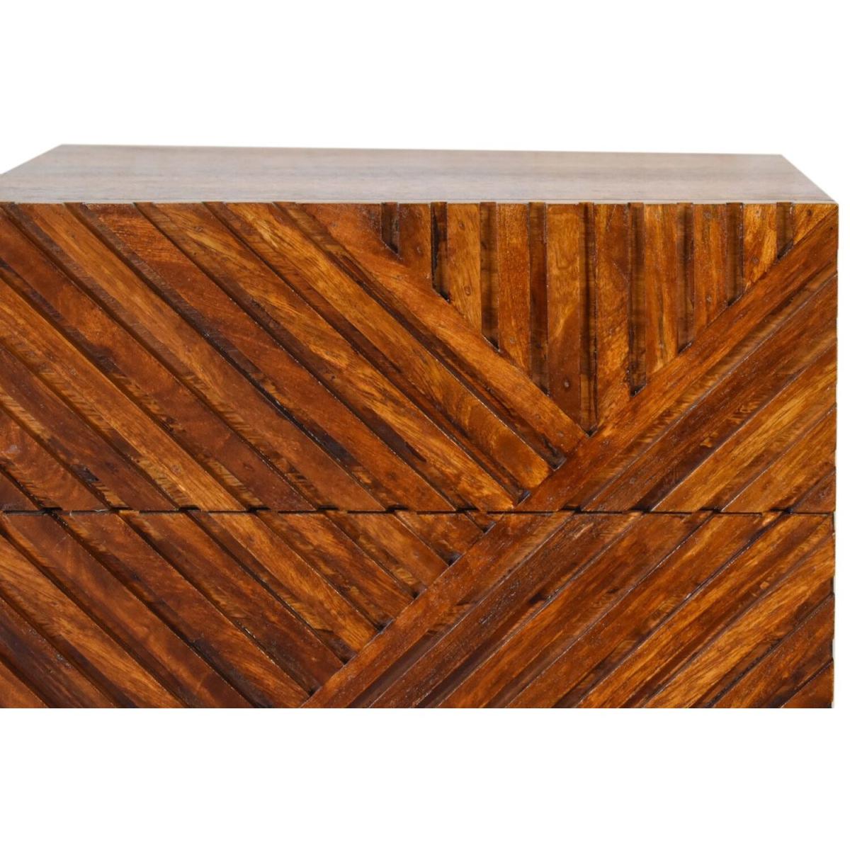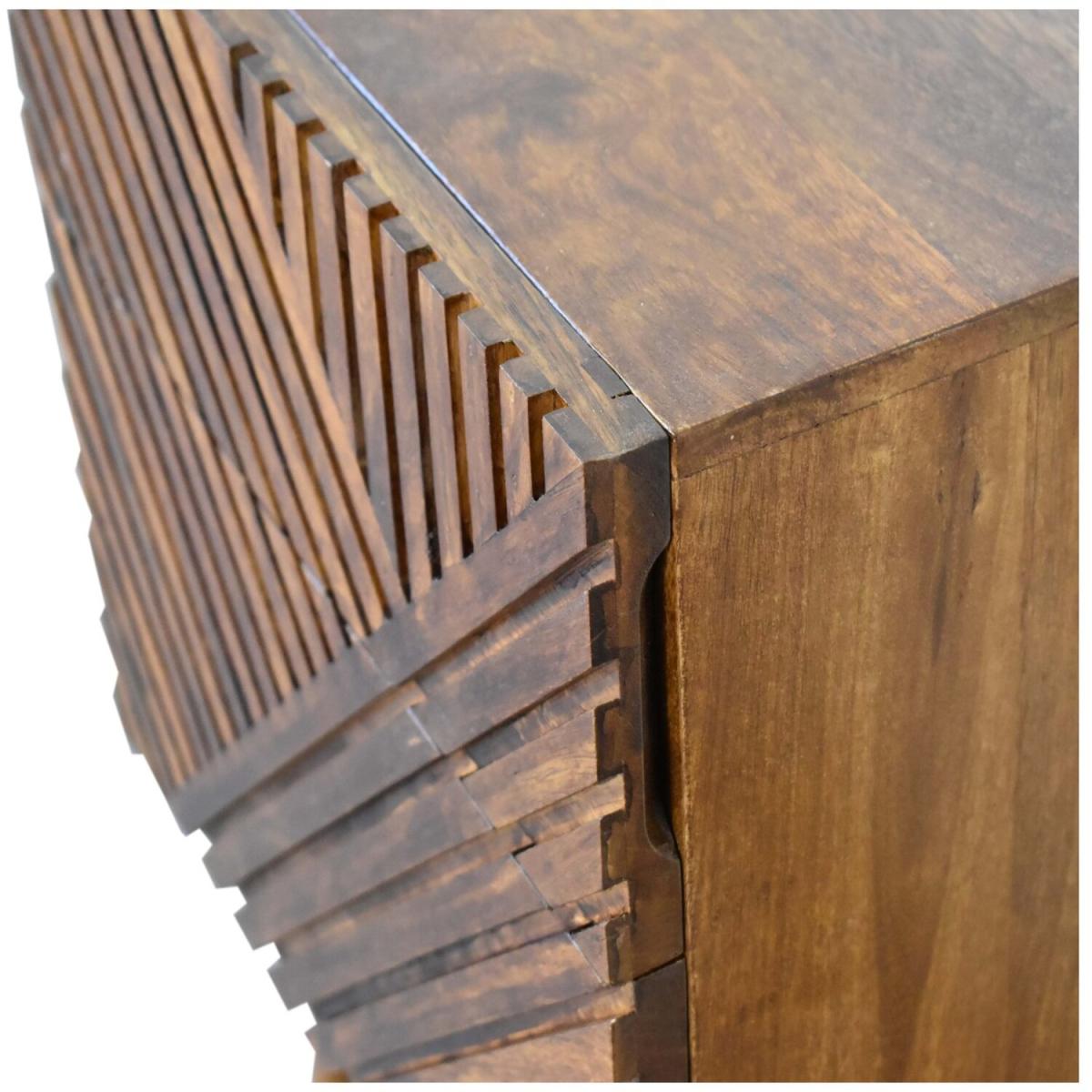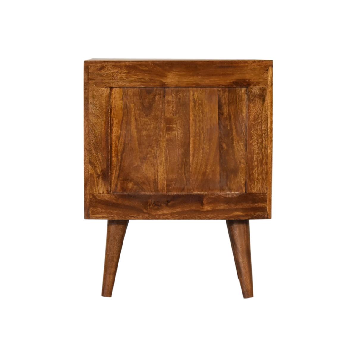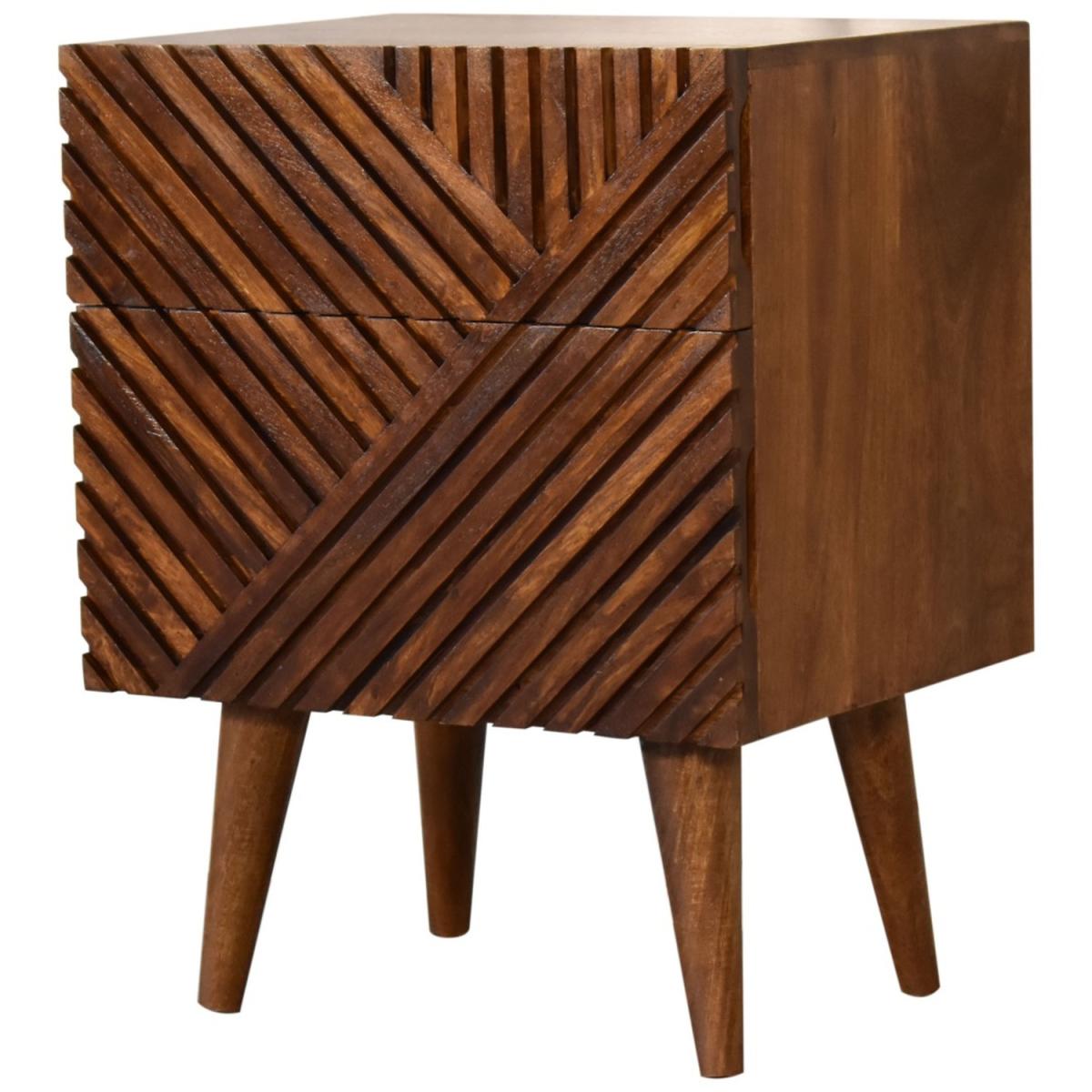 Add this unique solid wood Lille Bedside to your bedroom, constructed from 100 solid mango wood in an oak-ish finish, this piece features a very unique line hand carved design on the drawer fronts with a clean finish meaning easy access into the drawers without any knobs. It features 4 Nordic style legs which compliment the body nicely and gives the entire piece a contemporary look. The perfect addition to the home.