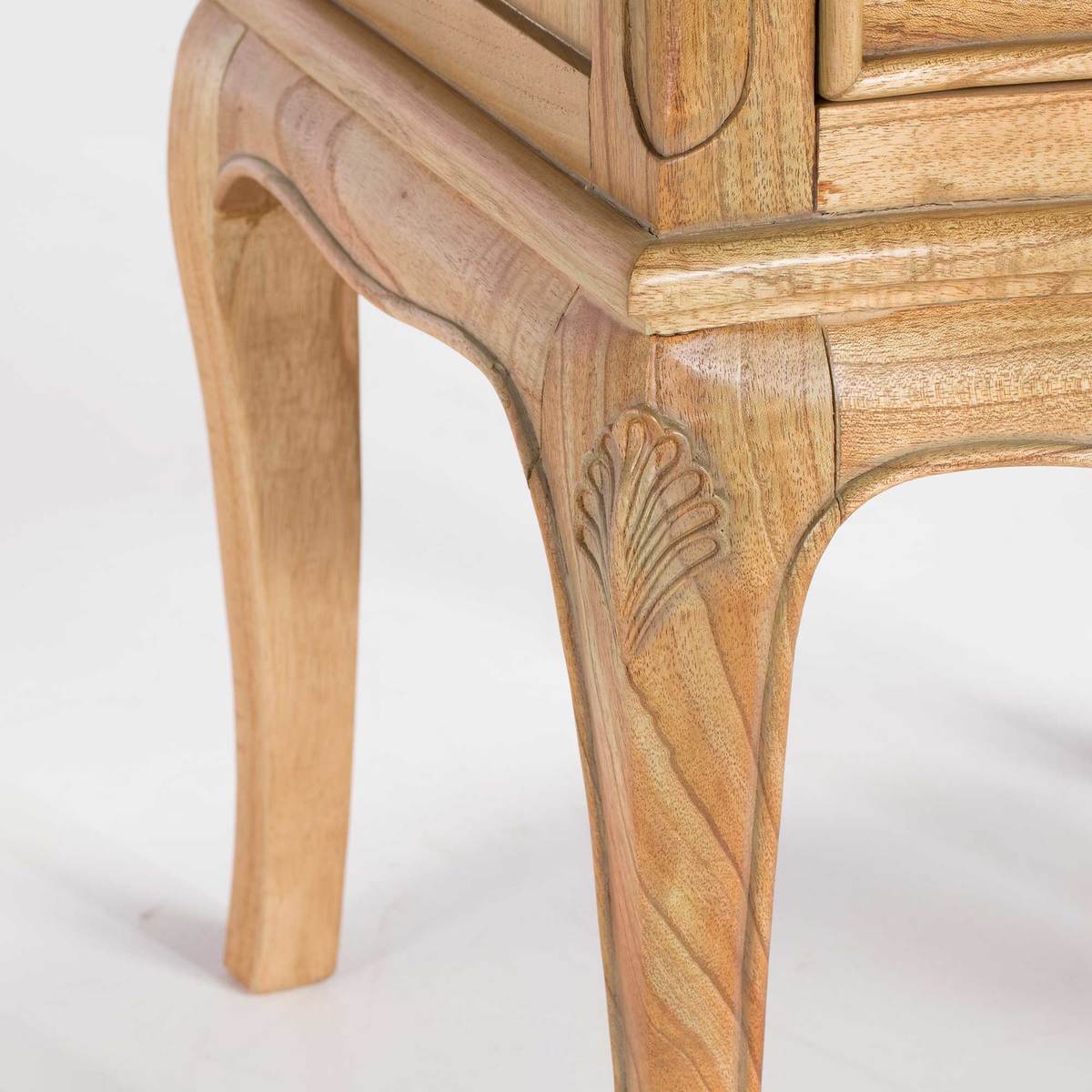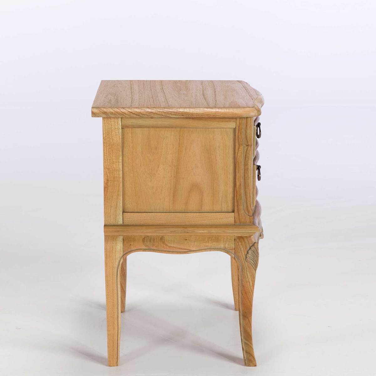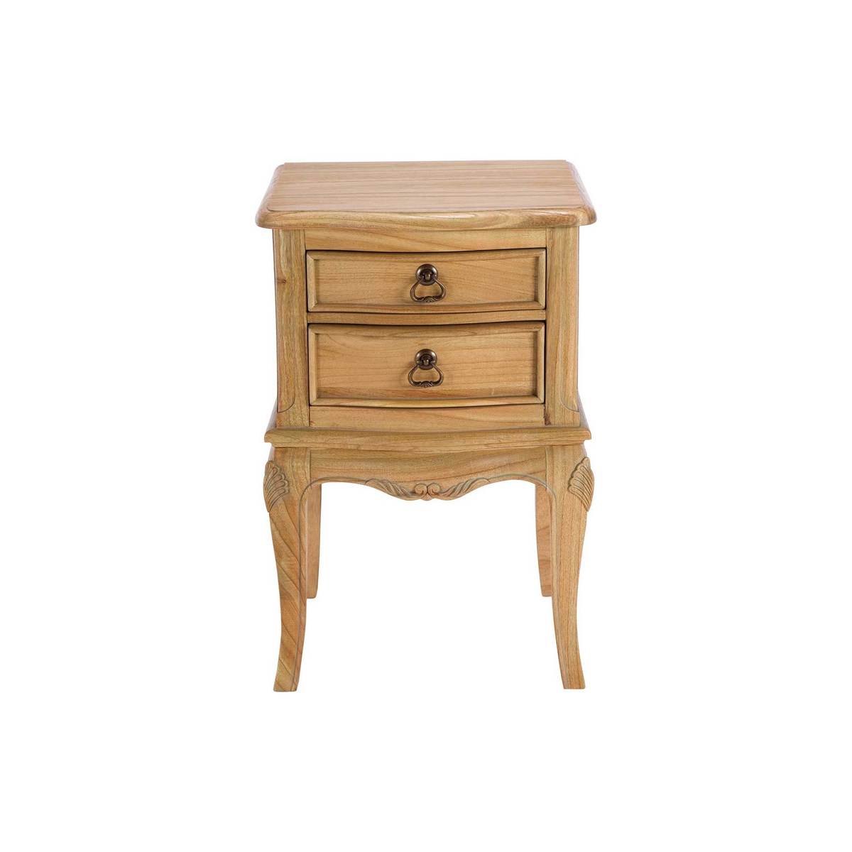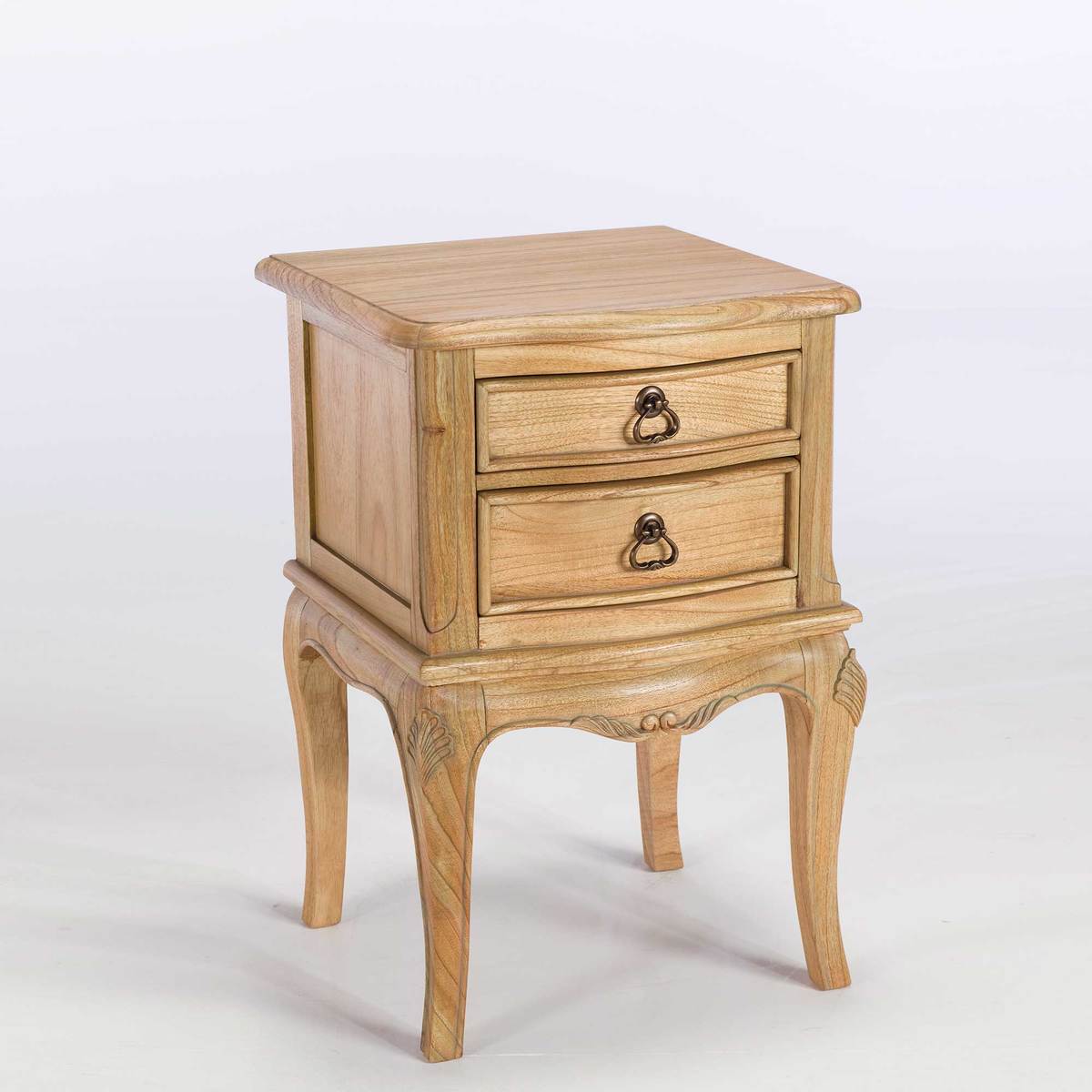 Part of the beautiful Lille range, this two drawer beside table boasts French inspirations with stunning curved legs and traditional swan drop handles. Made primarily from mindi wood with a clear lacquered finish, this bedside encapsulates the hardwoods wonderful natural grain and offers a durable nature.;Its two feature drawers offer various depths giving you ample space to store and organise all your needed essentials.