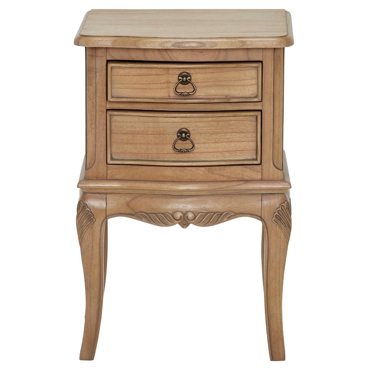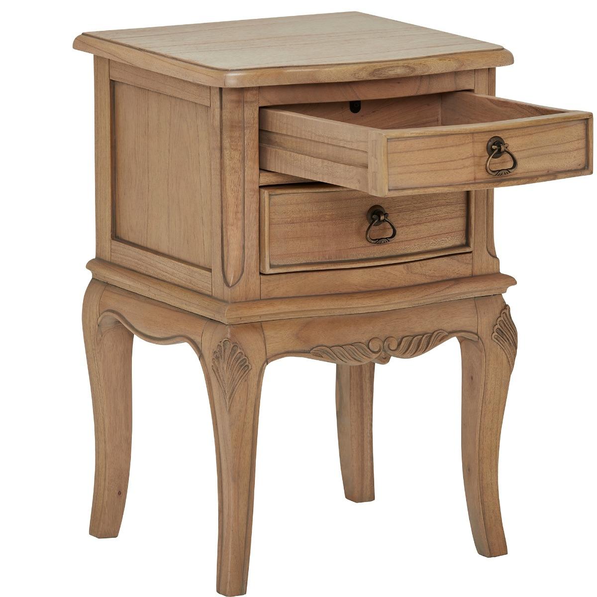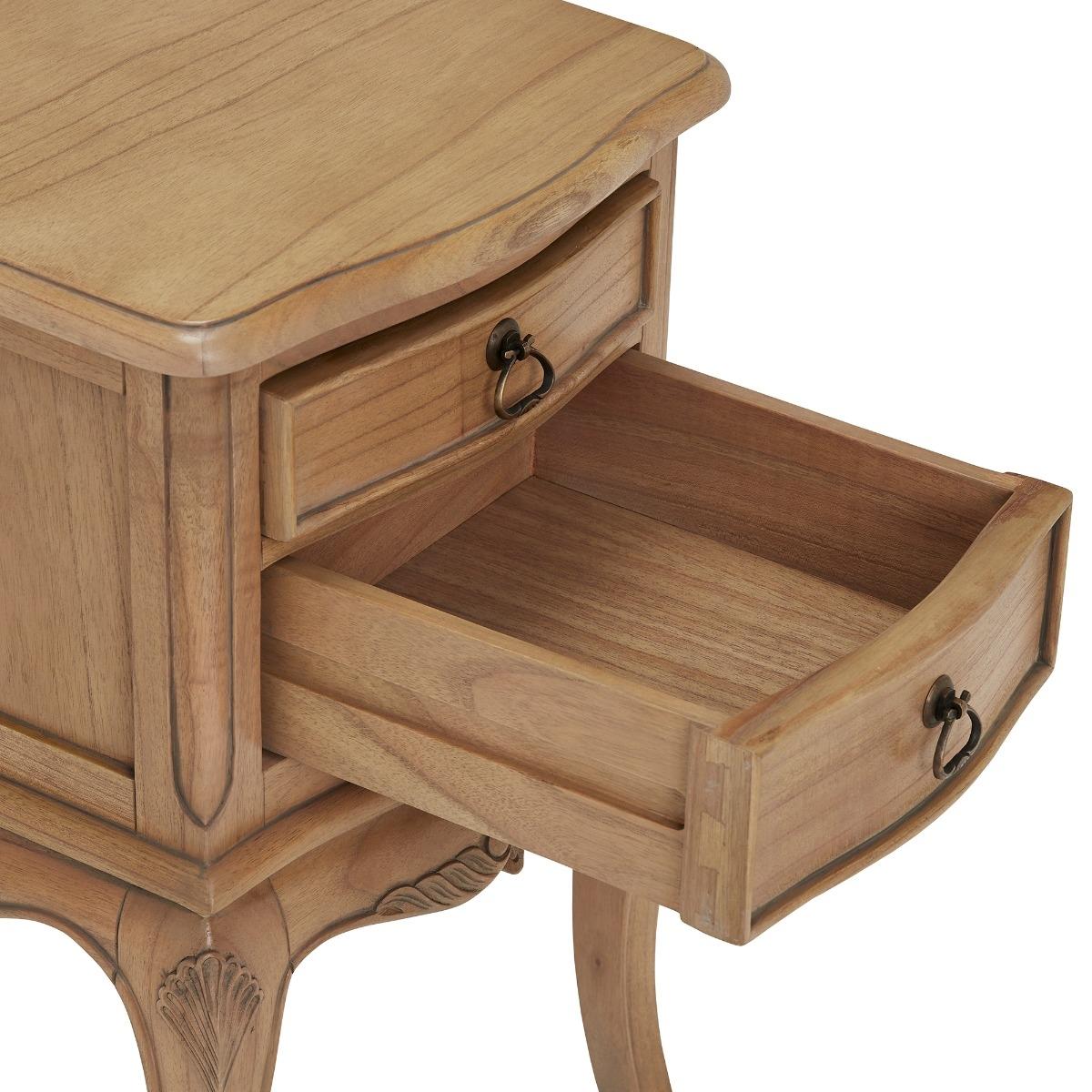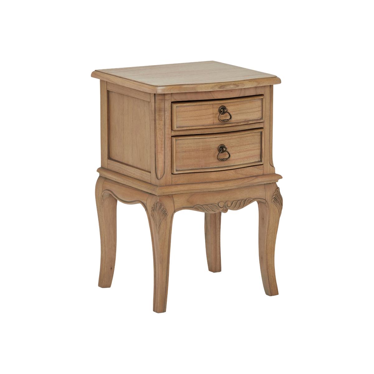 Design. Part of the beautiful Lille range, this two drawer beside table boasts French inspirations with stunning curved legs and traditional swan drop handles. Made primarily from mindi wood with a clear lacquered finish, this bedside encapsulates the hardwoods wonderful natural grain and offers a durable nature. Its two feature drawers offer various depths giving you ample space to store and organise all your needed essentials.