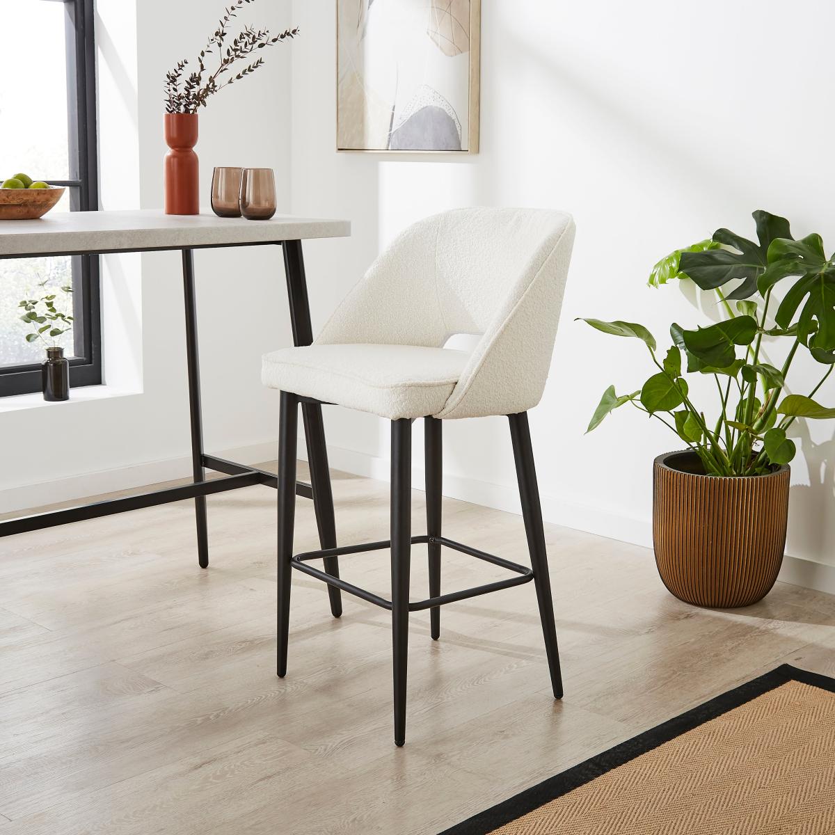 I’m a fan of this ivory bouclé bar stool for its blend of tactile warmth and pared-back silhouette. The soft, woven seat introduces subtle texture against a sleek breakfast bar, while the slim black legs keep the overall look light. It sits comfortably in Scandi-inspired or contemporary kitchens, and the neutral tone means it’ll pair just as well with raw timber counters, marble island tops or even dark metal frames. For styling, line up two or three at your island and add a slim footrest mat underneath to protect your floor. A small, contrast cushion in earthy linen or a muted charcoal works well if you want a dash of colour. Keep spills at bay by wiping the bouclé clean promptly, and rotate your stools regularly to maintain even wear on the upholstery.