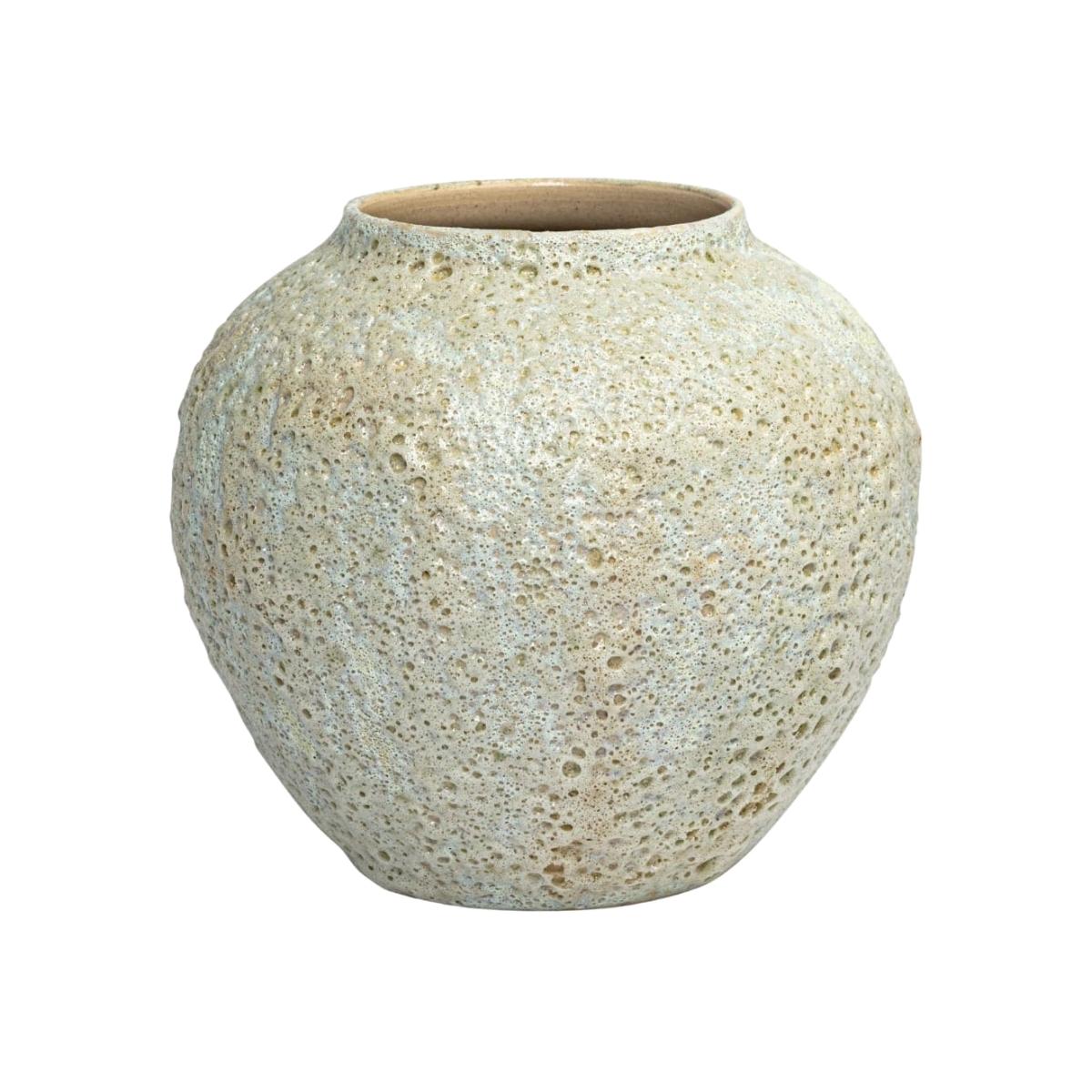 This charming round vase showcases a unique pebbled texture in a creamy white finish. Its organic form and tactile surface make it a versatile piece that complements both modern and rustic decor styles.