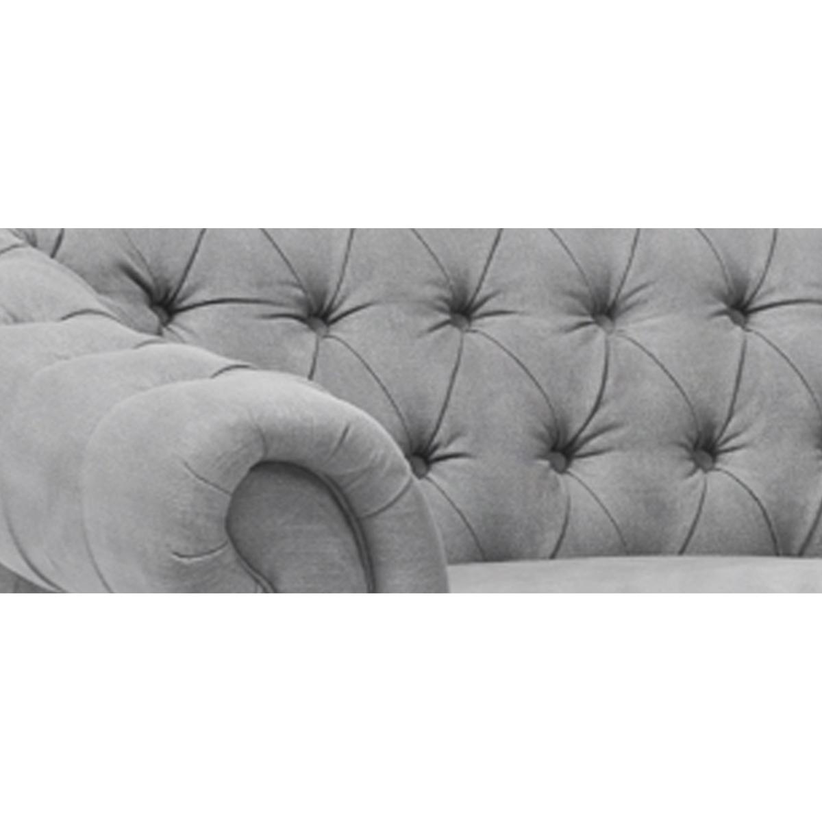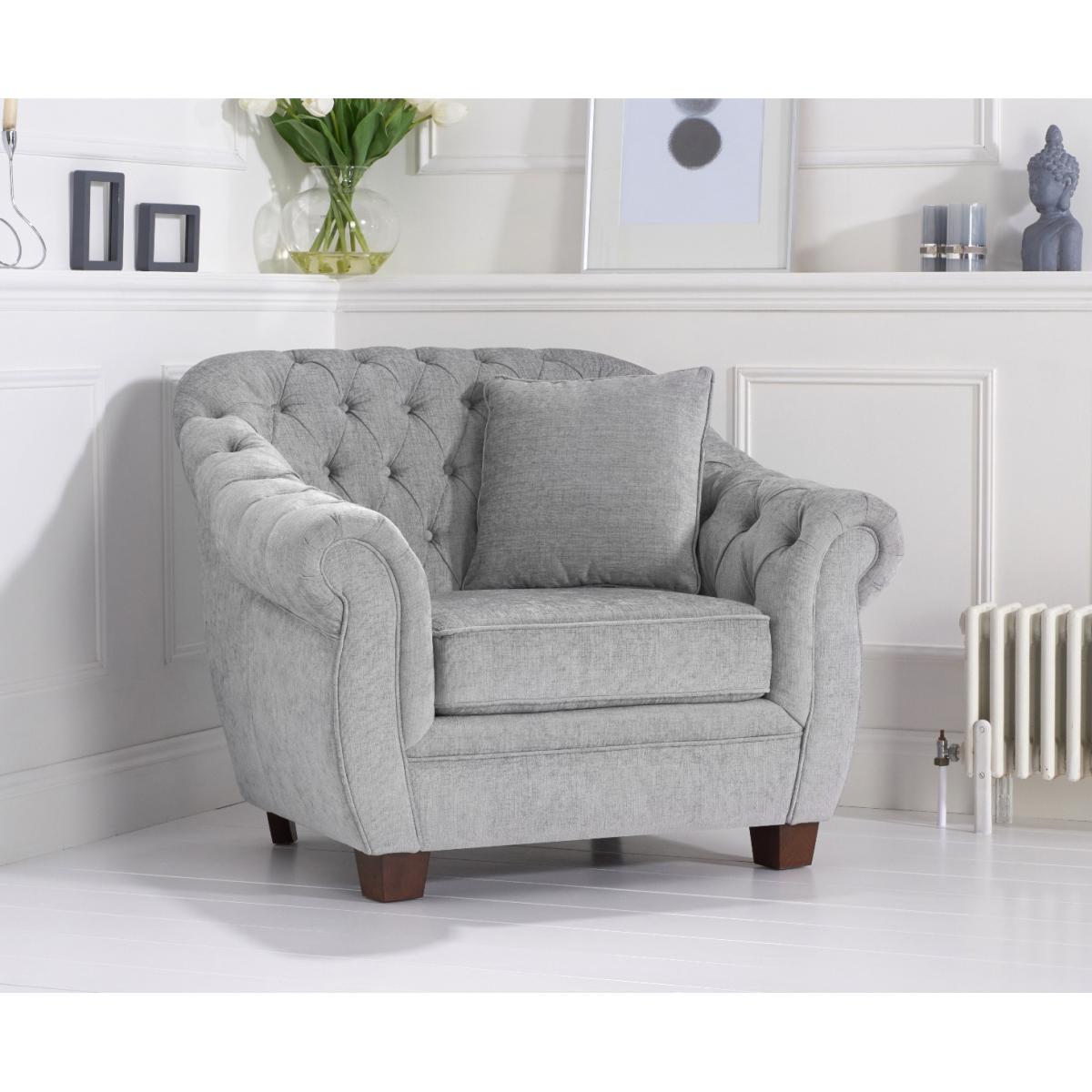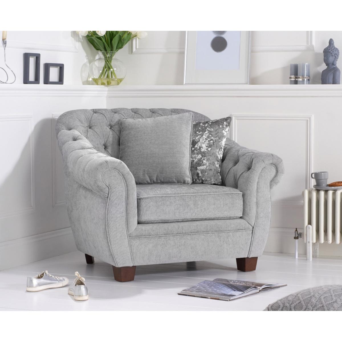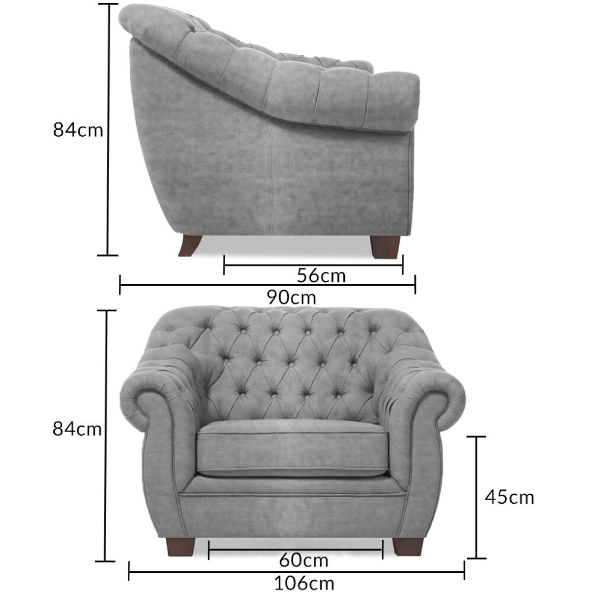 Pure comfort and stylish, classic design combine perfectly in the Lilly Chesterfield Grey Plush Fabric Armchair. Its tactile grey fabric smoothly covers a padded body featuring supportive S-springs and high-rise arms for an inviting and comfortable sit – perfect for curling up into. Plus, Chesterfield-inspired details such as deep-buttoning, scroll arms and short, sturdy legs made from solid ash add a sense of timeless style that will never be out of fashion. The Lilly Chesterfield Grey Plush Fabric Armchair suits being an accent chair as well as being the perfect finishing touch on the Lilly suite. *Comes with one free 40 x 40cm scatter cushion. PLEASE NOTE: The white background photographs depict the Lilly Grey Linen Fabric Armchair,not the Lilly Grey Plush Fabric Armchair. Apart from the fabric type,all dimensions and sizes are otherwise correct.