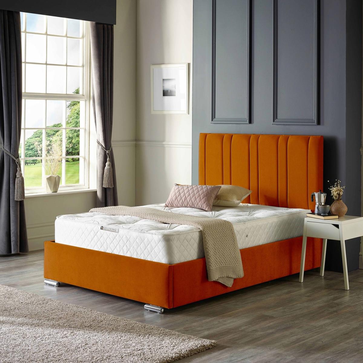 I love the burnt orange bed as it adds a vibrant yet cosy focal point to a bedroom. It works particularly well in contemporary spaces or those with a neutral colour palette, providing a pop of colour that doesn’t feel overwhelming. To style it effectively, consider pairing it with soft, complementary textiles like muted greys or blush tones for a balanced look. Practical tips include keeping bedside accessories minimal - think clean-lined lamps or simple vases - and anchoring it with textured bed linens for added comfort. This bed frame also lends itself nicely to eclectic interiors, where its bold colour can be matched with colourful art or cushions for a personalised, lively touch.