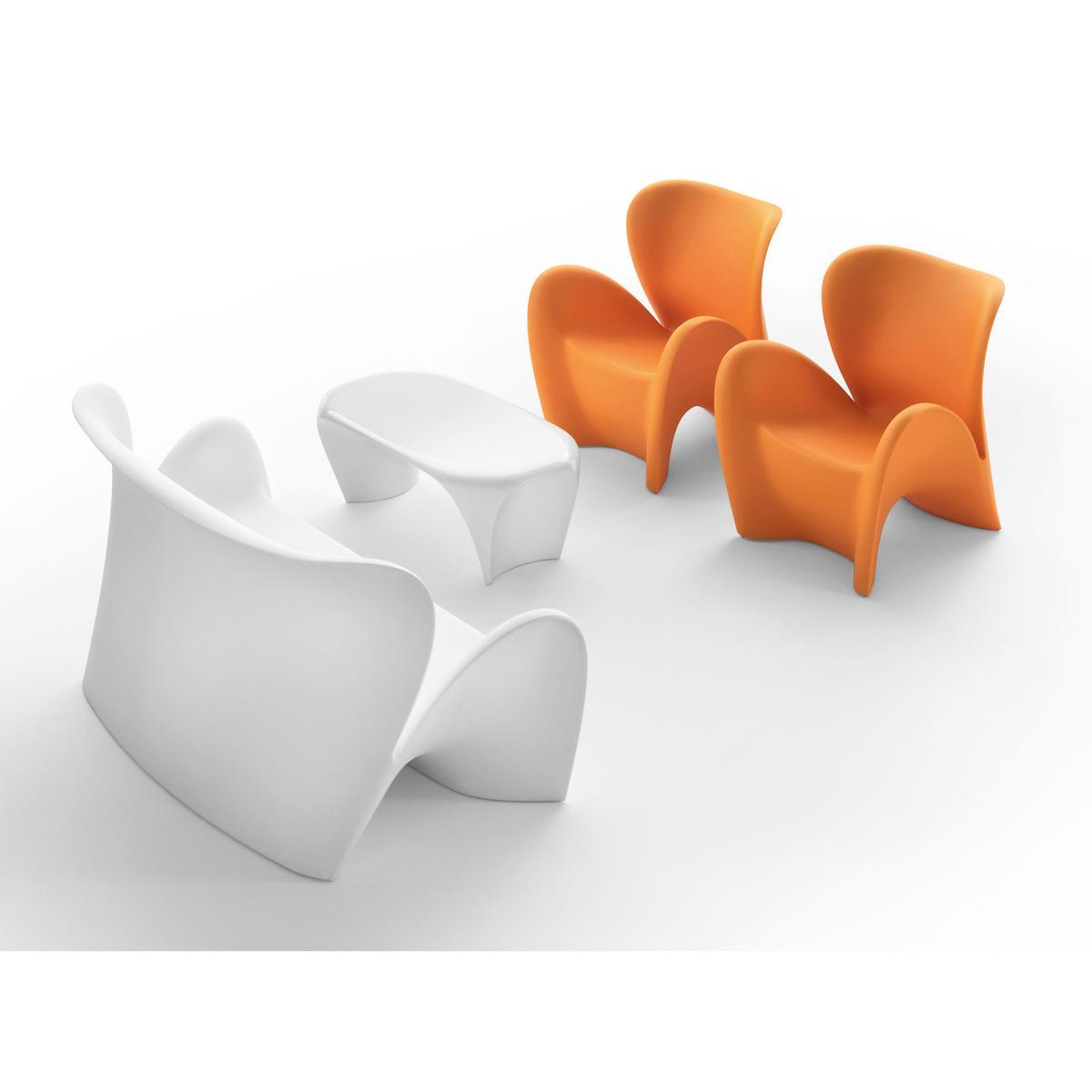 The world of flowers inspired this new line of chairs. Its structure can be described as having dynamic and wavy shapes that have been designed to give life and energy to informal and friendly spaces. Simple figures seem to come to life and to naturally transform themselves into shapes that remind us of plants or flowers, while maintaining their ergonomic features and levels of comfort. The small table completes the collection.