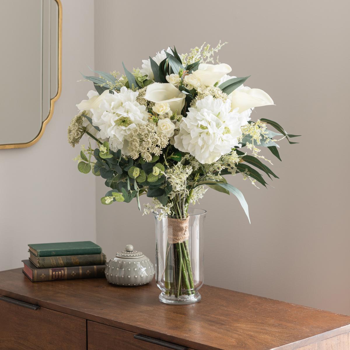 Stunningly arranged, this lily bouquet contains a mix of realistic artificial flowers, including Queen Anne's Lace, Calla Lillies, Roses, Peonies, Eucalyptus and Fern leaves. This bouquet is perfect to display in a vase or to gift. Please note: Vase not included.