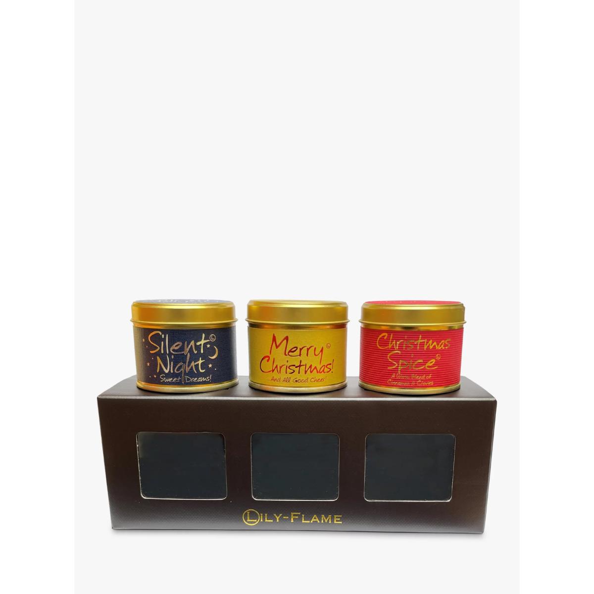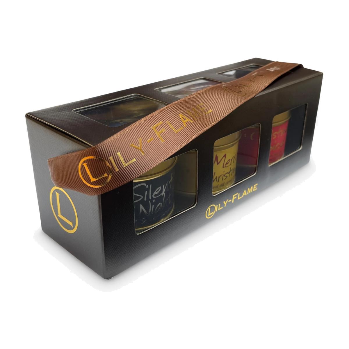 Lily Flame 'Christmas' Mini Tin Gift Set. A beautifully presented gift set of three, warm and festive, fragrant candle tins, a perfect combination to celebrate the magic of the season. The three tins contain: Silent Night; Sweet Dreams! Up close, a very sweet scent. When it's lit, the effect is quite magical; The Autumnal fragrance of still and silent hay fields as night time falls. Merry Christmas; And All Good Cheer….. Could it be any more Christmassy? A sparkly gold and red label wrapped around a delicious Warm Spiced Ginger.- with a Spoonful of Orange Zest that makes you constantly want to come back for another sniff. Christmas Spice; A warm Blend of Cinnamon and Cloves. Our most popular Christmas scent, making any room smell Divinely Festive, this Classic Christmas Scent with its Aromatic Blend of Cinnamon and Cloves make it the Perfect Fragrance for an evening curled up in the Cosy Warmth of Home. If Charles Dickens created a Candle, this would be it! Each Mini Tin Burns for around 20 hours. Like all Lily-Flame products, This Candle is Cruelty Free and Vegan Friendly!