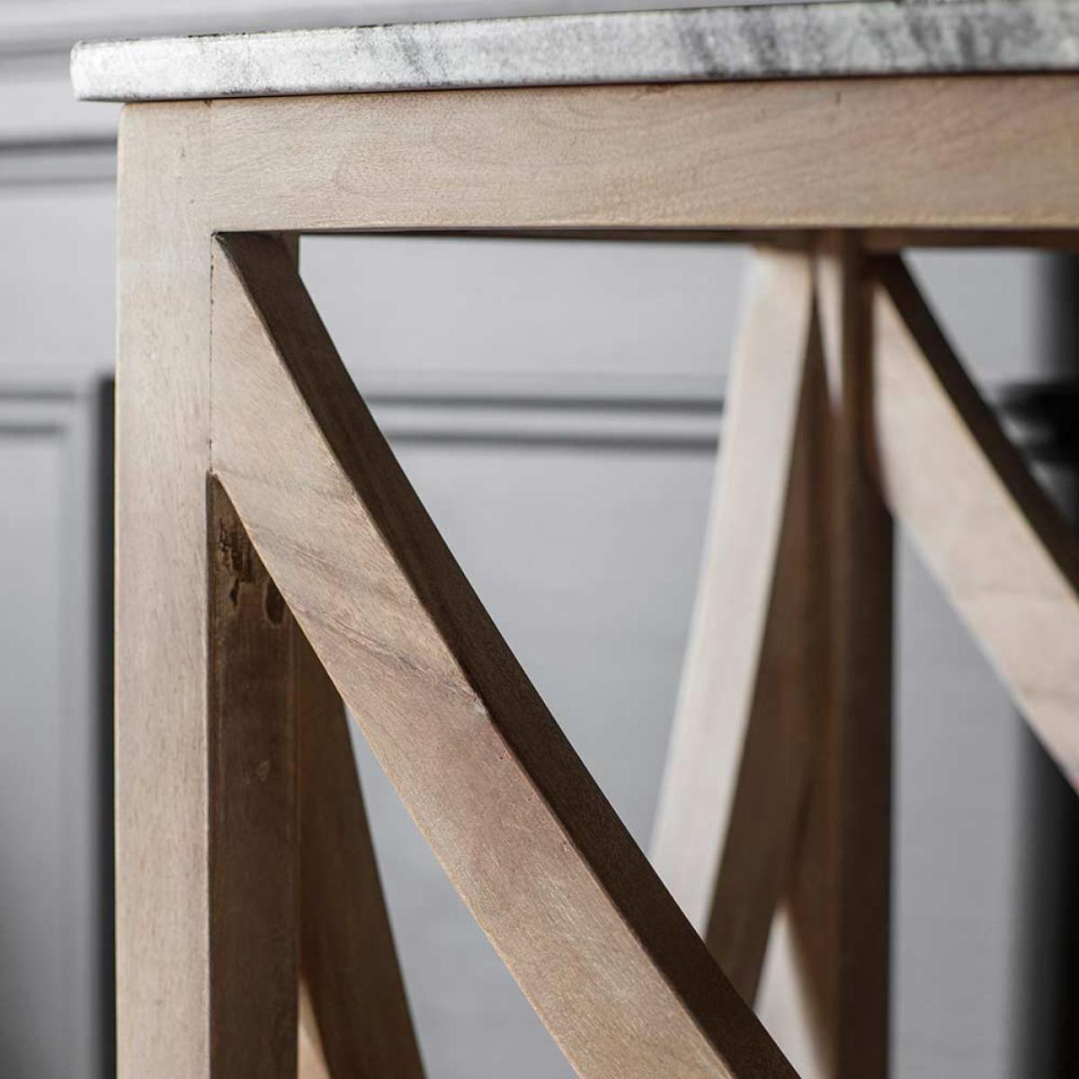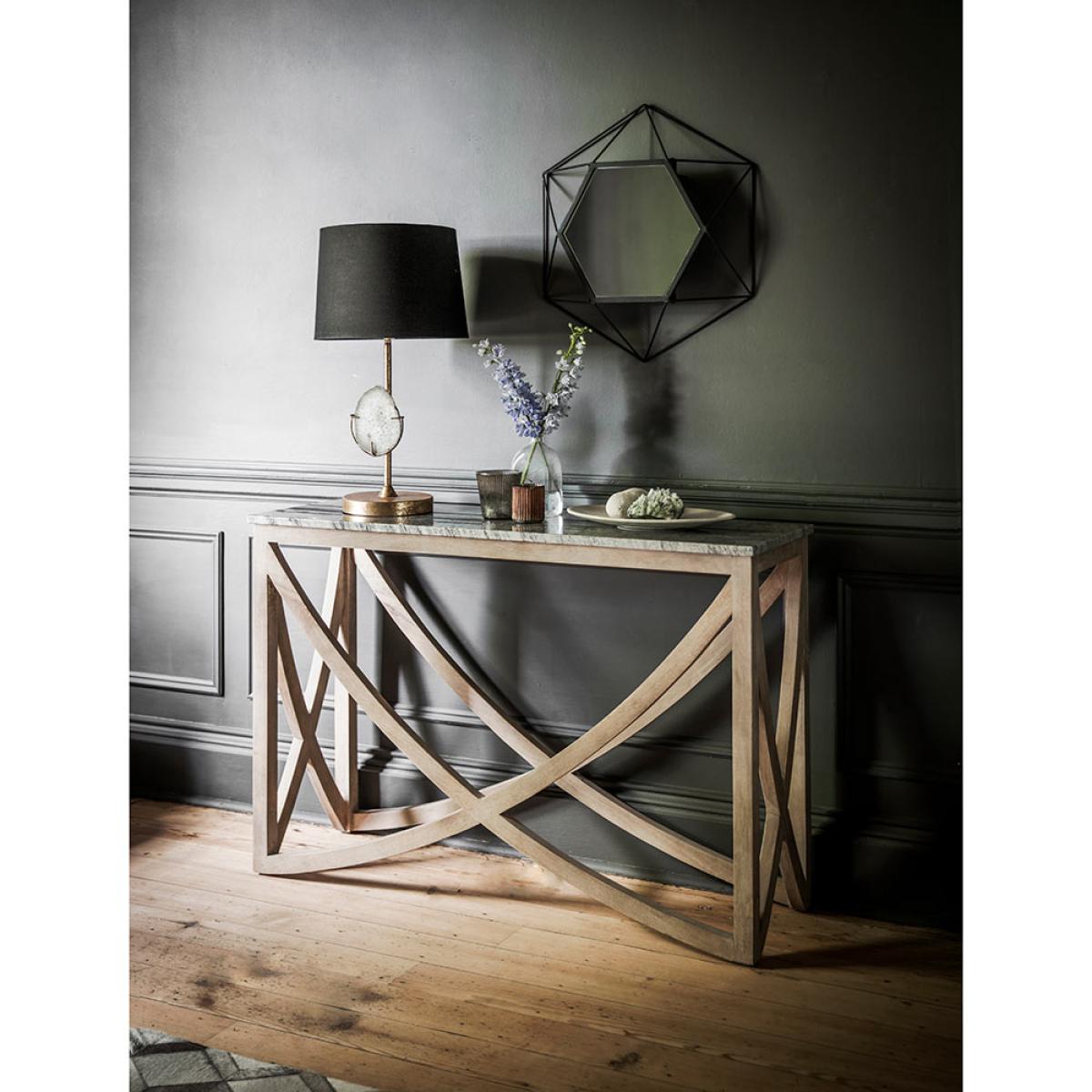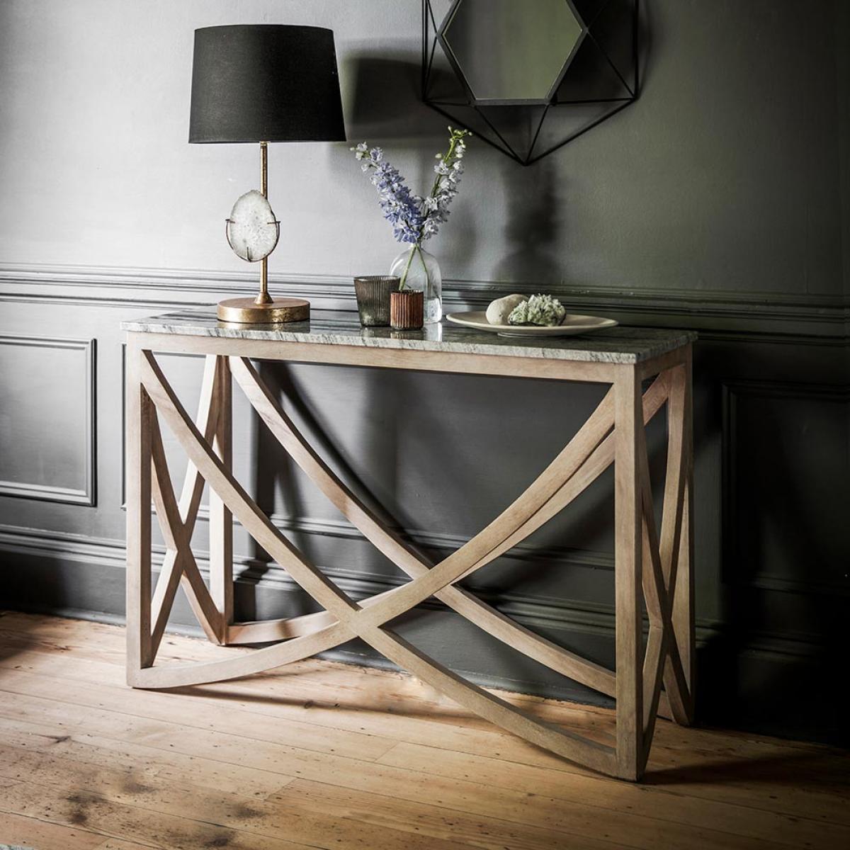 I’m really taken with this marble-topped console - the pale stone and open-frame wood base sit comfortably in both modern farmhouse and Scandi-inspired schemes. The neutral tones mean it’ll complement soft greys or deeper, moody paint without overwhelming your hallway or living area. To style it, keep the top clear of clutter: a slim table lamp at one end, a stack of slim coffee-table books and a small plant or vase at the other works well. Hang a round or geometric mirror above to give it presence, and leave the floor underneath unencumbered to maximise that airy feel.