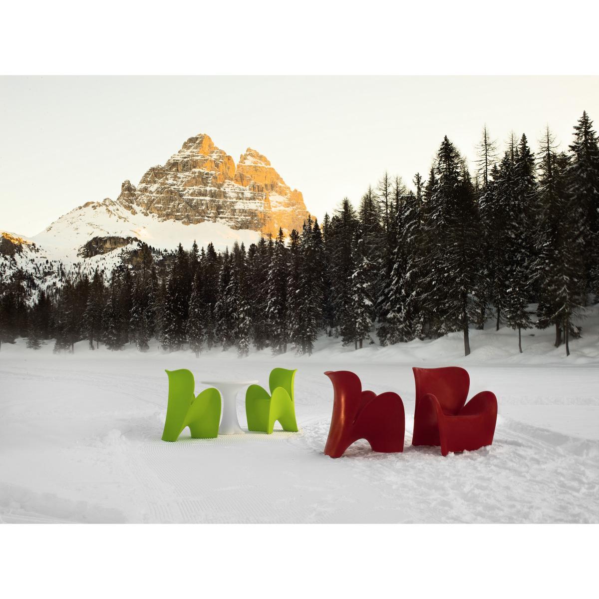 The world of flowers inspired this new line of chairs. Its structure can be described as having dynamic and wavy shapes that have been designed to give life and energy to informal and friendly spaces. Simple figures seem to come to life and to naturally transform themselves into shapes that remind us of plants or flowers, while maintaining their ergonomic features and levels of comfort. The small table completes the collection.