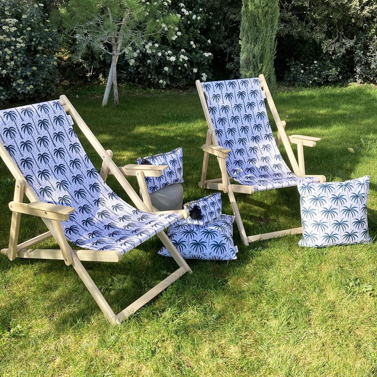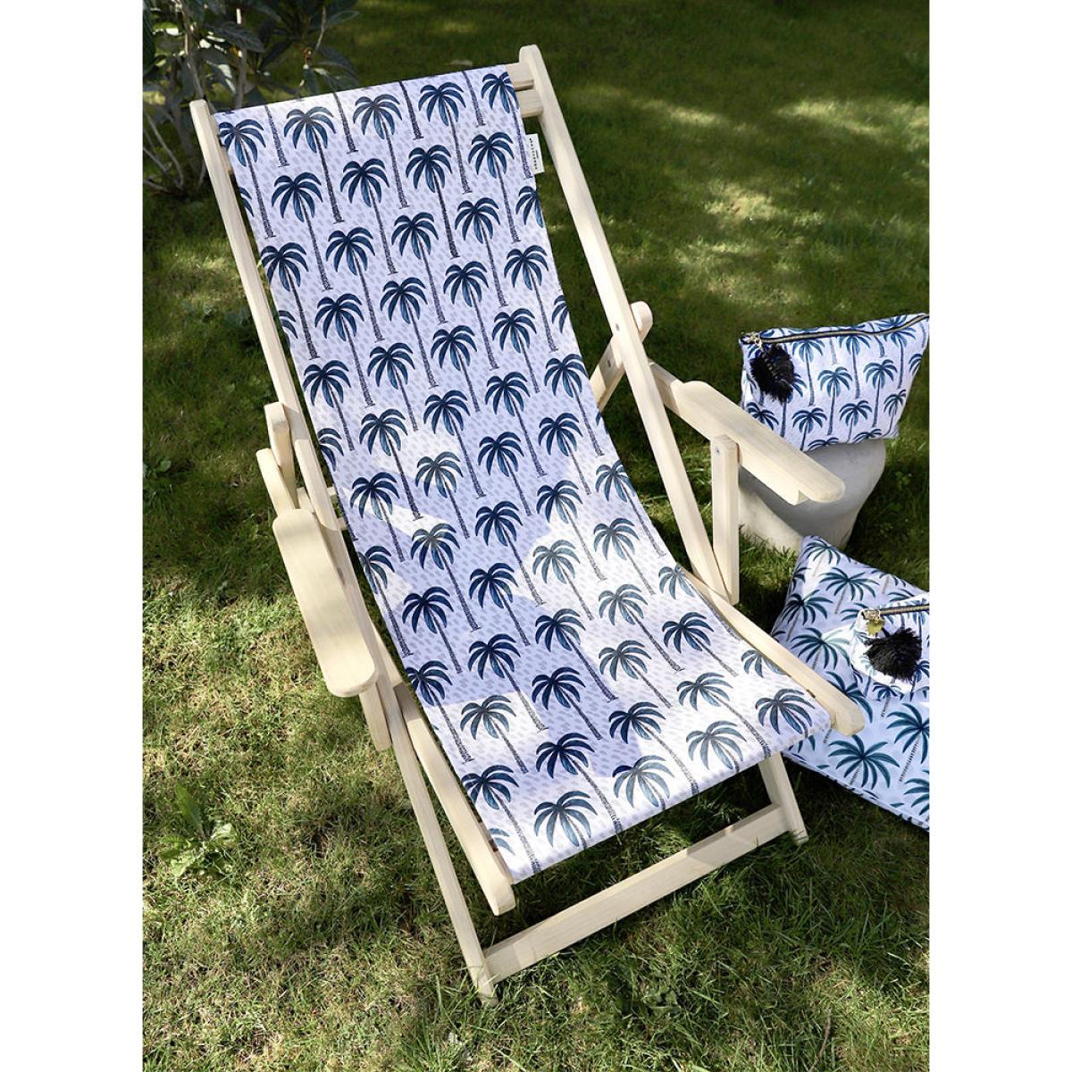 Designed and made in France with certified wood and available in a multitude of trendy prints, Pôdevache deckchairs have it all! The water-repellent, UV-resistant canvas is removable: it’s easy to machine-wash. The multi-position backrest adapts to what you’re doing (a nap or reading) and the deckchair folds up for easy storage. Affirm your personality even in your gardens and terraces with these deckchairs with their strong, offbeat visual identity. The Pôdevache brand is committed to keeping its production in France in its workshops located in Valence in the Drôme region. Each motif is designed in its Valence studio. Give in to the temptation of a relaxing break with the Lima deckchair. Its palm tree motif transports us to a tropical, relaxing place. The warm colours take us to another place! PLEASE NOTE: Never fold up and store the deckchair with a damp canvas. Like all wooden furniture, this deckchair requires regular care to maintain its beautiful appearance.